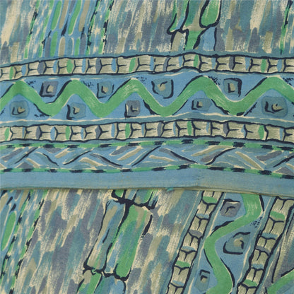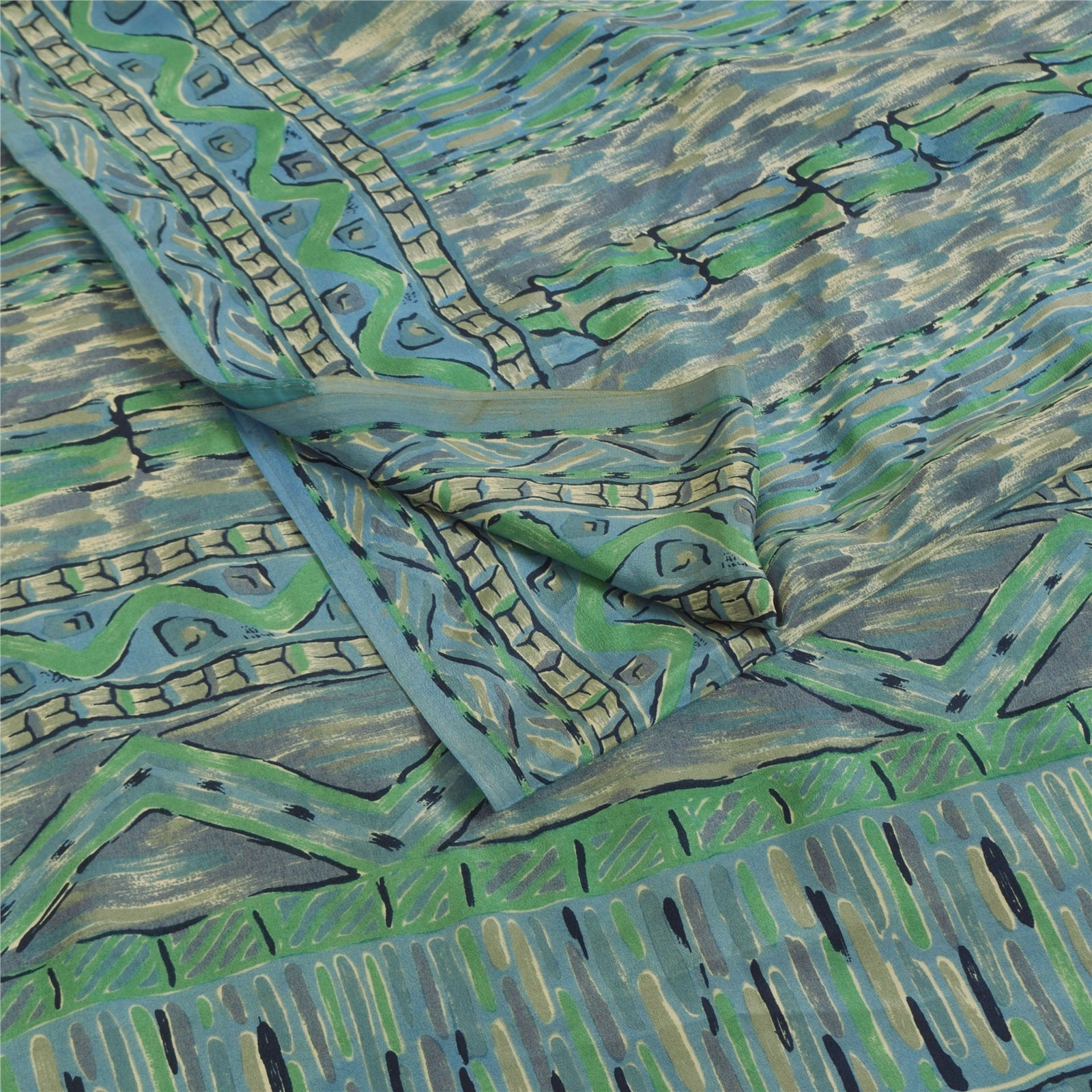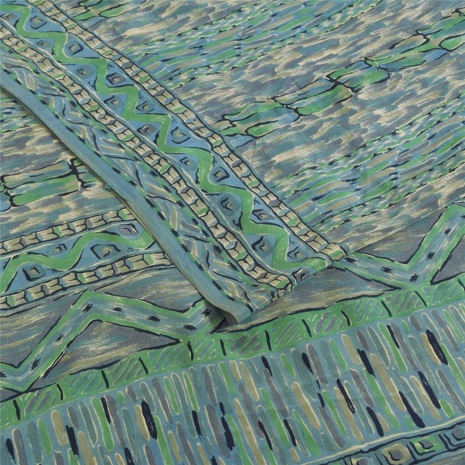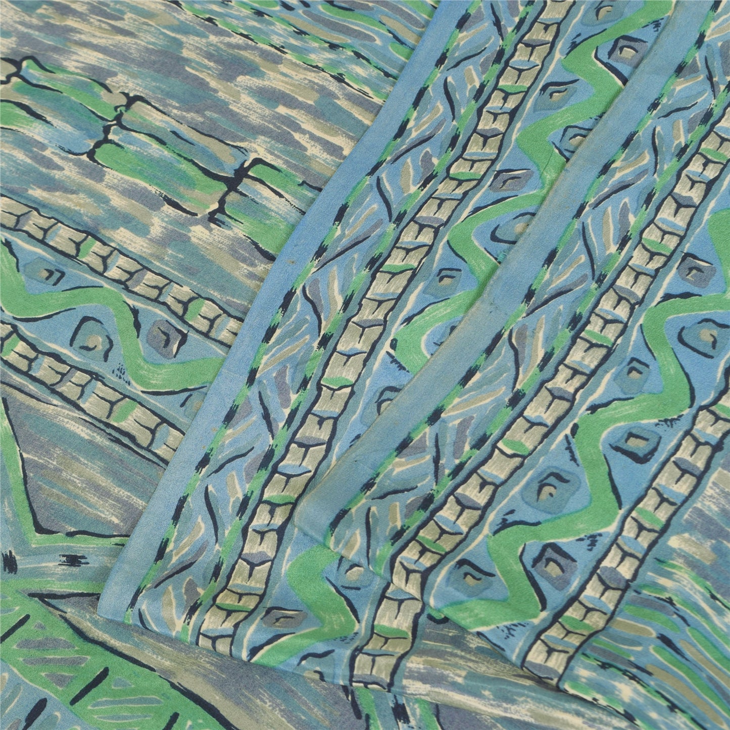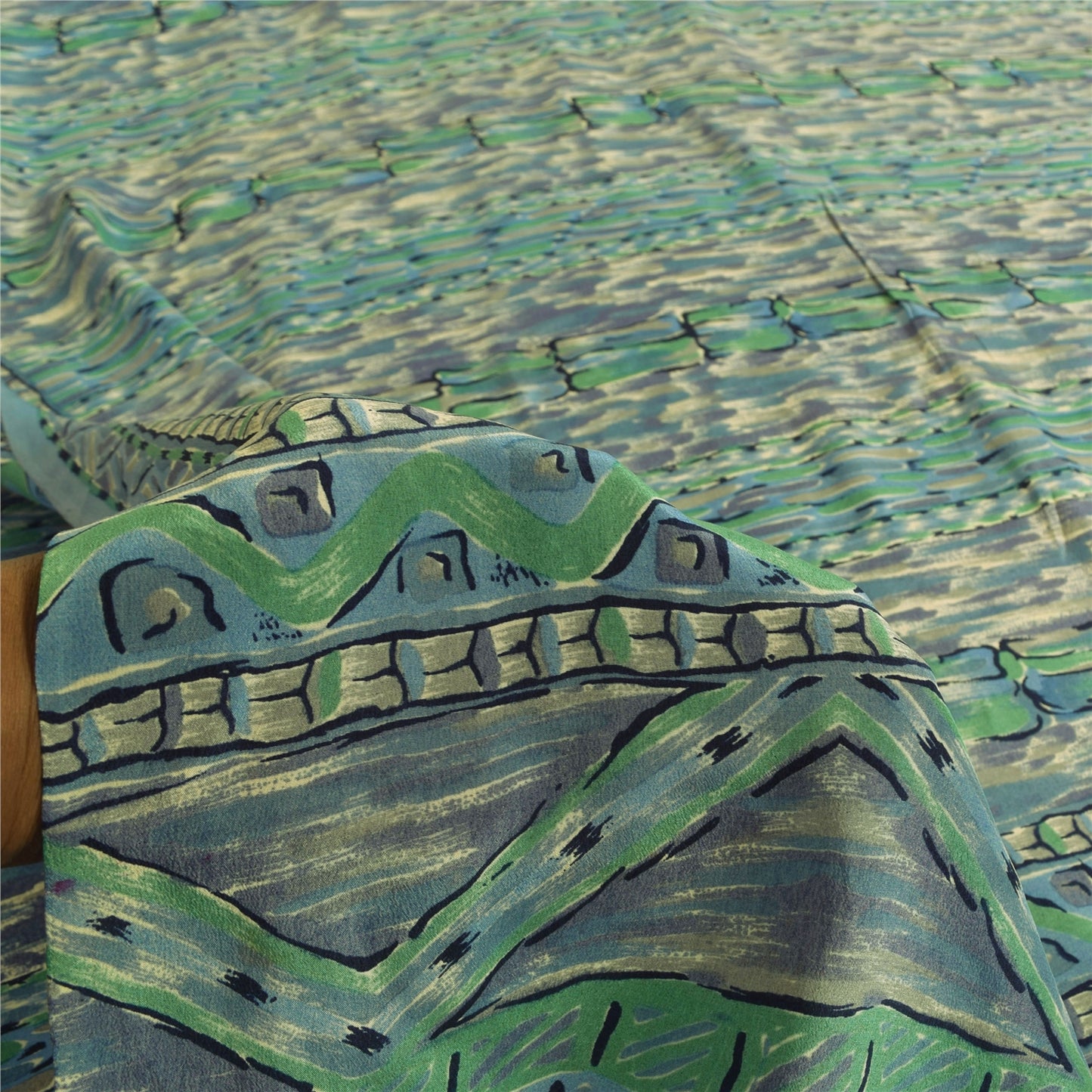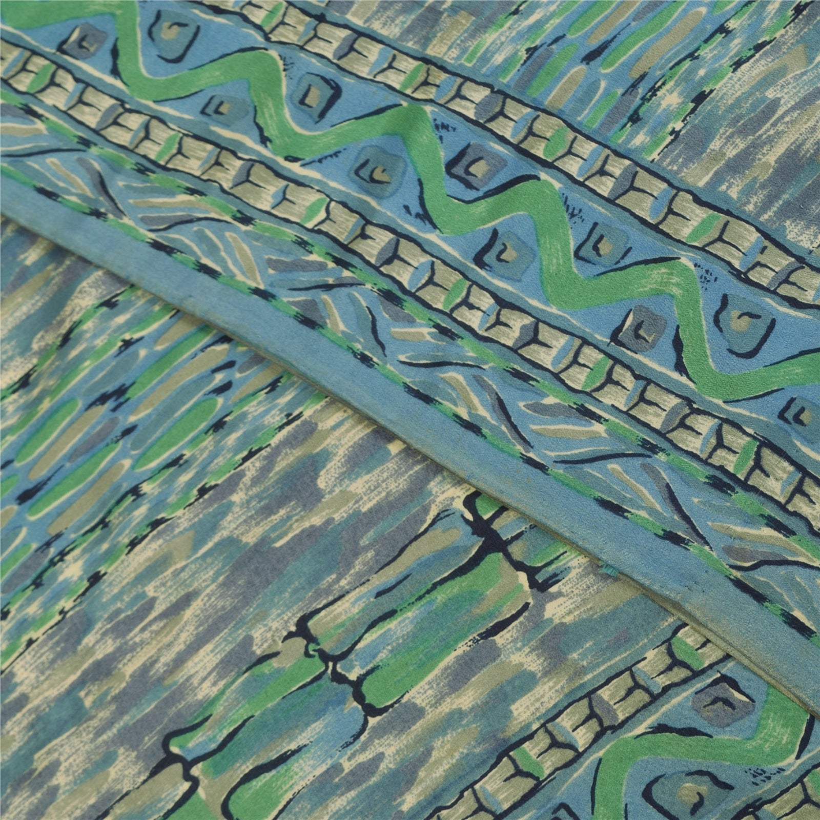 Sanskriti Vintage Sarees Green & Blue Pure Crepe Printed Sari 6+yd Craft Fabric