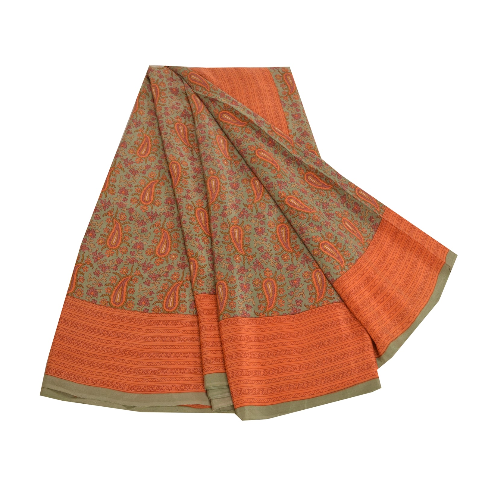 Sanskriti Vintage Sarees Green/Orange Pure Crepe Silk Printed Sari Craft Sustainable Fabric