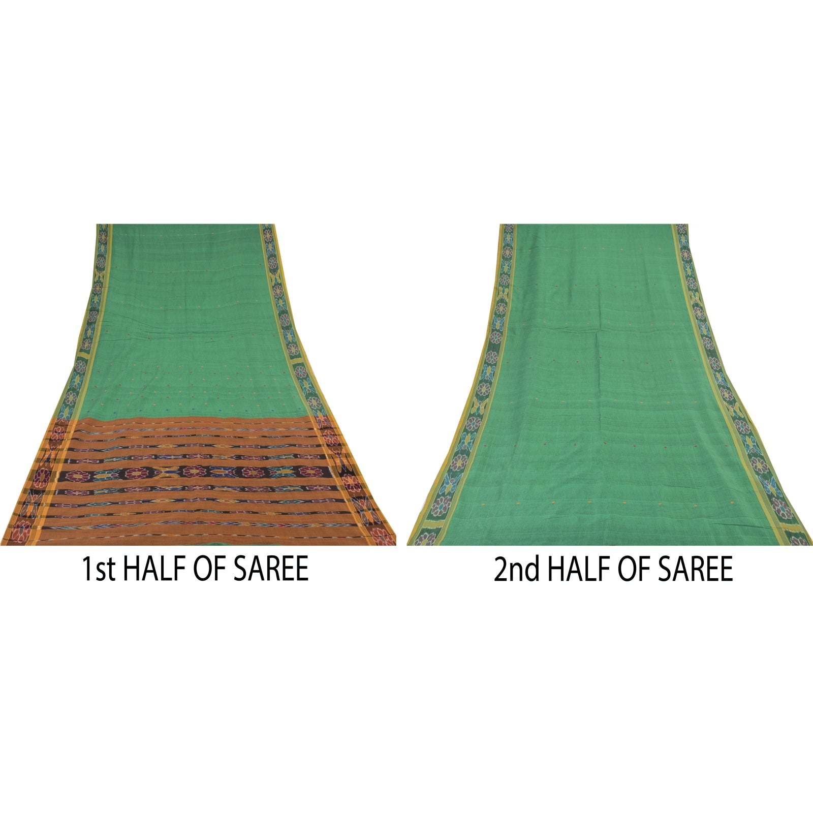 THE ITEM COLOR OR SHADE MAY BE DARKER OR LIGHTER THAN THE PICTURE. Attractive green colored pure cotton ikat hand woven odisha sari. Pallu & Border has floral design with ikat woven work. Thread work in center part of saree.. This unique vintage saree can be used for various crafting ideas even if you don't want to use it as a sari. Design a dress, use it as a as window dressing, upholstery, sarongs, throw, dress making and table linen much more. Let your creative juices flow and use this decorated Sustainable Fabric in multiple fashion. Shipping Note: 'International buyers please note: Import duties, taxes, and charges are not included in the item price or postage cost. These charges are the buyer's responsibility. Please check with your country's customs office to determine what these additional costs will be prior to bidding or buying. Buyer will pay custom duty/tax. It is calculated and charged differently by every country. As a seller I do not have any control over it. VAT or sales tax is calculated by the platform at the time of checkout. Customs charge is payable at the time of delivery.' PCS-6291