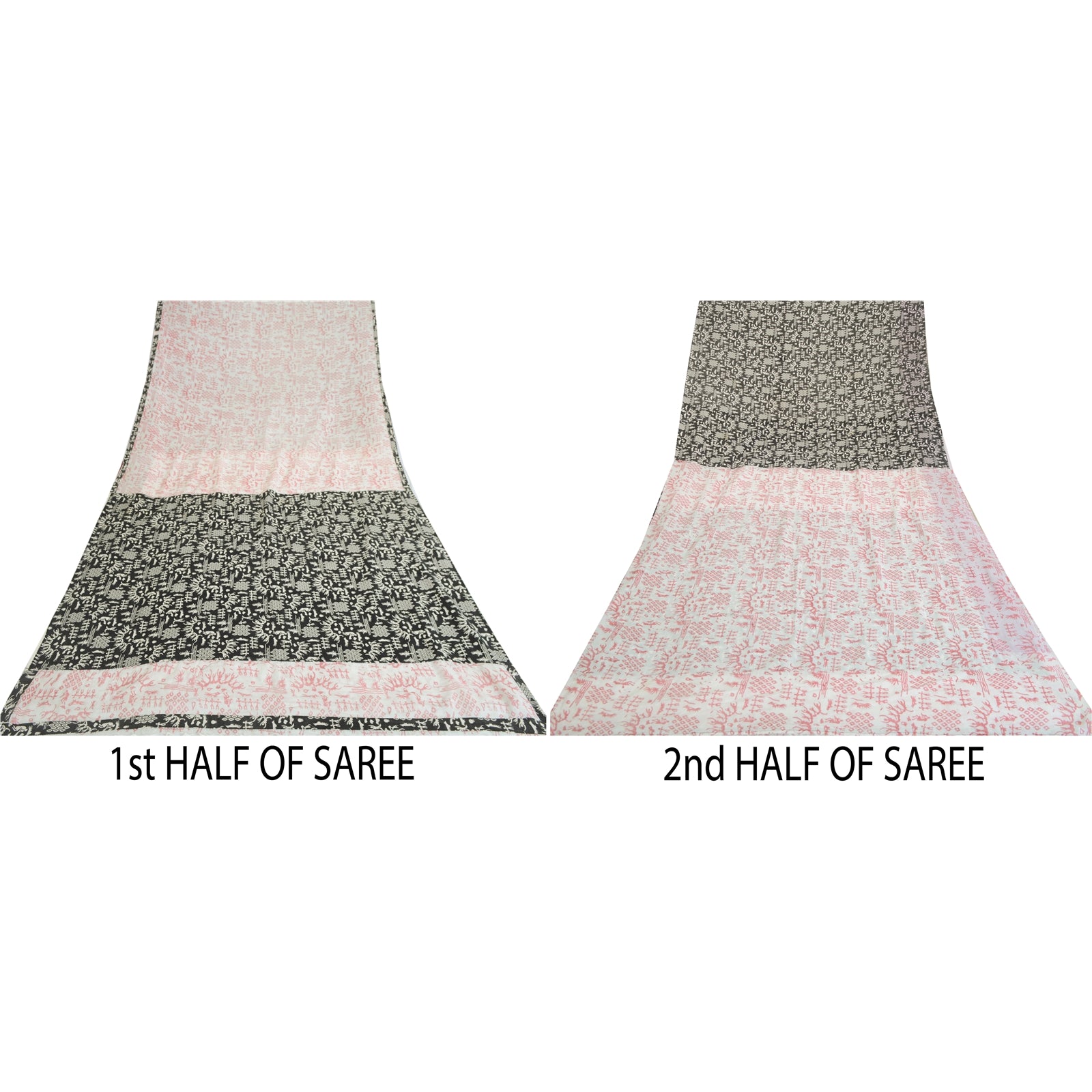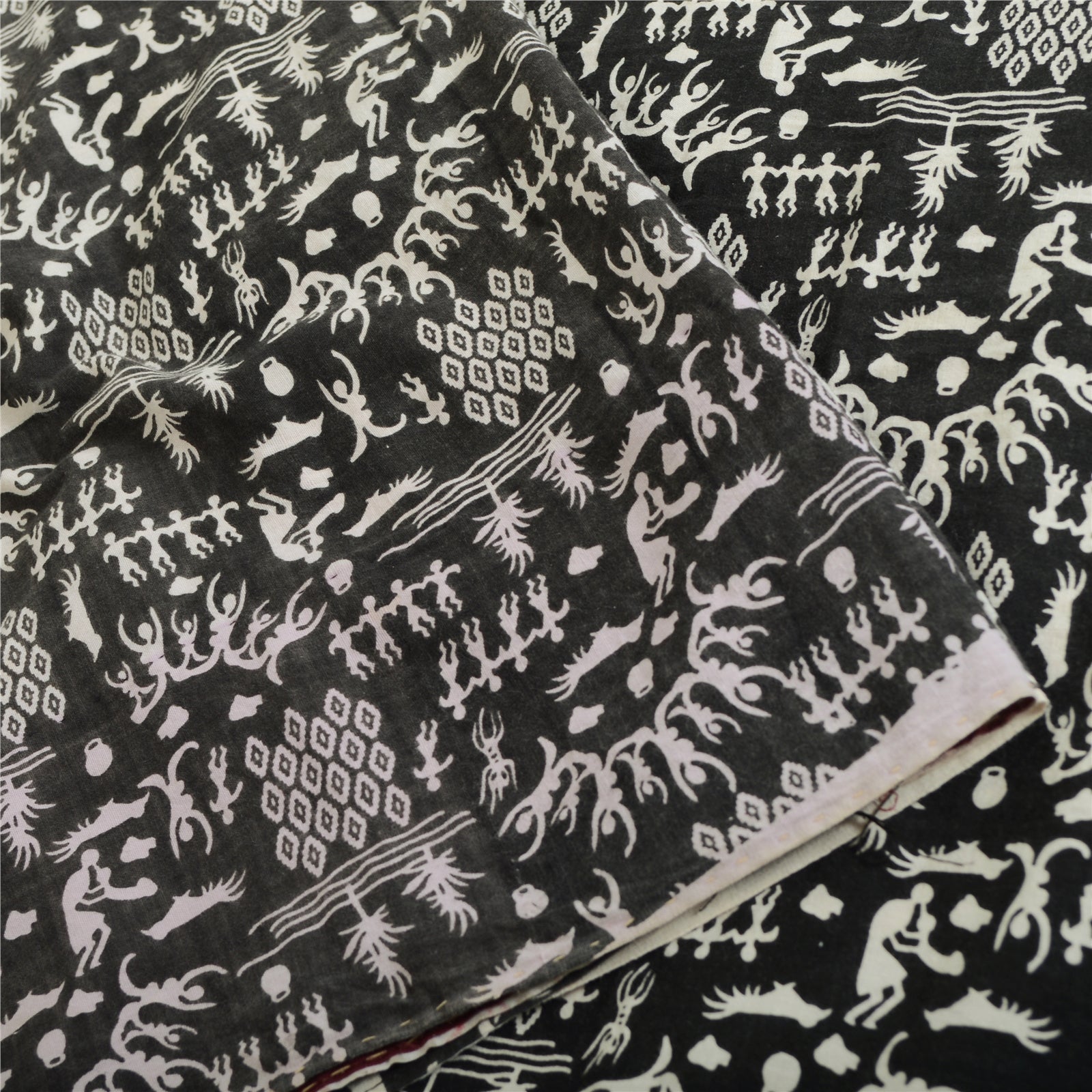 Sanskriti Vintage Sarees Ivory/Black Blend Cotton Warli Art Printed Sari Sustainable Fabric