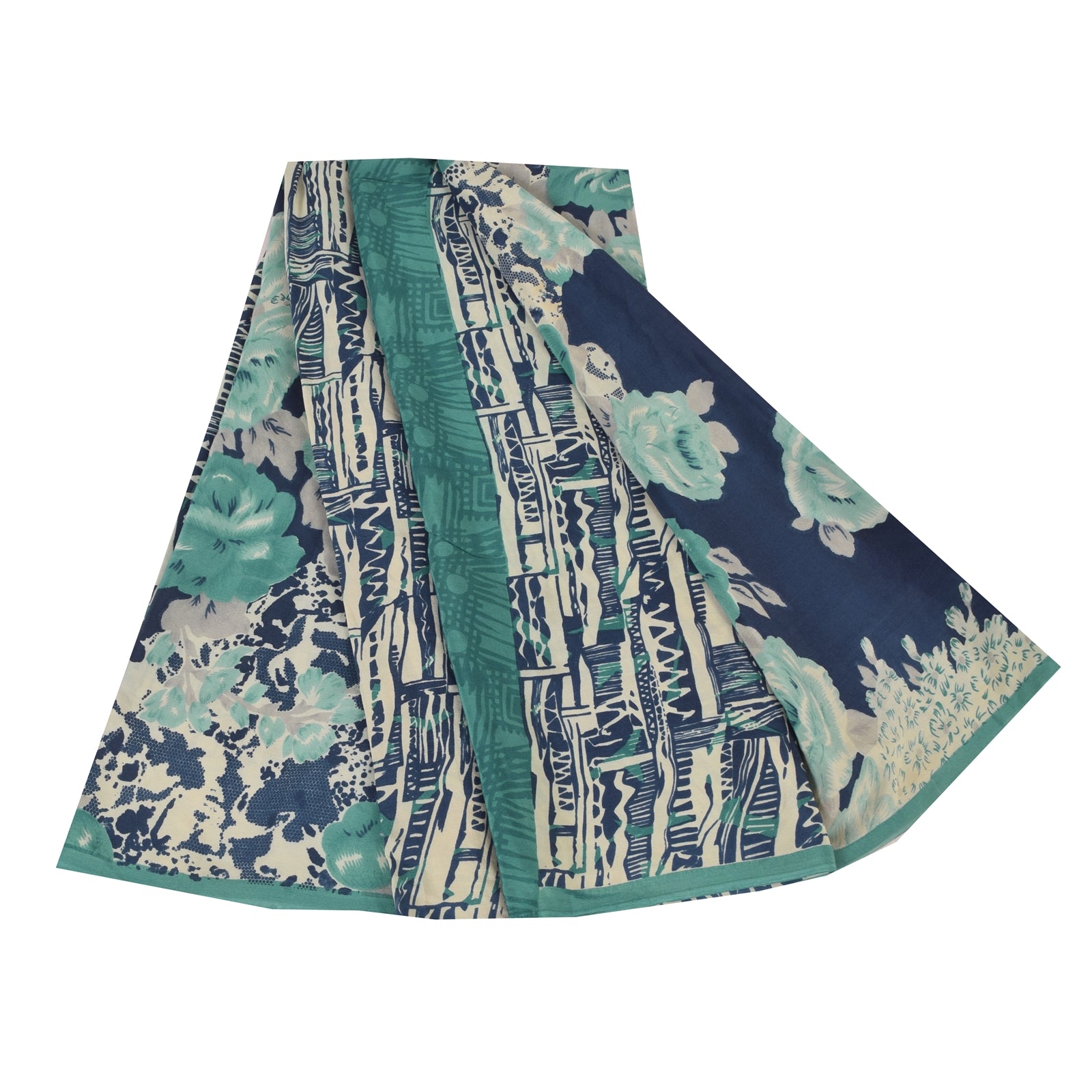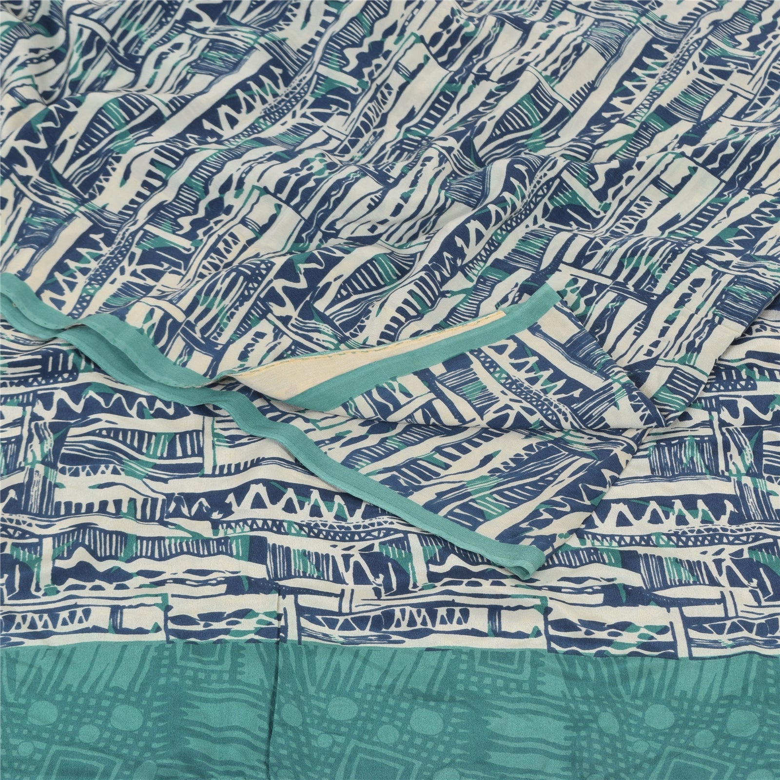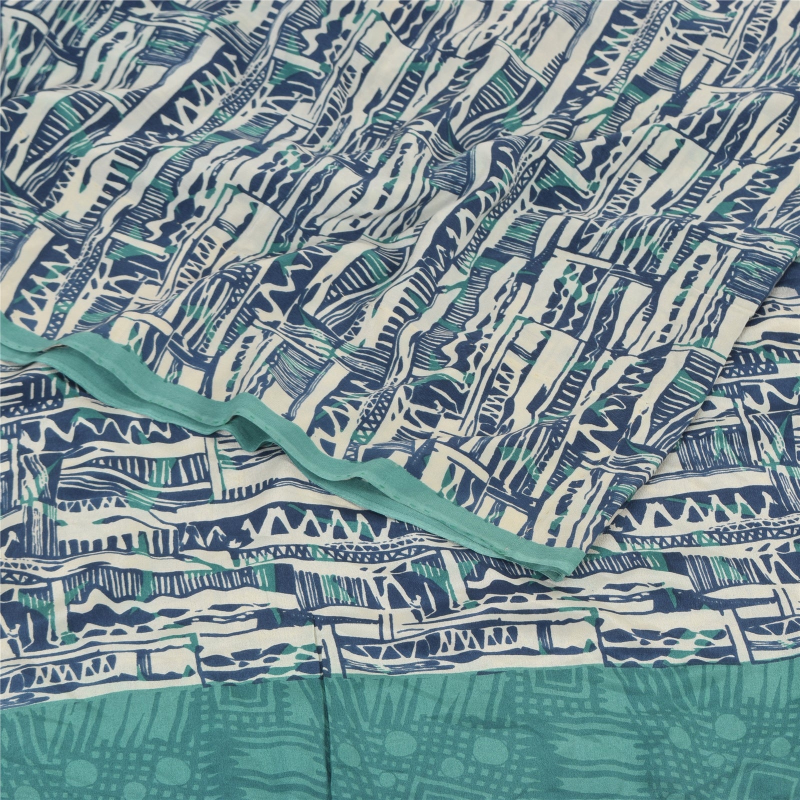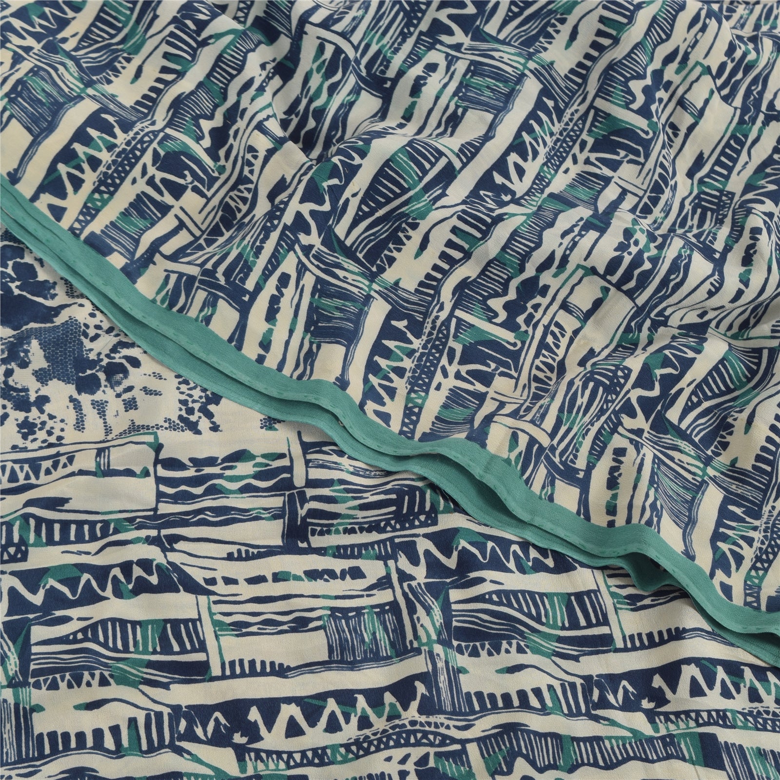 Sanskriti Vintage Sarees Ivory/Blue Pure Crepe Silk Print Sari 5yd Craft Sustainable Fabric