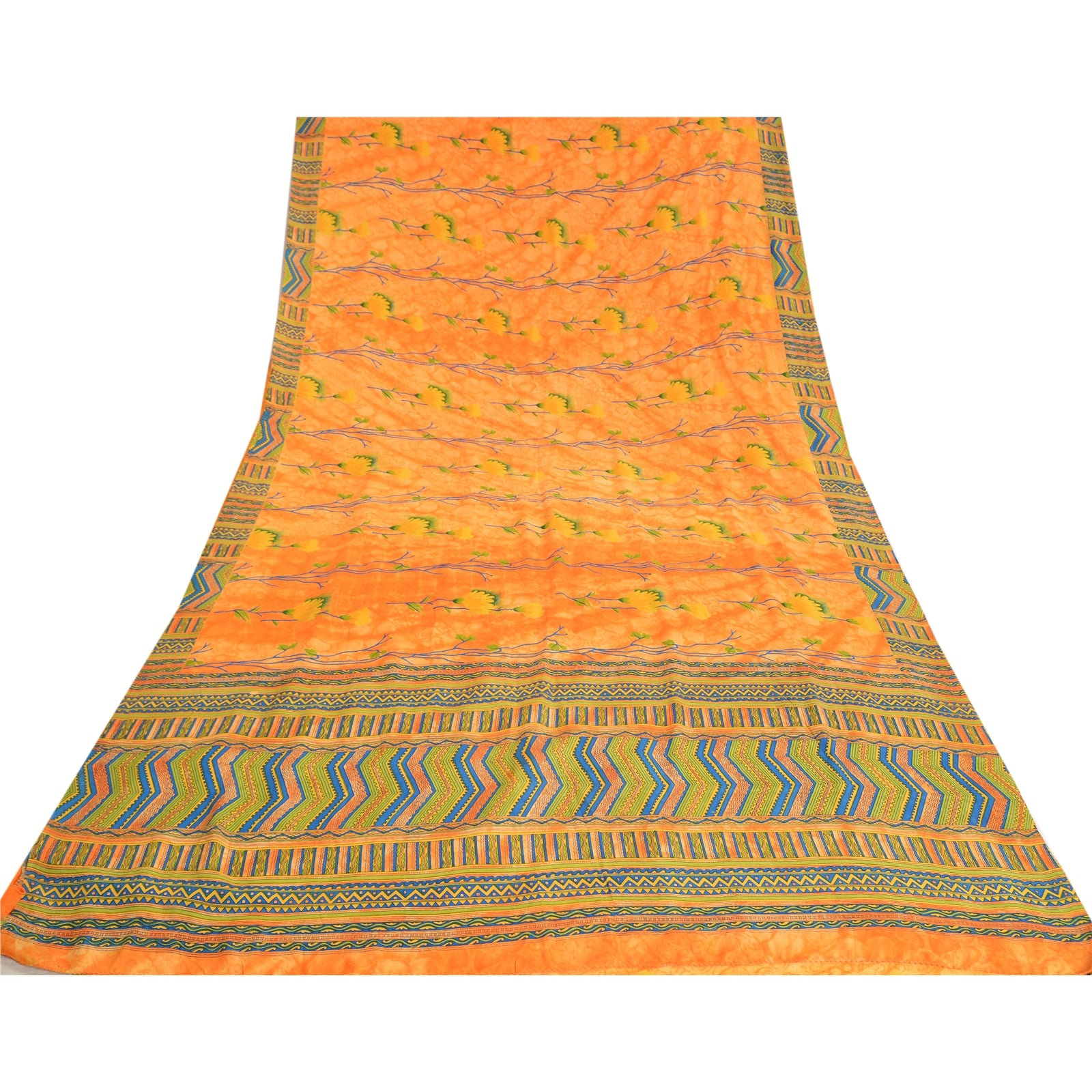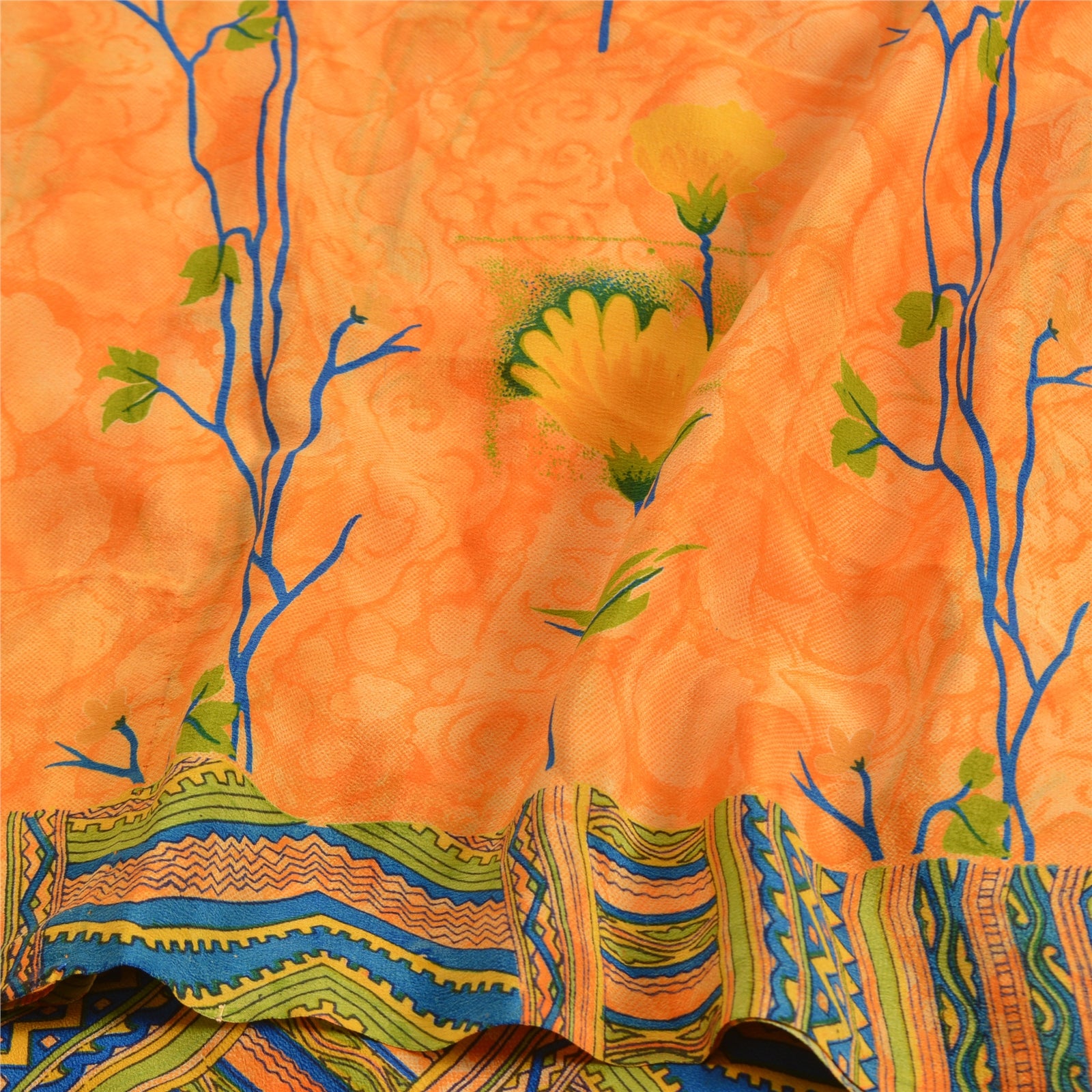 Sanskriti Vintage Sarees Orange Indian Pure Crepe Silk Printed Sari Craft Sustainable Fabric