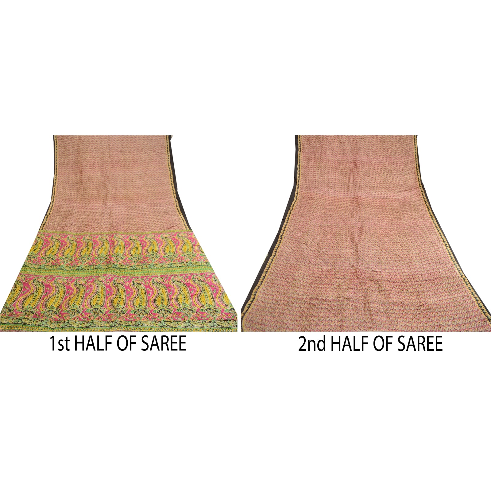 Beautiful pink & green colored pure silk printed saree. Pallu & Border has printed floral design. Similar design in center part of saree. What is special about this saree? Fabulous design is really enhancing the beauty of the saree.This unique vintage saree can be used for various crafting ideas even if you don't want to use it as a sari. Design a dress, use it as window,dressing, upholstery, sarongs, throw, dress making and table linen much more. Let your creative juices flow and use this decorated Sustainable Fabric in multiple fashion.