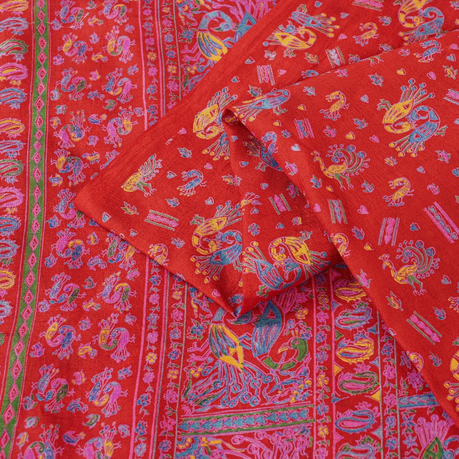 Sanskriti Vintage Sarees Red 100%Pure Silk Peacock Print 6+yd Sari Sewing Fabric