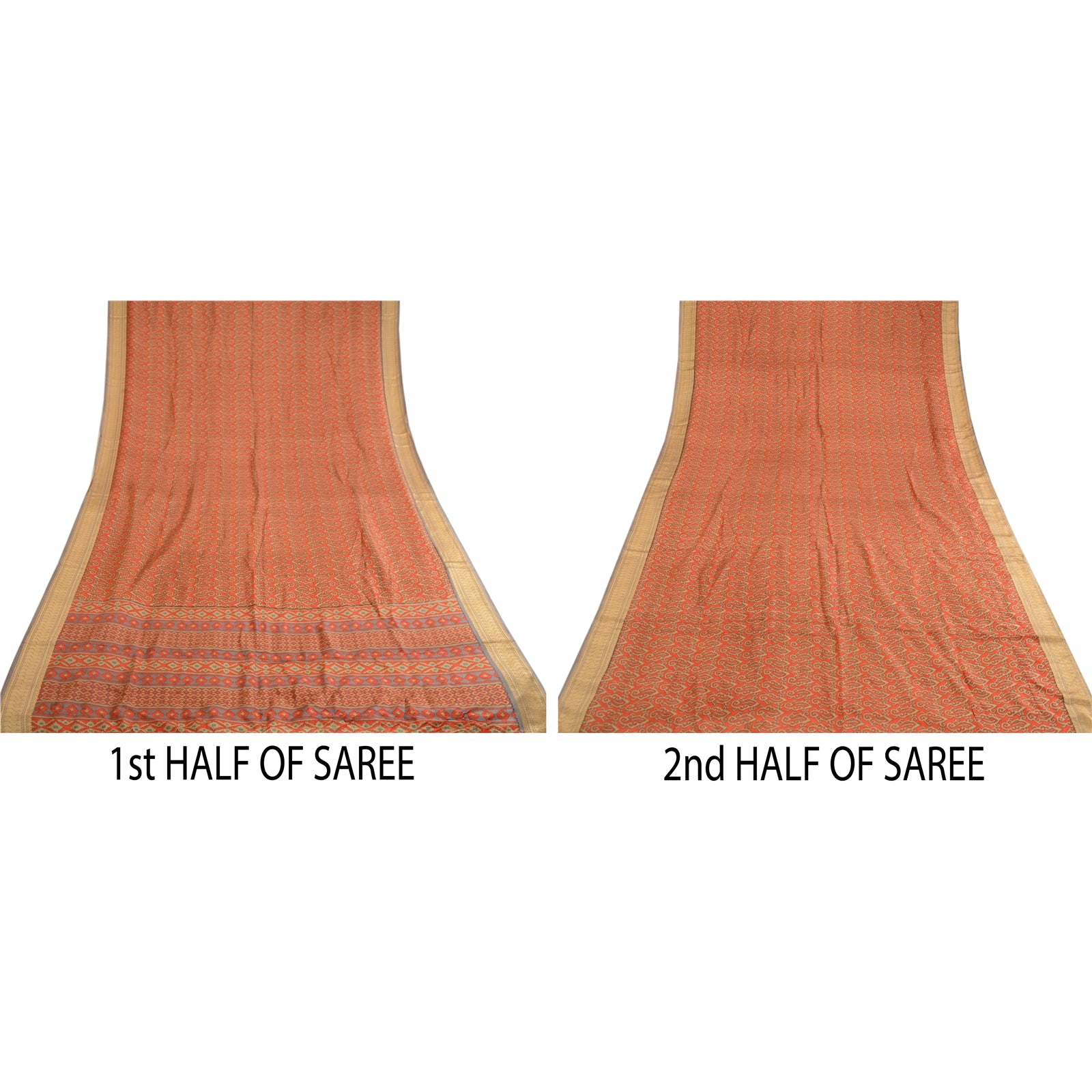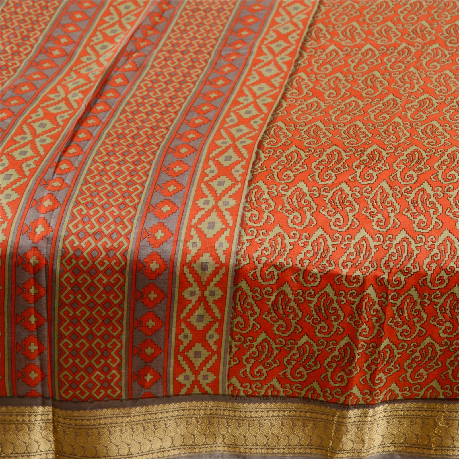 Beautiful red colored pure silk printed saree. Pallu & Border has printed geometric design & golden woven work. Floral design in center part of saree. What is special about this saree? Fabulous design is really enhancing the beauty of the saree.This unique vintage saree can be used for various crafting ideas even if you don't want to use it as a sari. Design a dress, use it as window,dressing, upholstery, sarongs, throw, dress making and table linen much more. Let your creative juices flow and use this decorated Sustainable Fabric in multiple fashion.