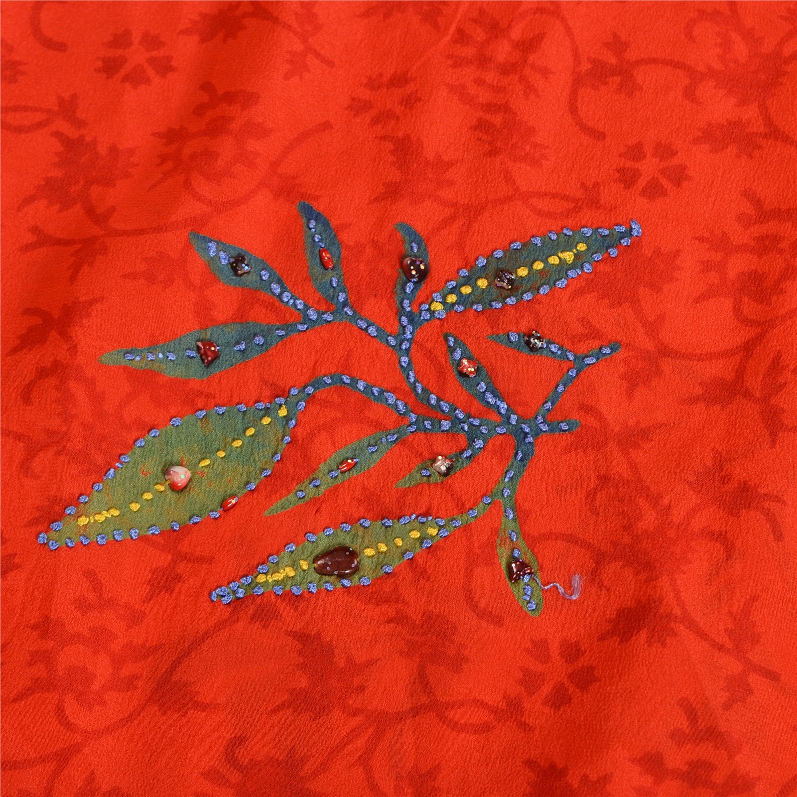 Sanskriti Vintage Sarees Red/Yellow Hand Beaded Printed Pure Crepe Sari Sustainable Fabric