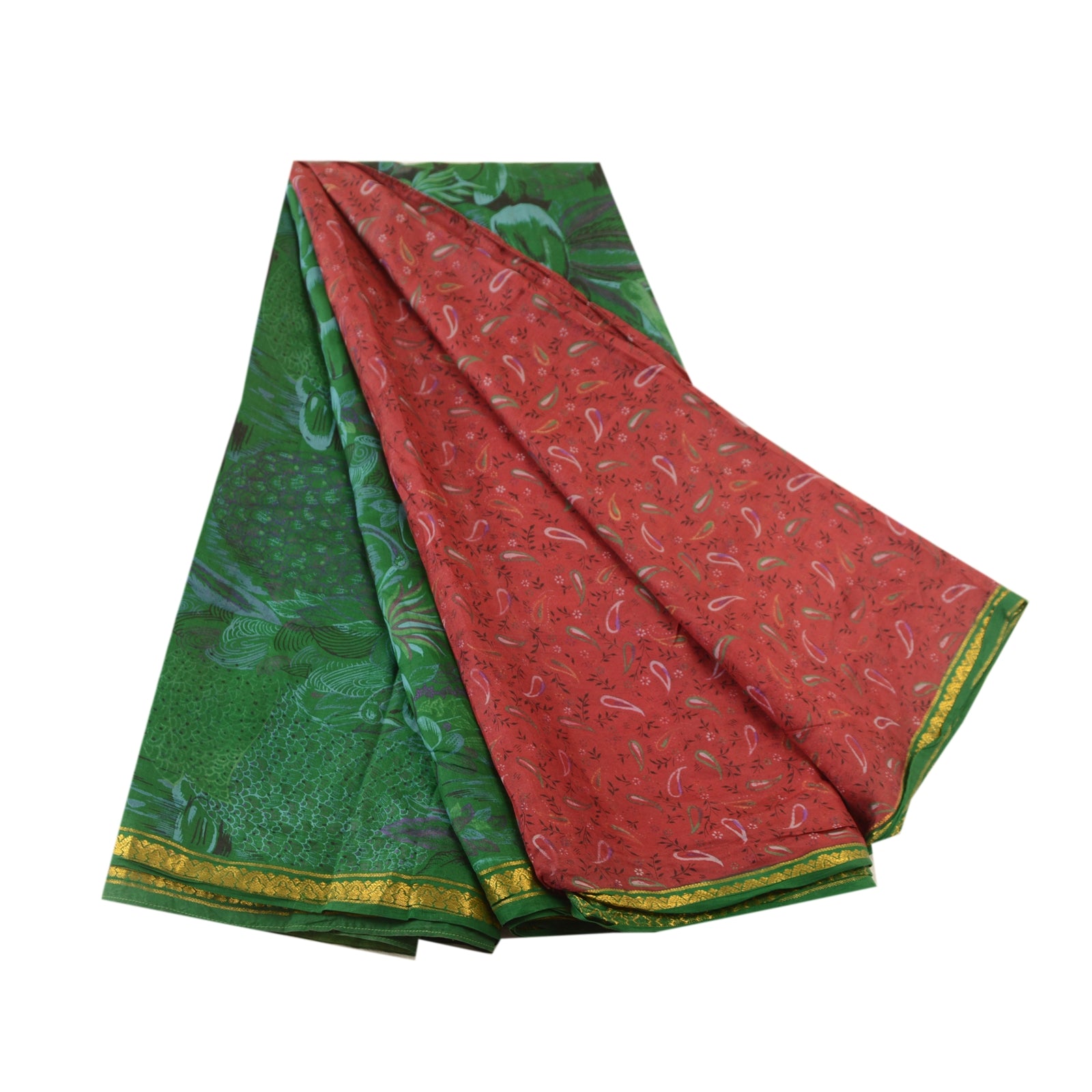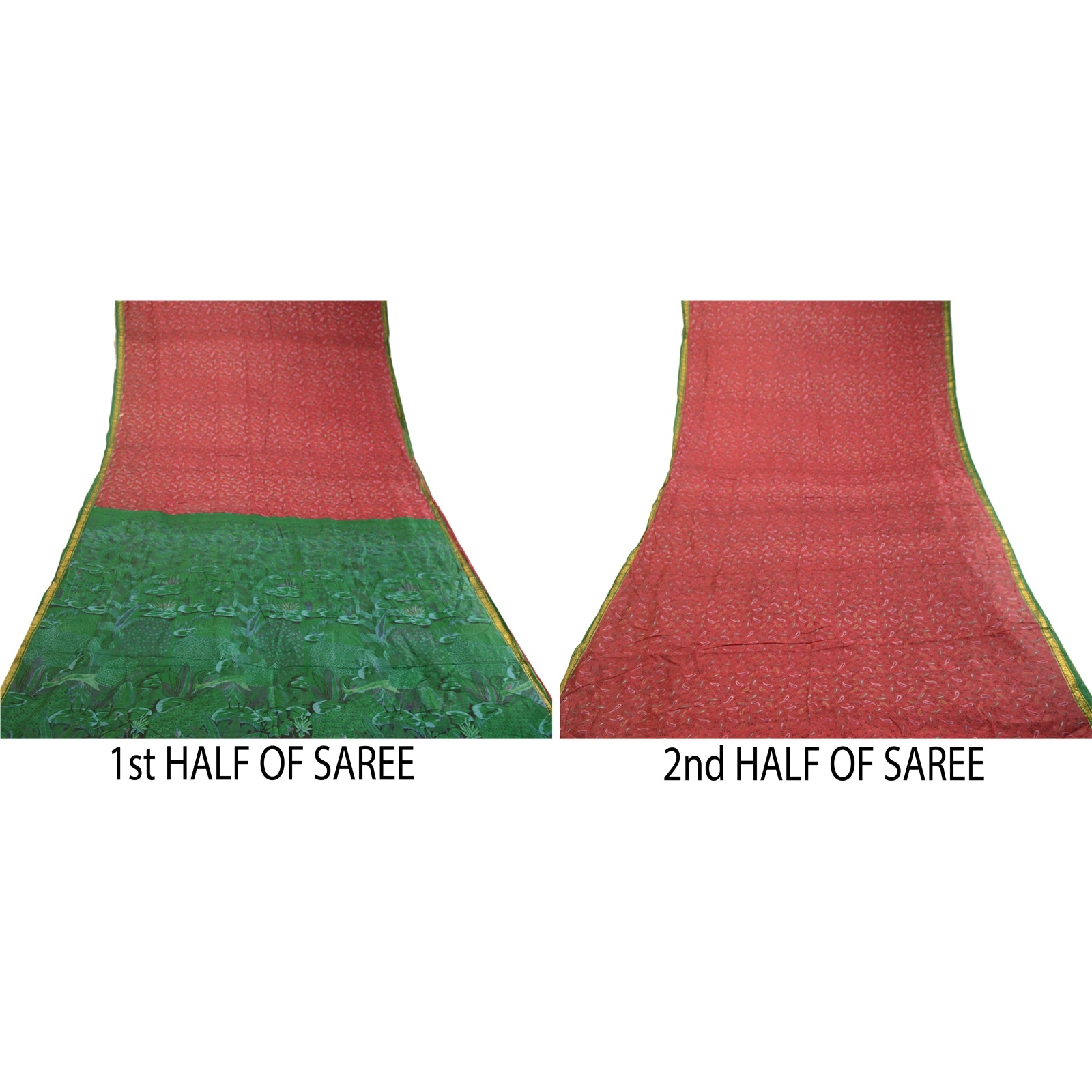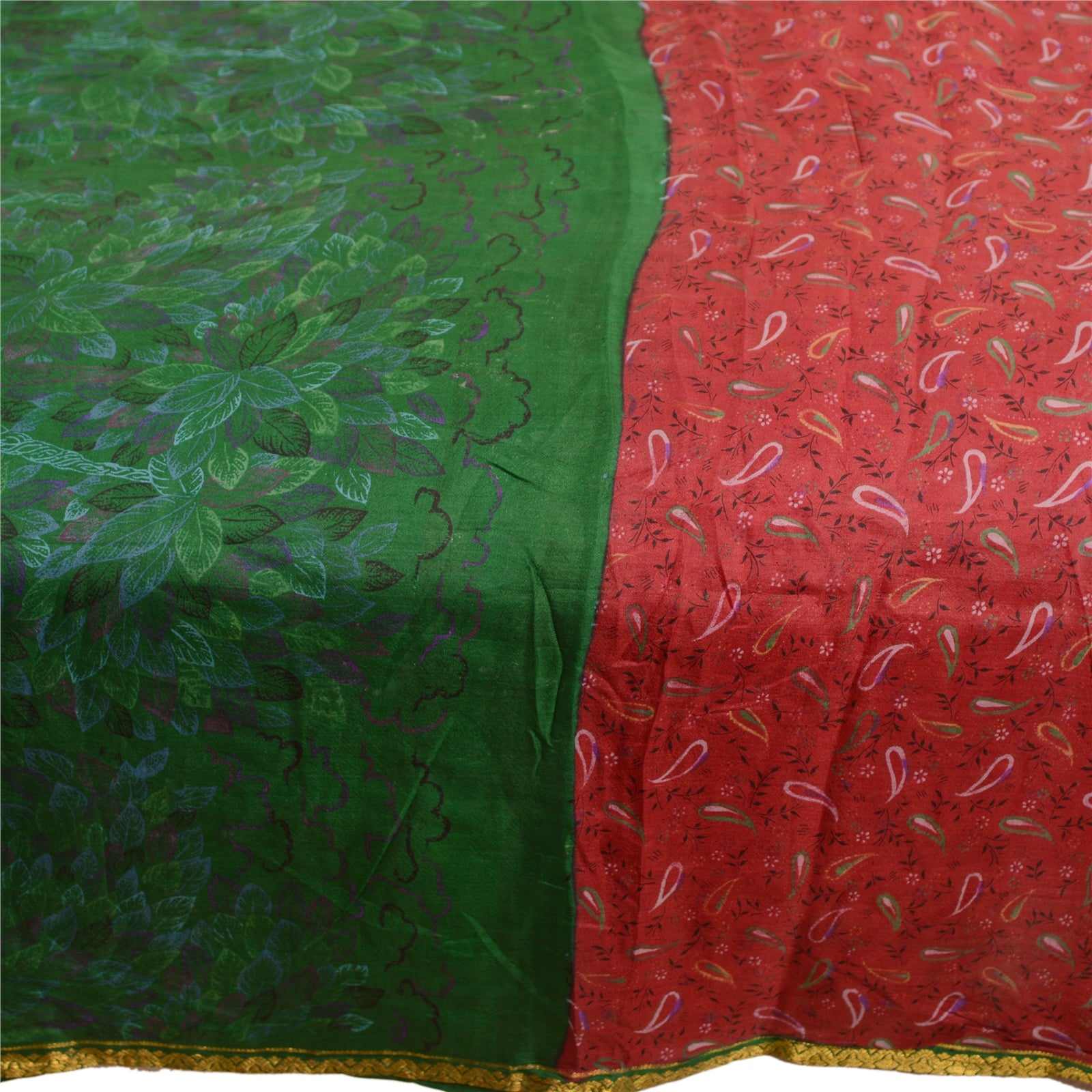 Sanskriti Vintage Sarees Red Zari Border Pure Silk Printed Sari 5yd Craft Sustainable Fabric