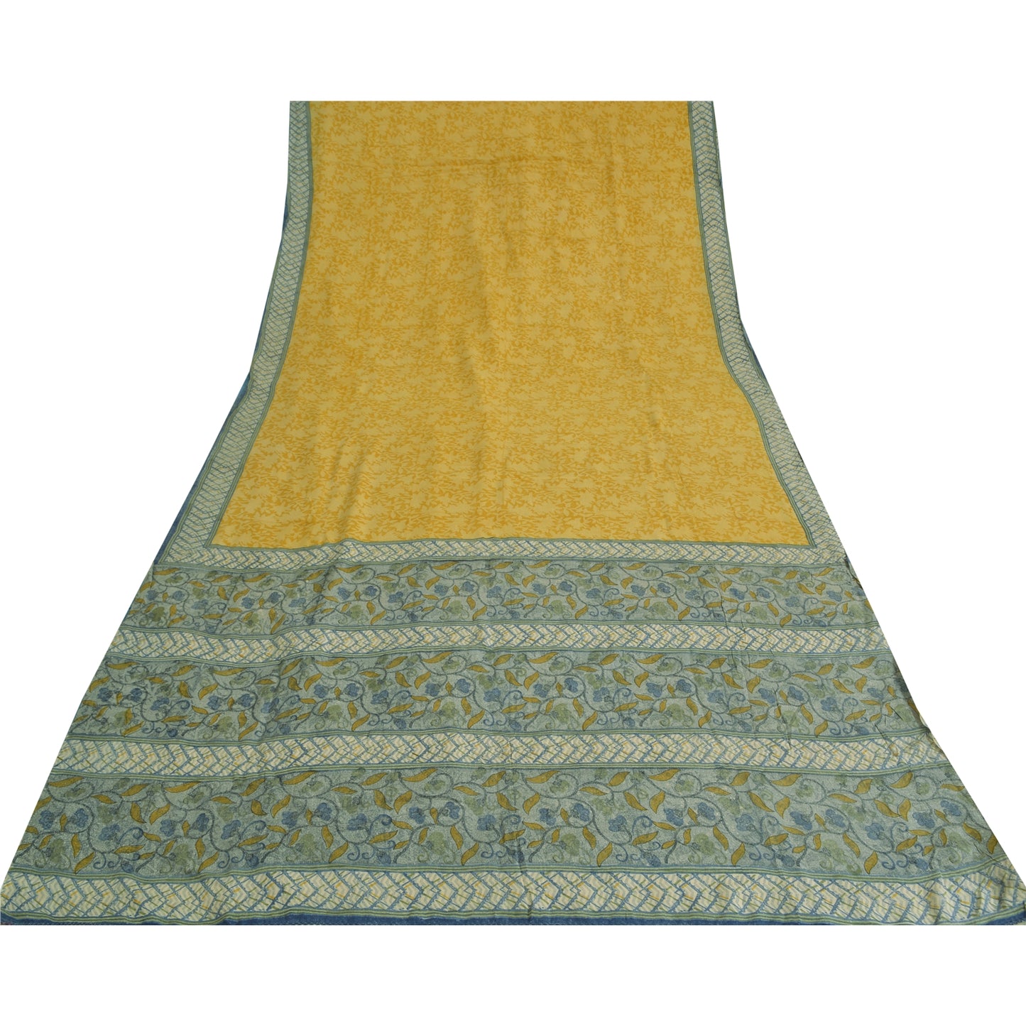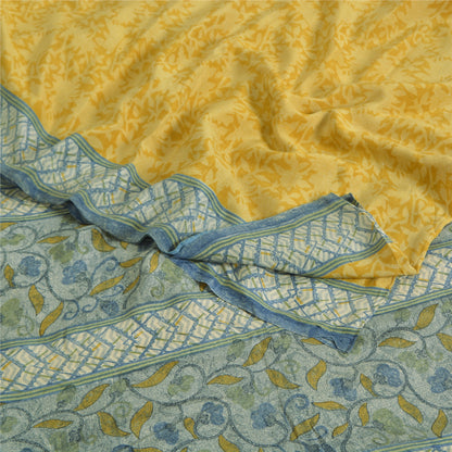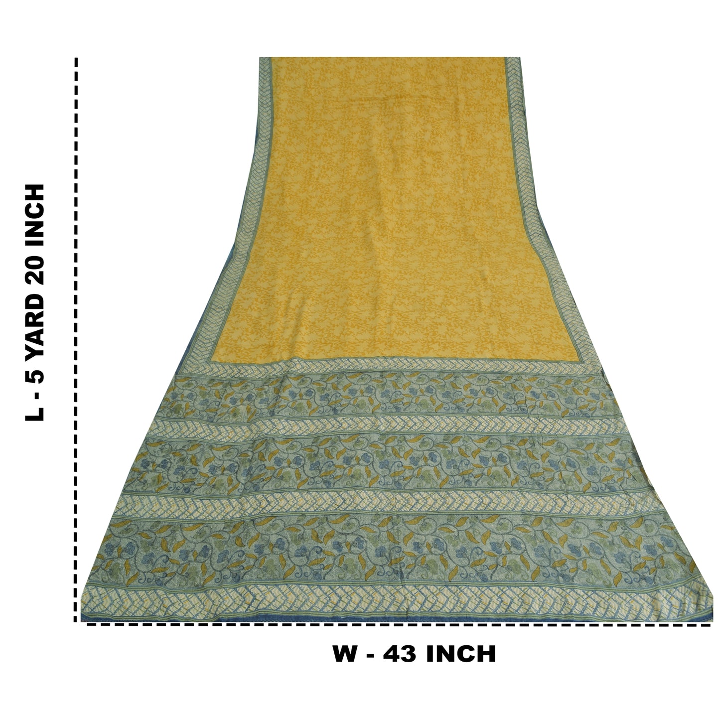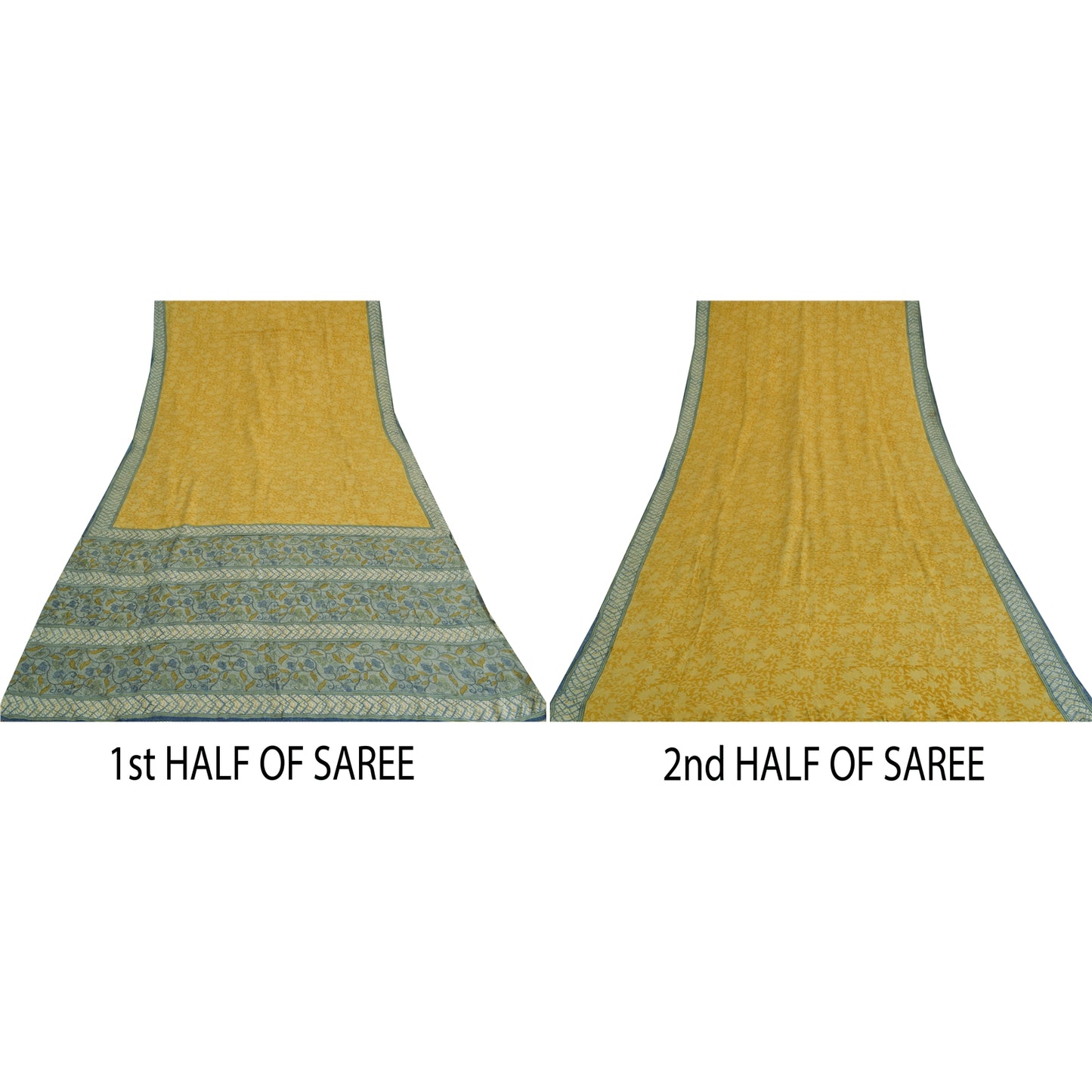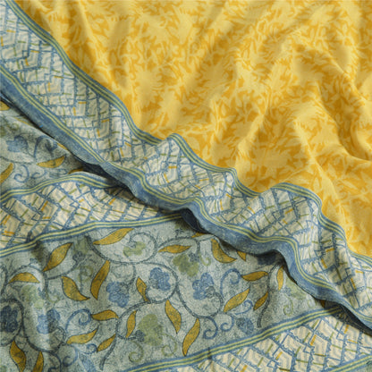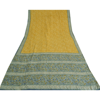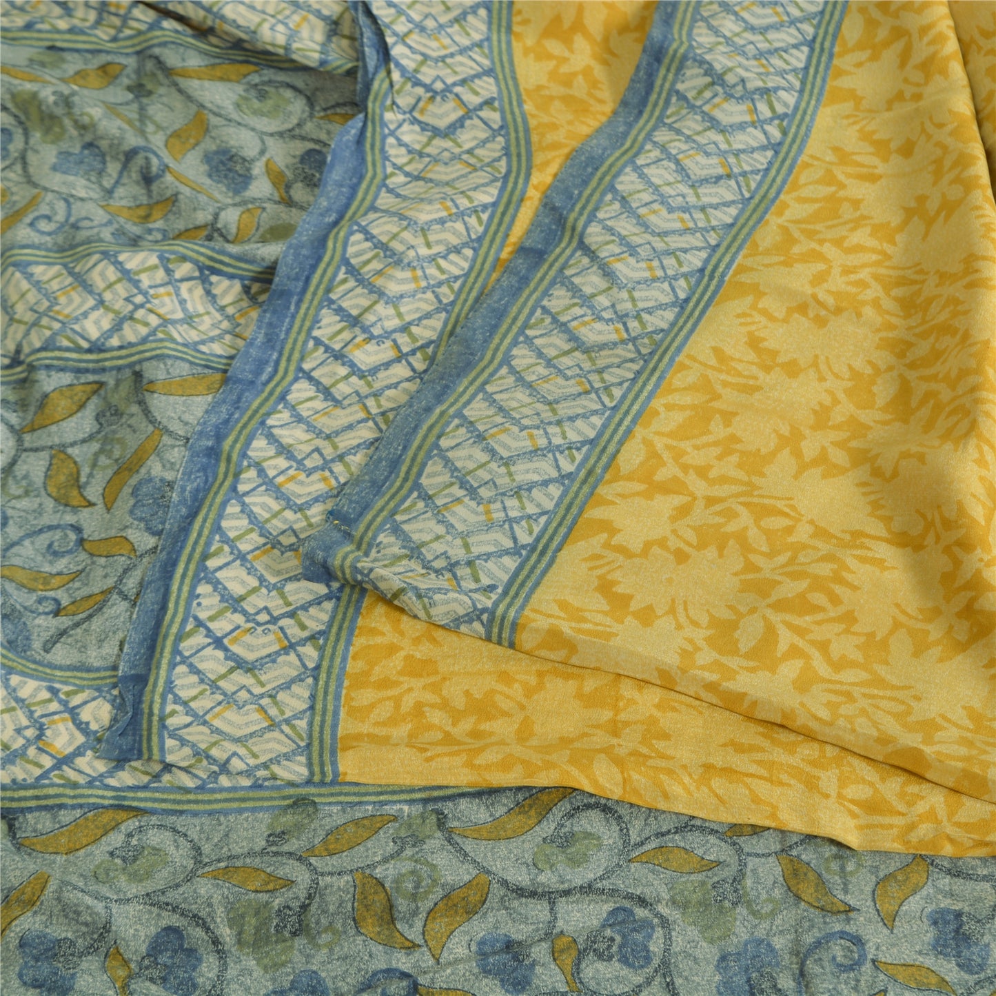 Sanskriti Vintage Sarees Yellow/Gray Pure Crepe Silk Printed Sari Craft Sustainable Fabric
