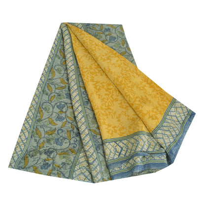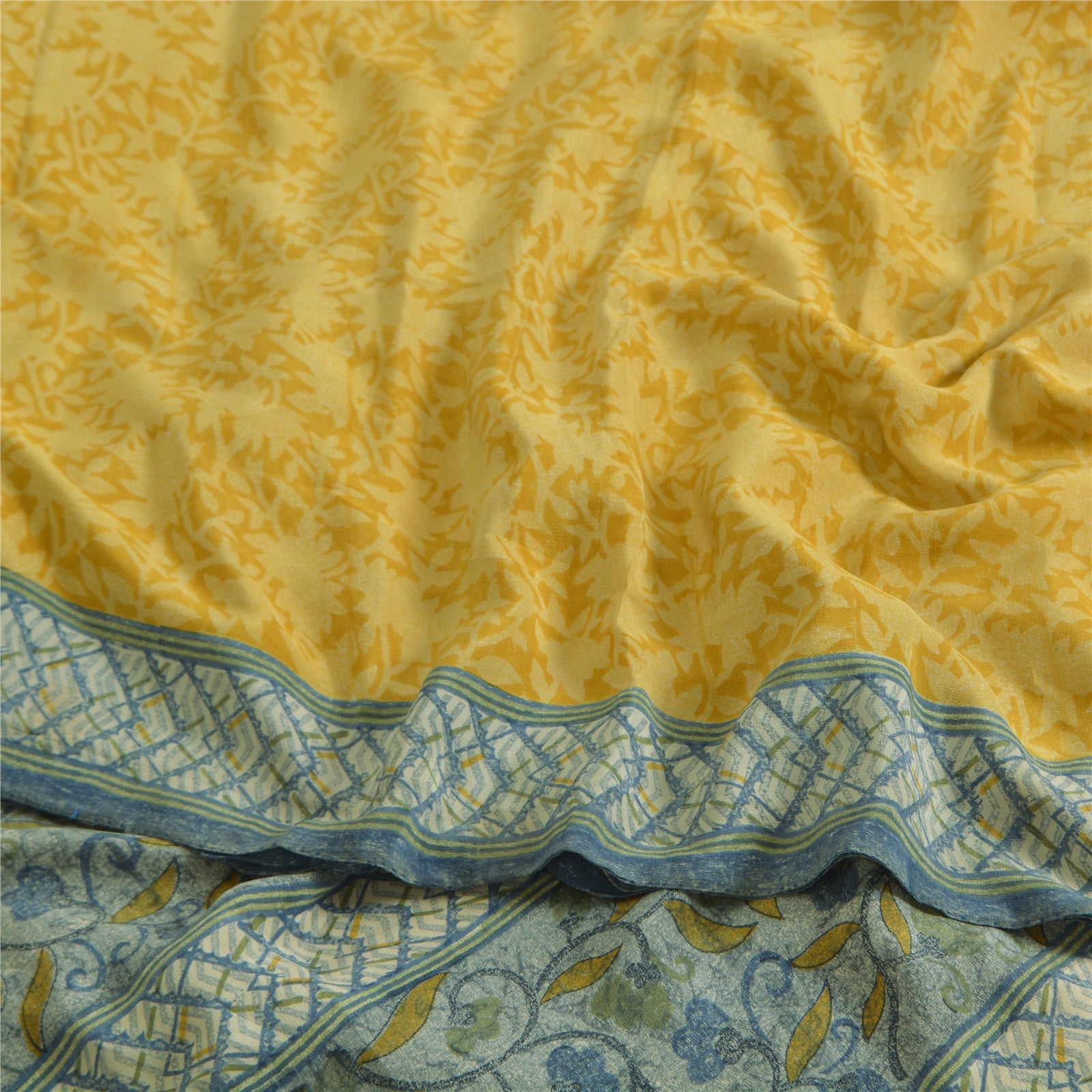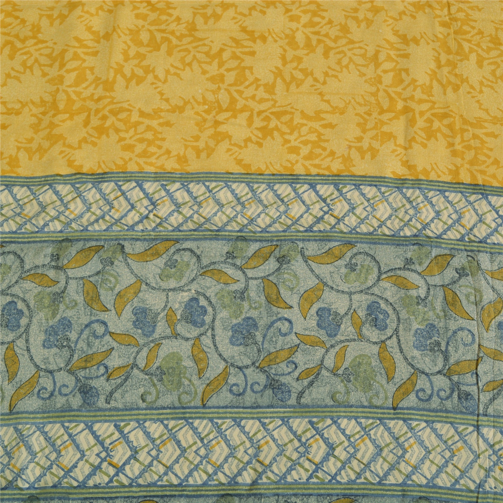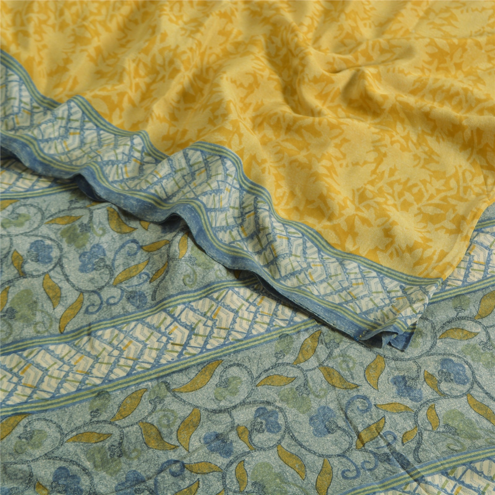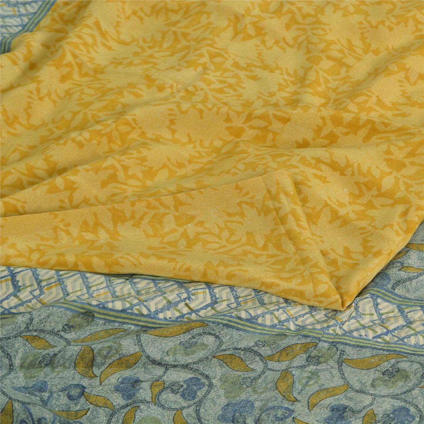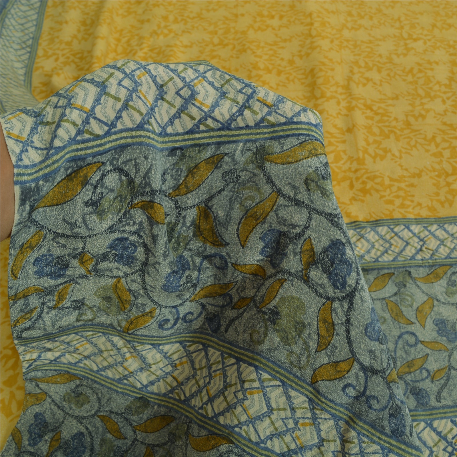 Sanskriti Vintage Sarees Yellow/Gray Pure Crepe Silk Printed Sari Craft Sustainable Fabric