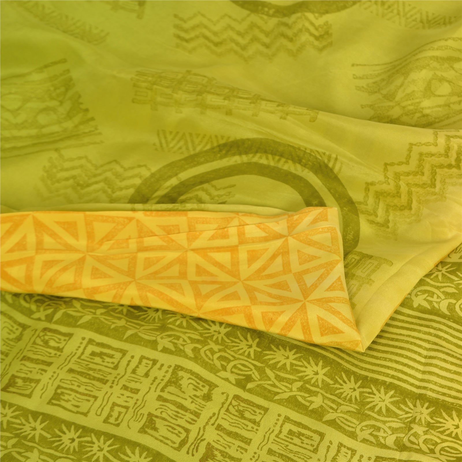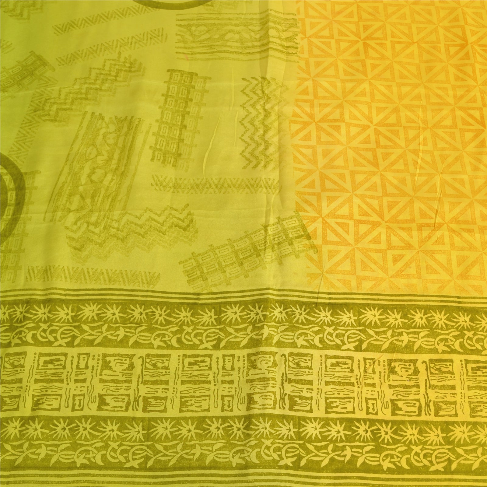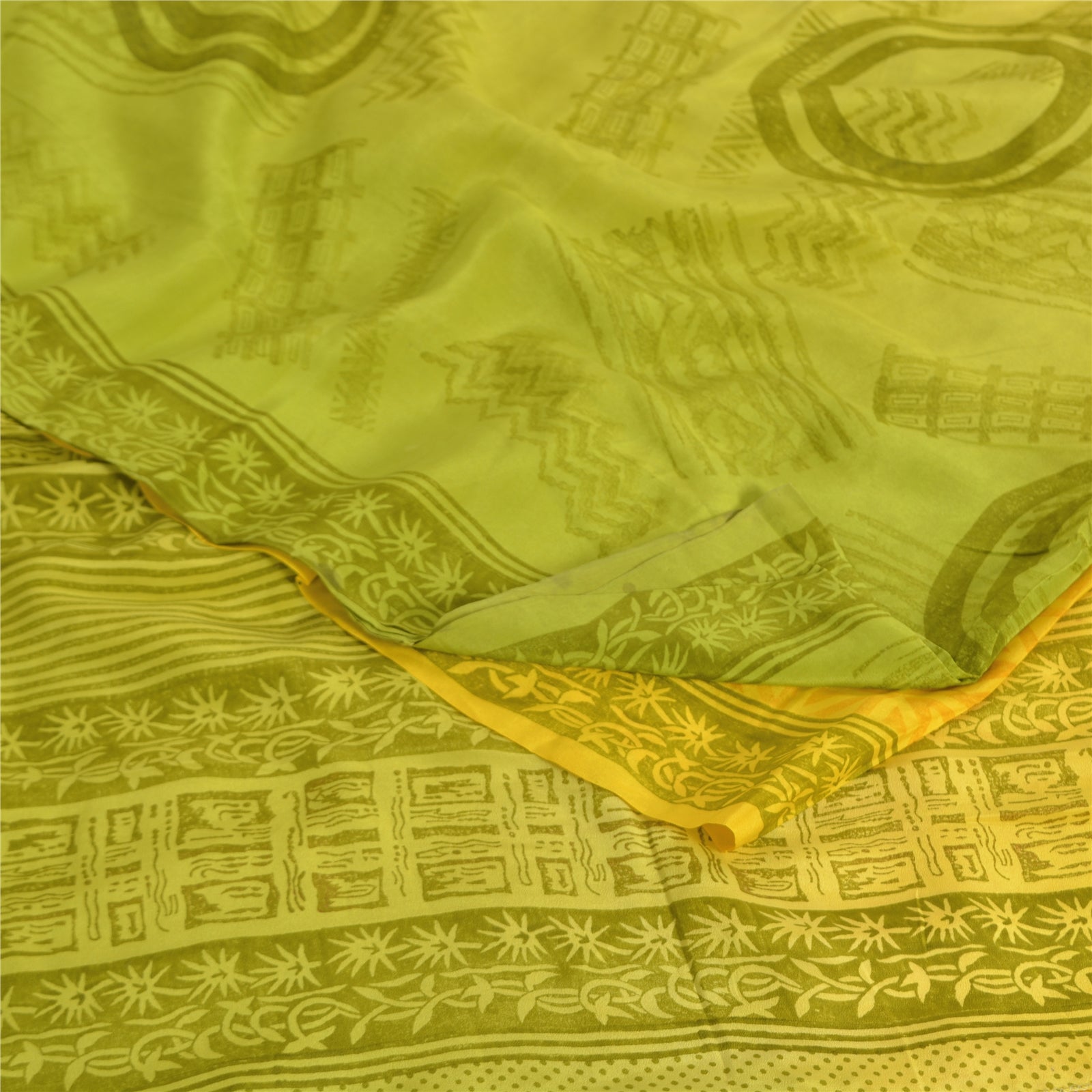 Sanskriti Vintage Sarees Yellow/Green Pure Crepe Silk Printed Sari 5yd Sustainable Fabric