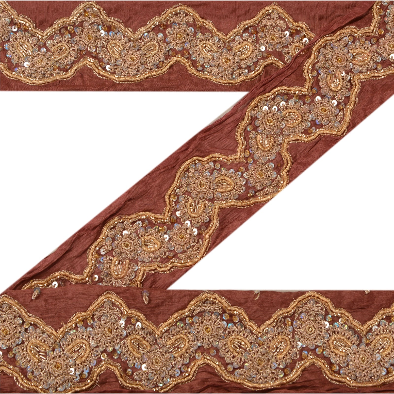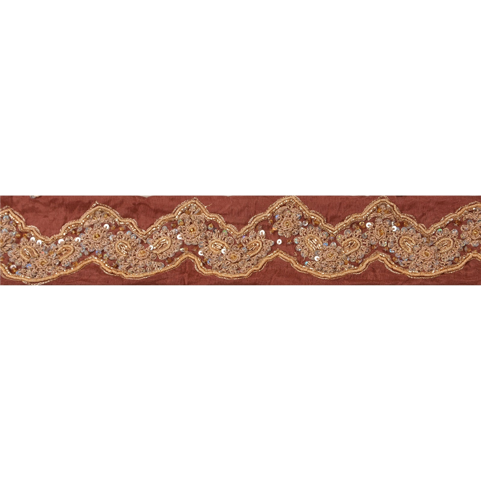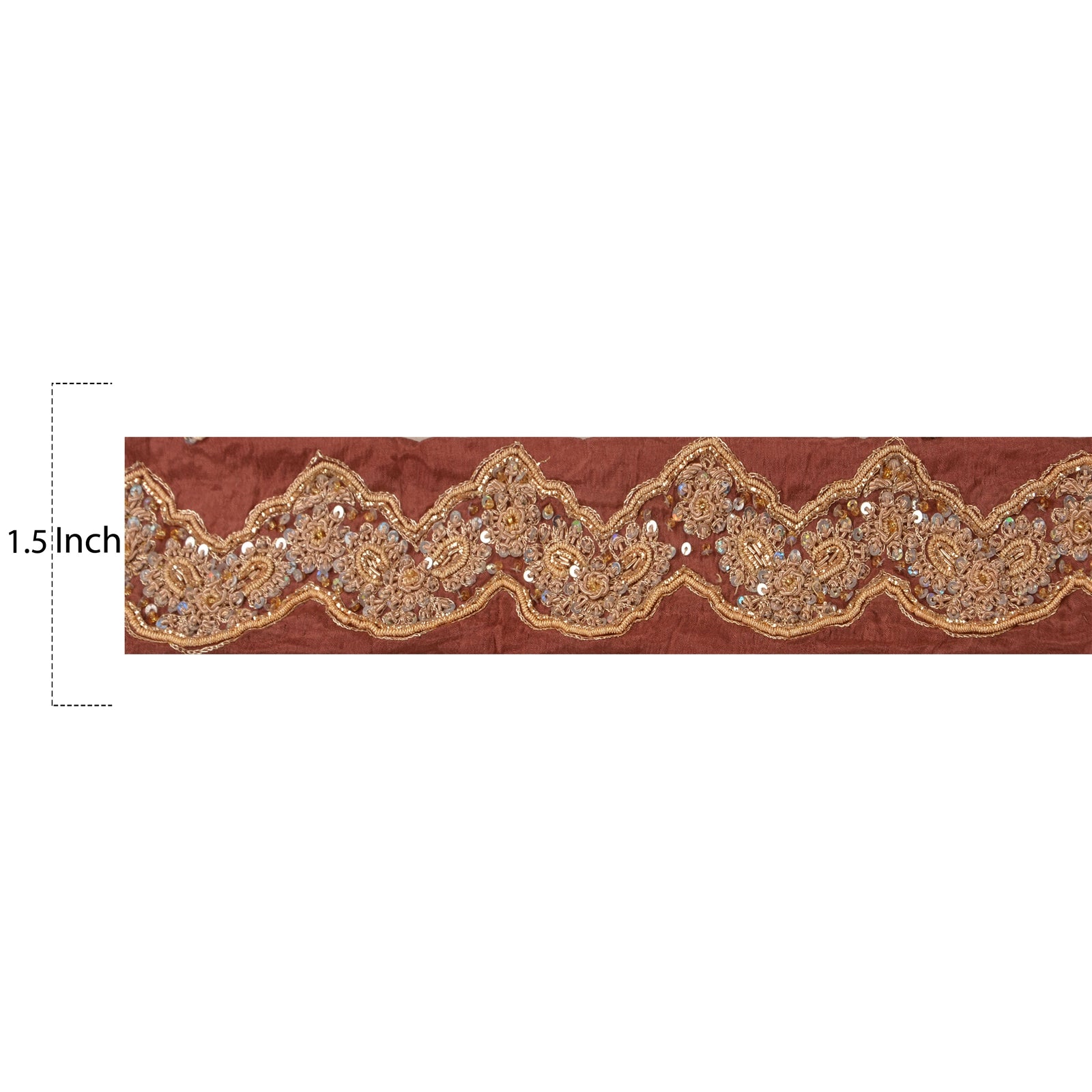 Fabulous pure silk hand beaded sari border in peach color highlighting dabka work. Border has beautiful floral patterns painstakingly hand beaded with gold zari/zardozi/dabka work, silver sequins work . Further you can see fine detailing with white glass beads work. WOW!! an awesome one of a kind versatile border. 1 Quantity = 1 Yard