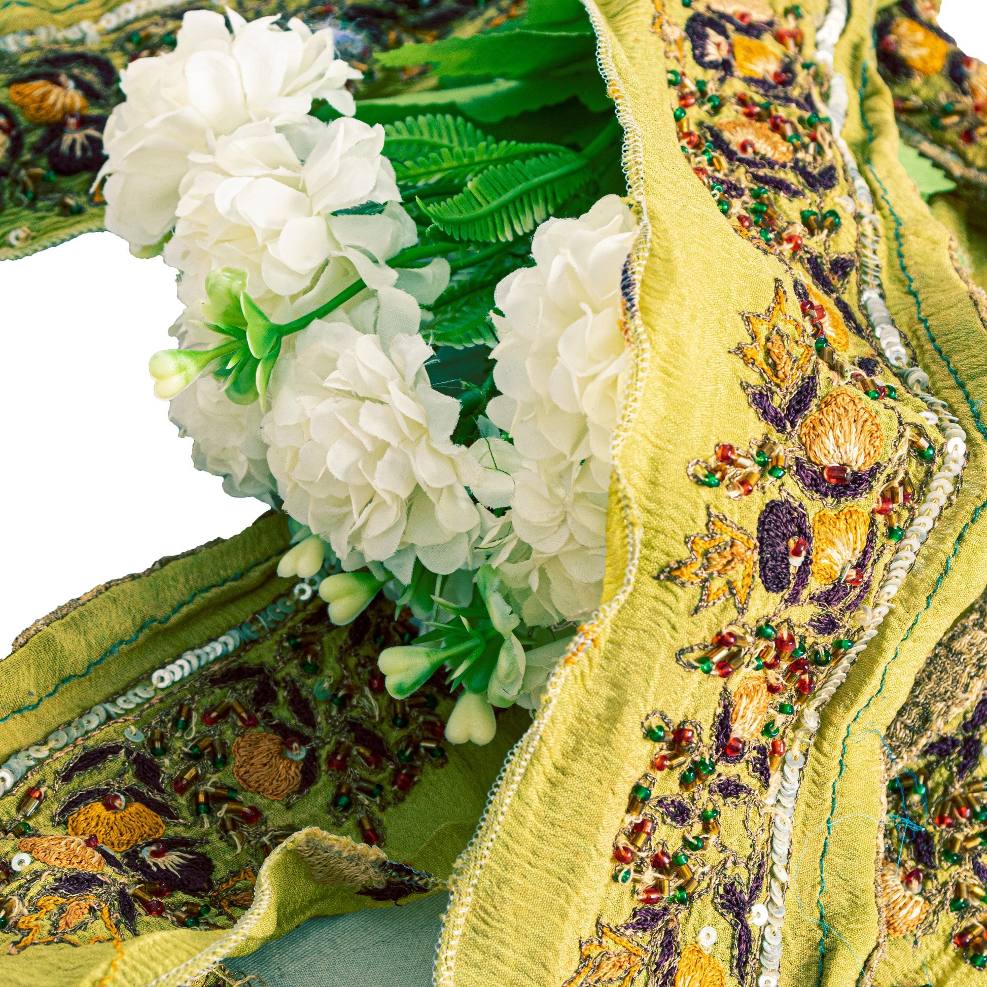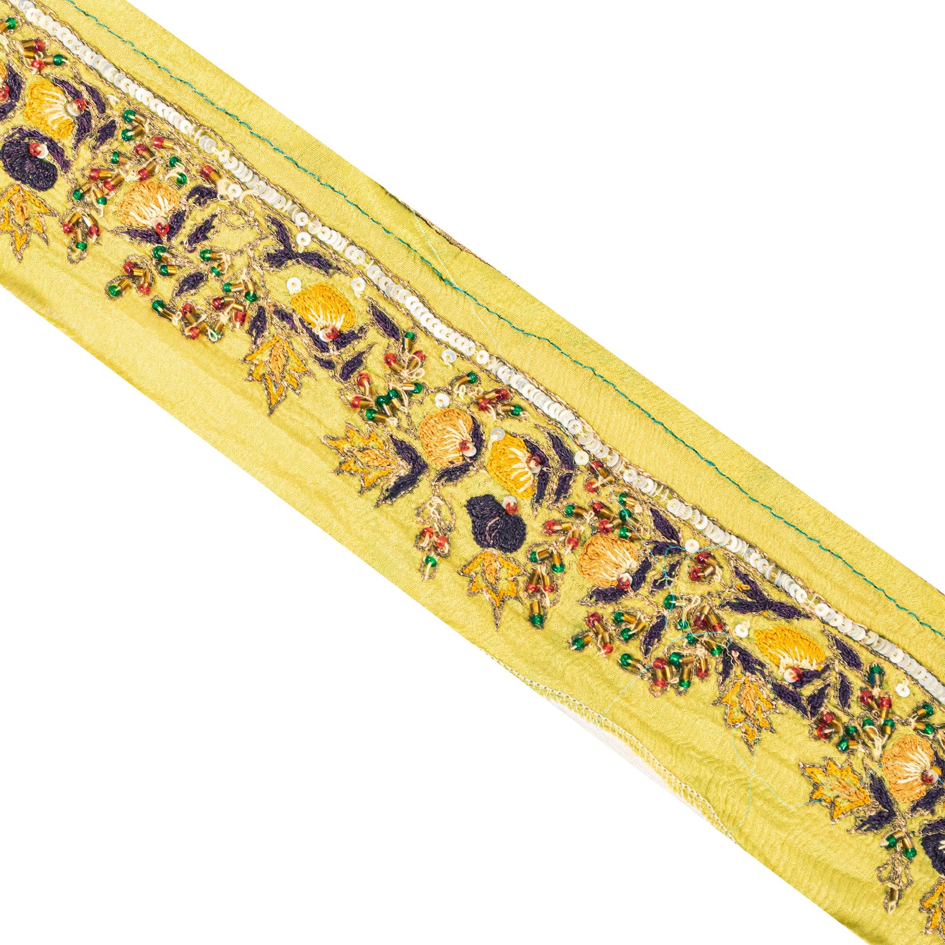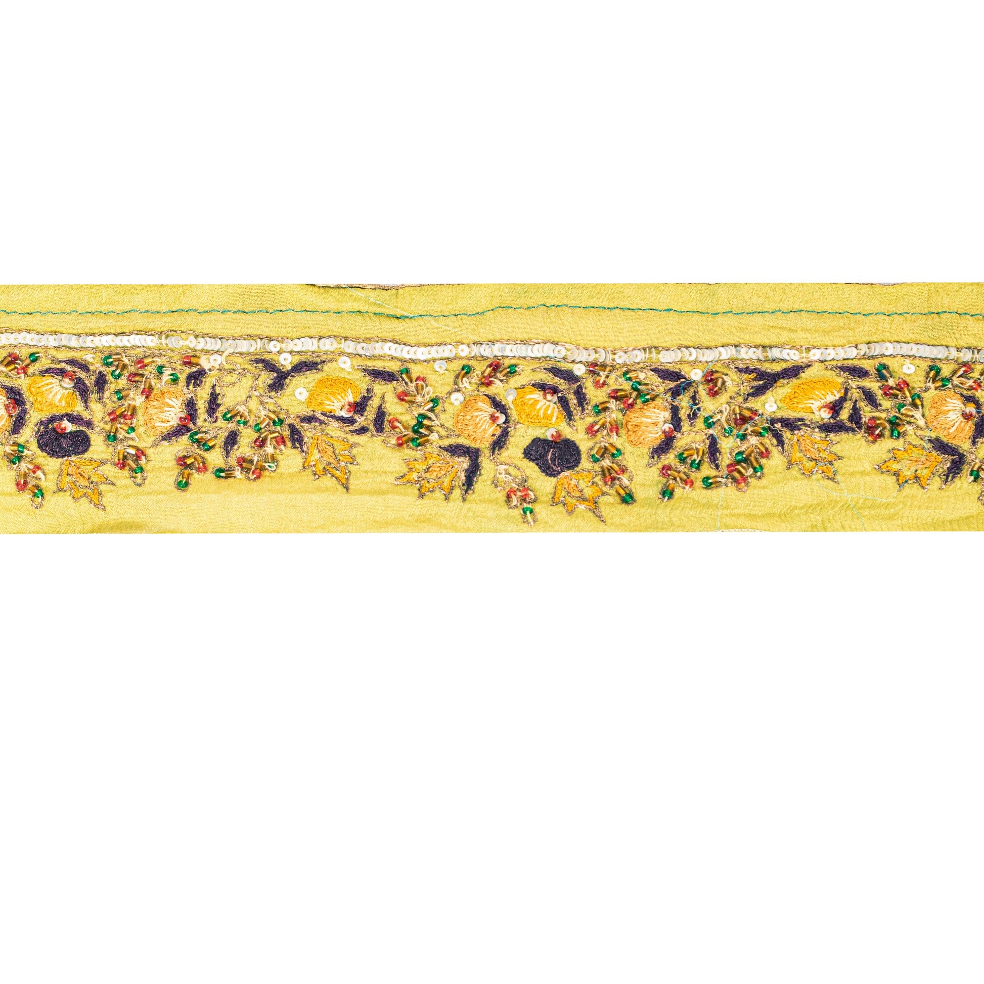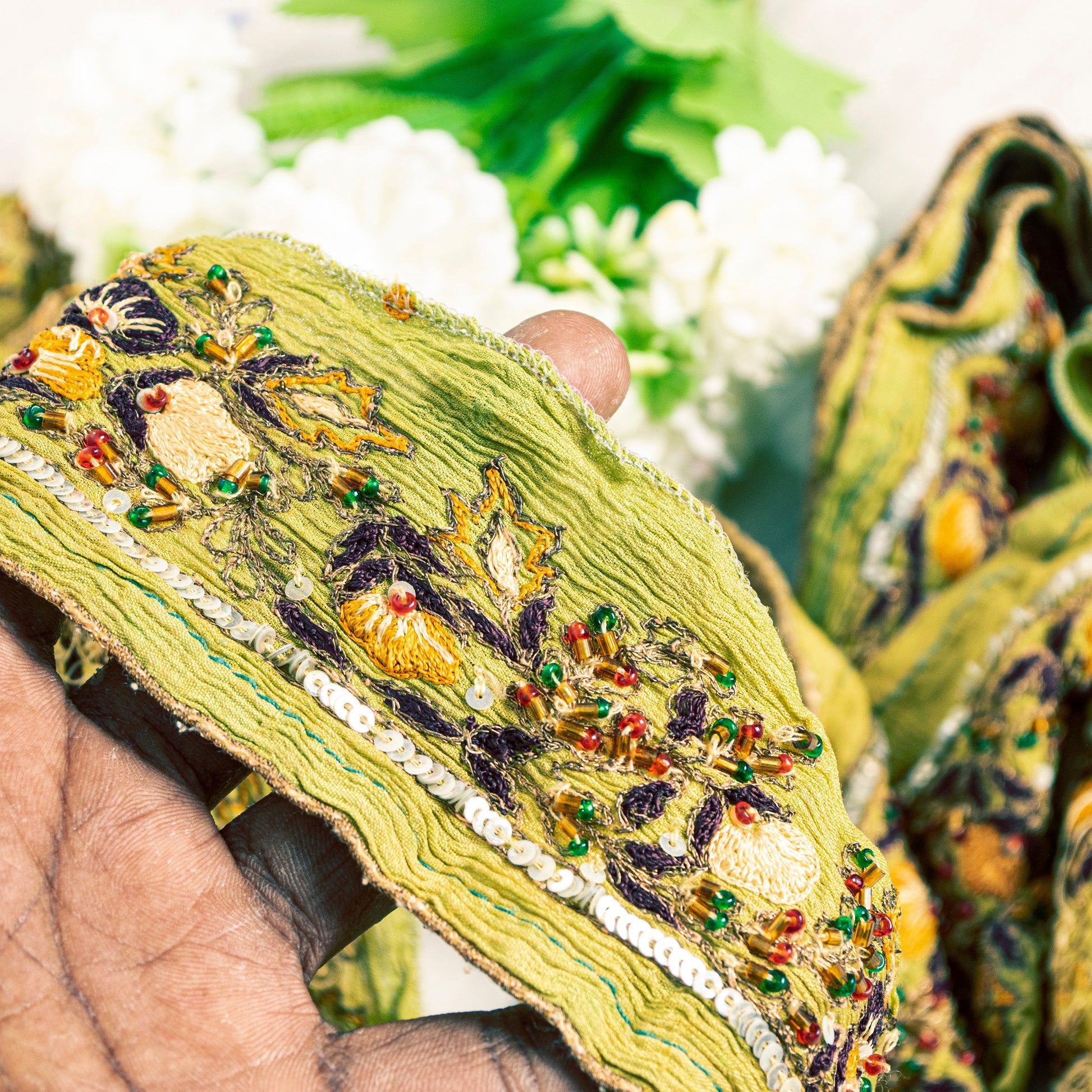 Beautiful pure silk hand embroidered sari border. Further embellished by brown, cream, yellow thread work. Also, you can red/green glass beads, yellow bugle beads, silver sequins work along with floral design on green base fabric. 1 Quantity = 1 Yard