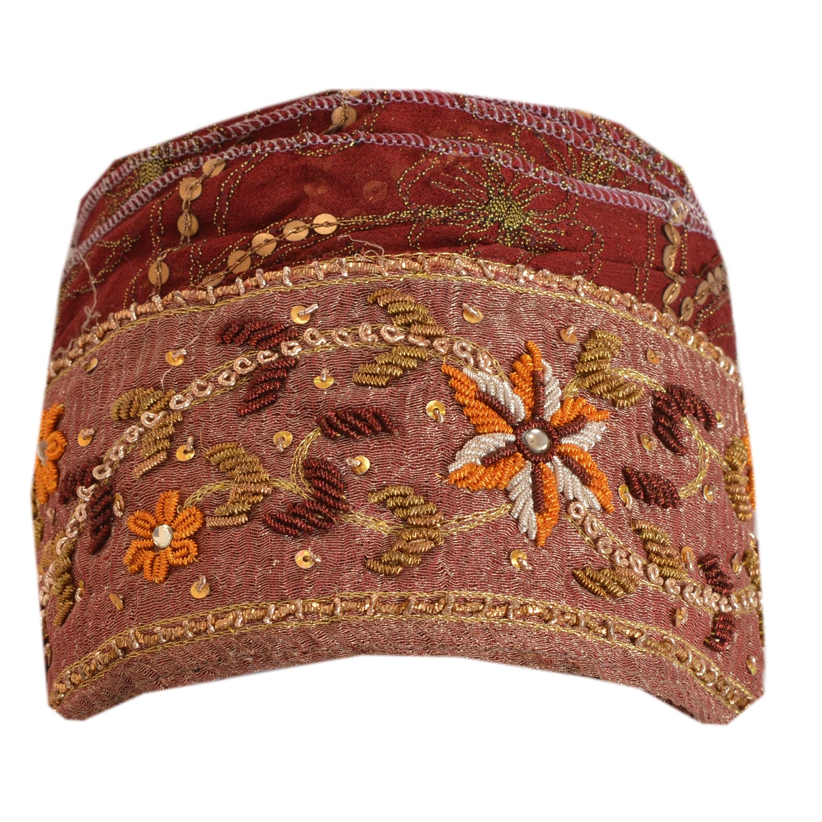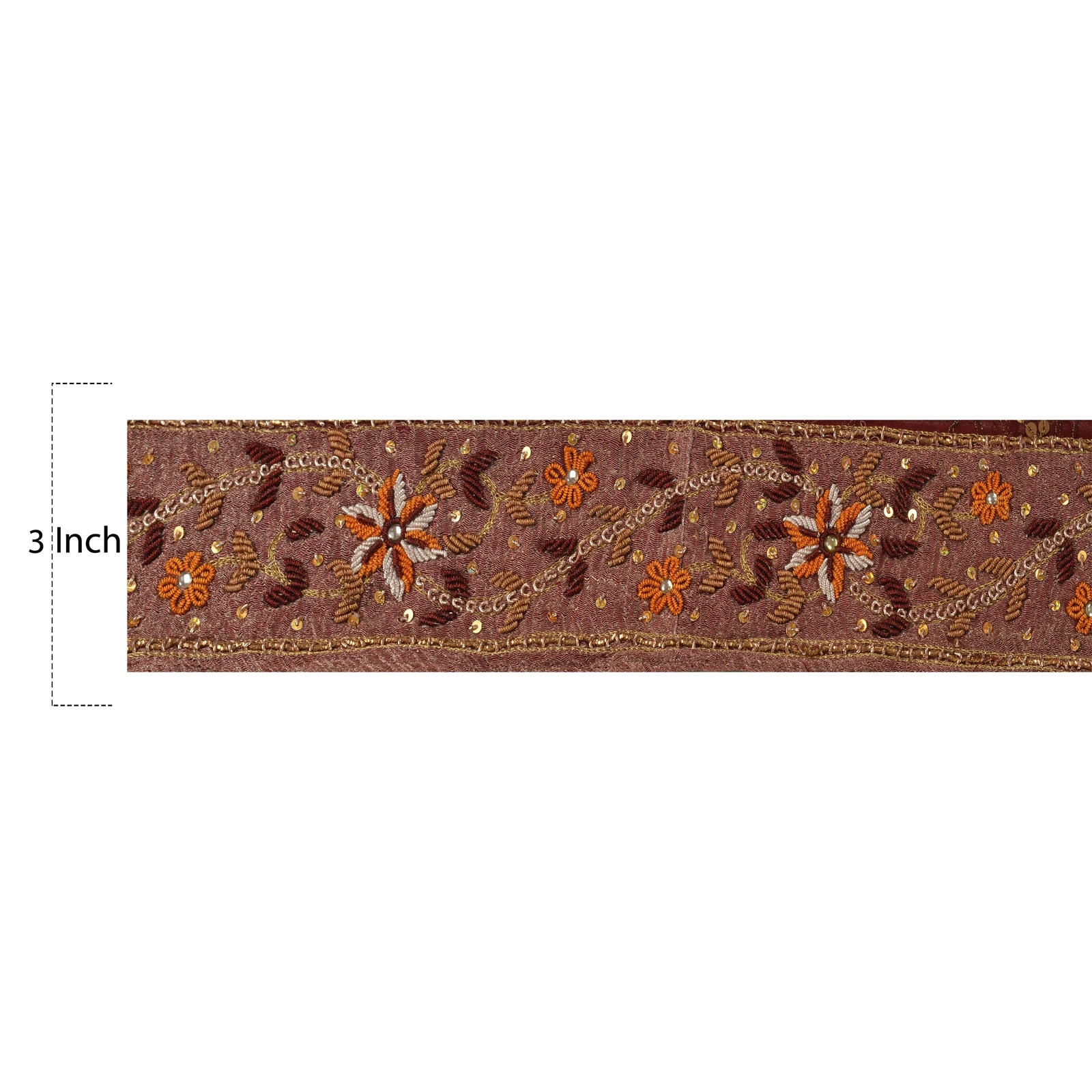 Amazing tissue hand beaded sari border in dark red color highlighting dabka work. Border has beautiful floral patterns painstakingly hand beaded with gold zari/zardozi work, gold/silver/orange/maroon dabka work, gold sequins work. Further you can see fine detailing with white kundan stone, gold Sustainable Fabric patch work. WOW!! an awesome one of a kind versatile border. 1 Quantity = 1 Yard