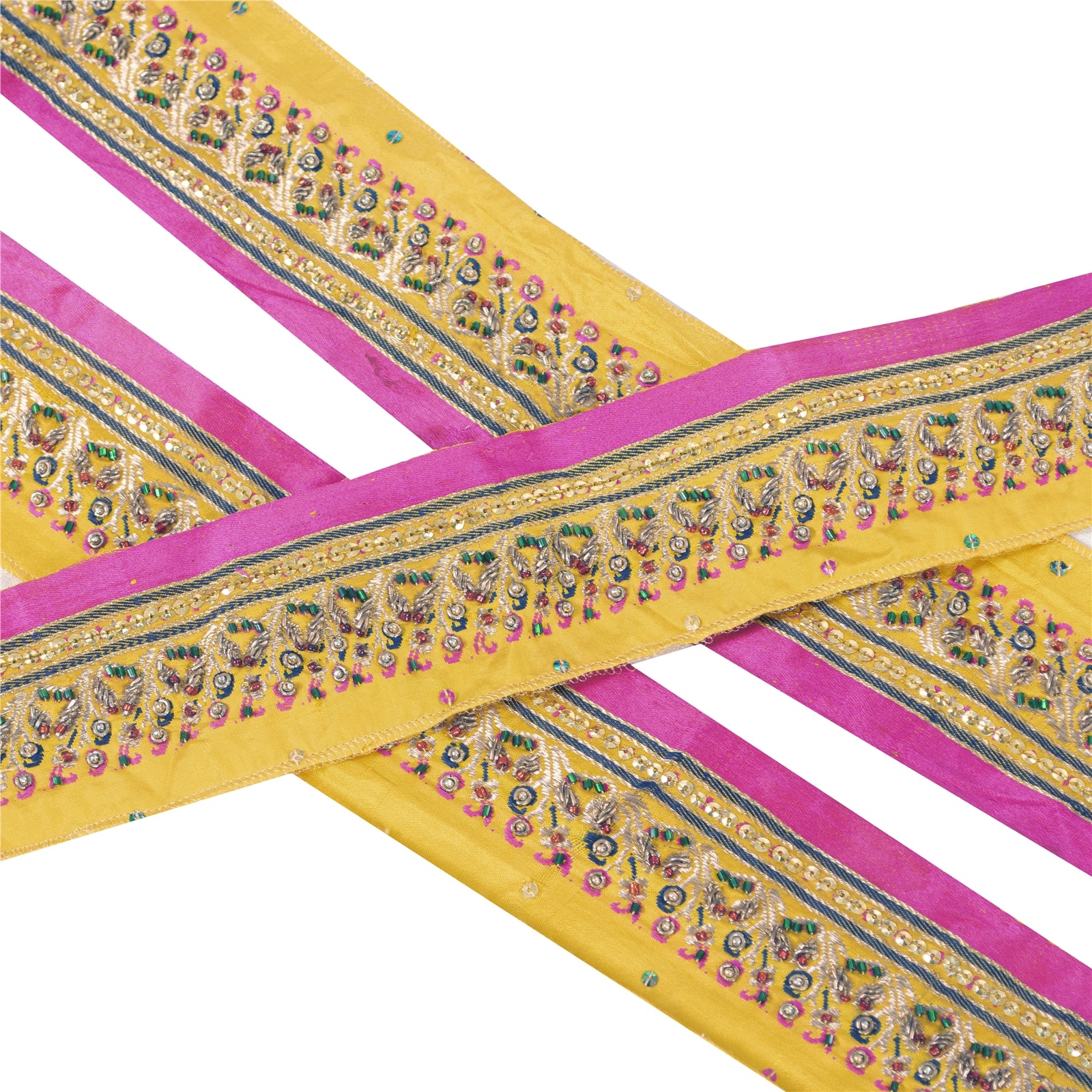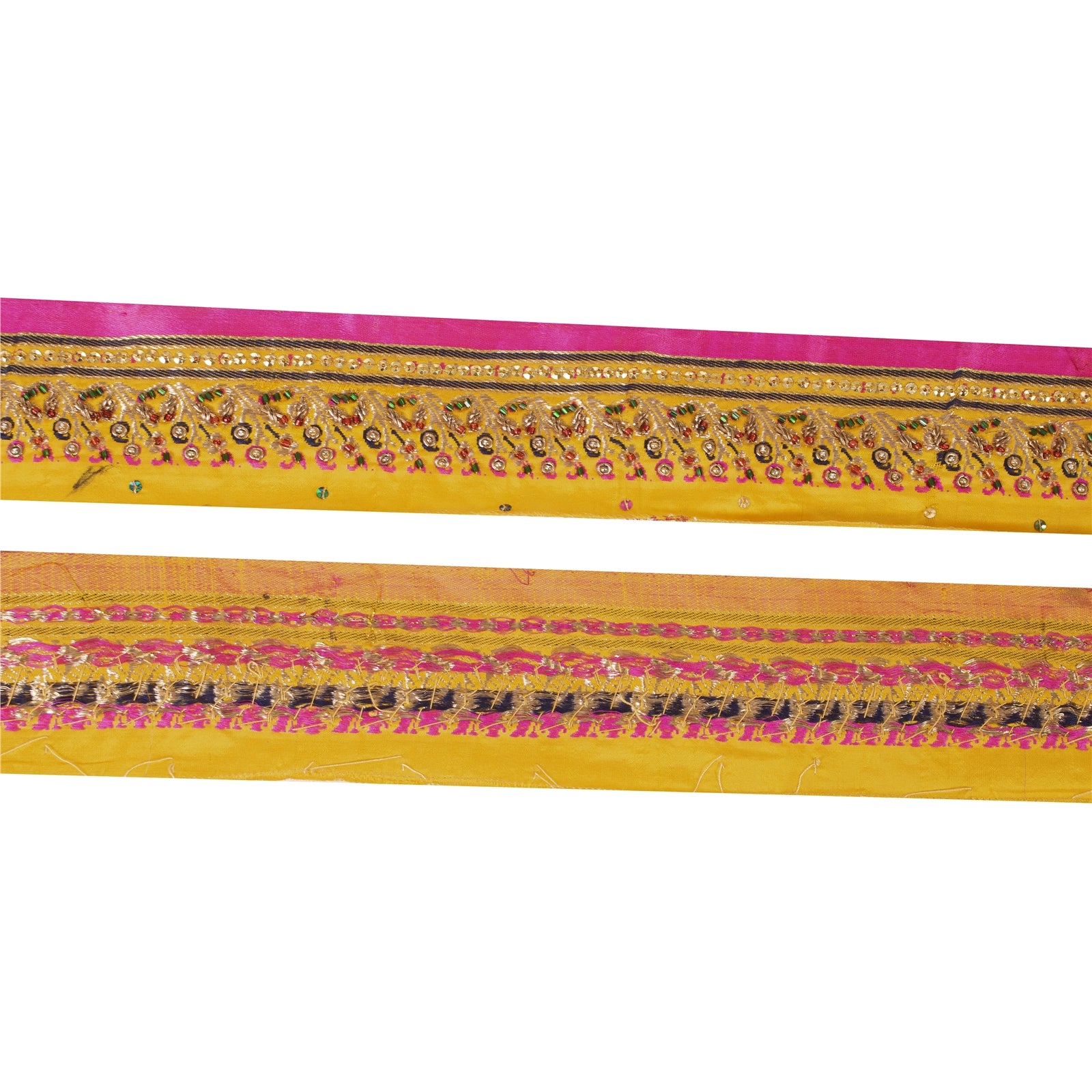 Sanskriti Vintage Sari Border Hand Beaded ZardoziTrims 1YD Yellow Pure Silk Lace