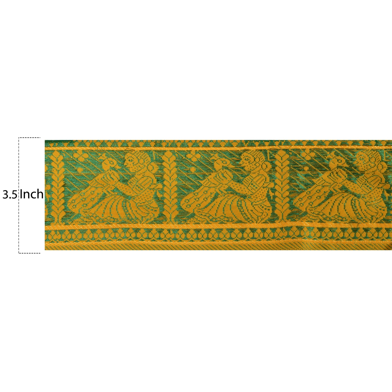 Amazing pure silk woven sari border in yellow color highlighting traditional Baluchari work from Odisha (Eastern India). Border has beautiful woven pattern in green & green color showcasing woman sitting with peacock with floral motifs further add to the beauty of the trim. WOW!! and awesome one of a kind versatile border. 1 quantity = 1 yard B-11916