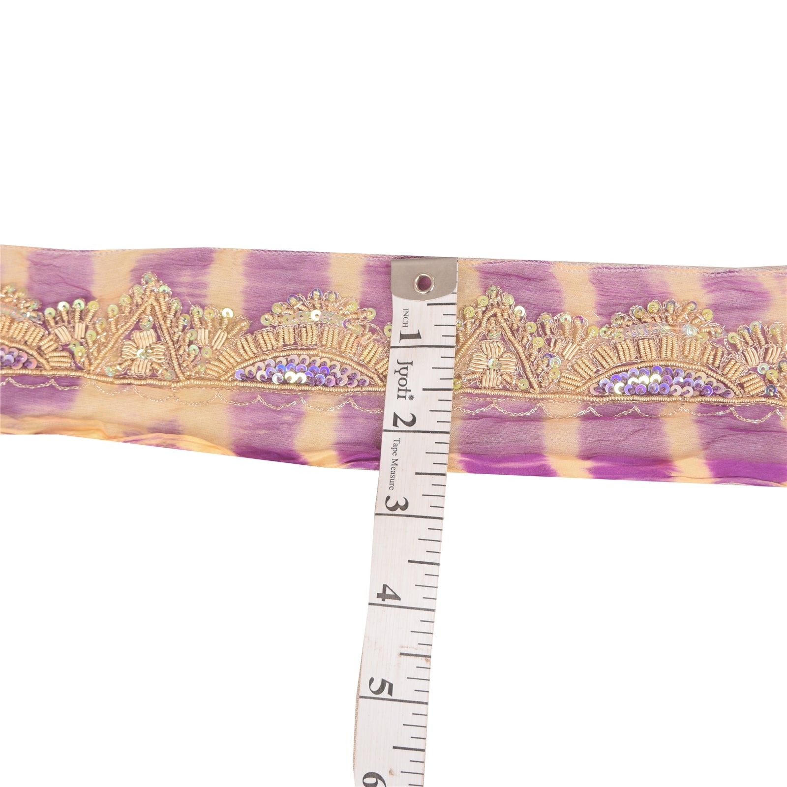 Beautiful pure chiffon silk hand embroidered sari border. Further embellished by gold zari/dabka work, purple thread work. Also, you can see green/purple sequins work along with floral design on purple & cream base fabric. 1 Quantity = 1 Yard B-7270