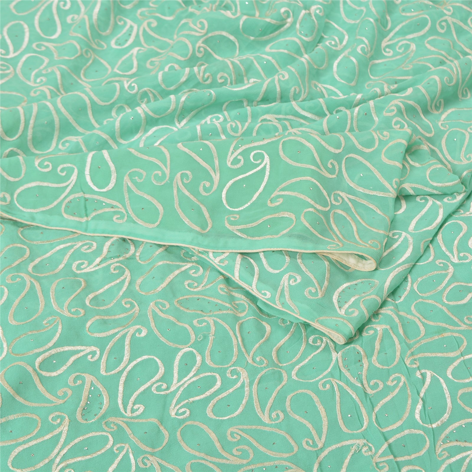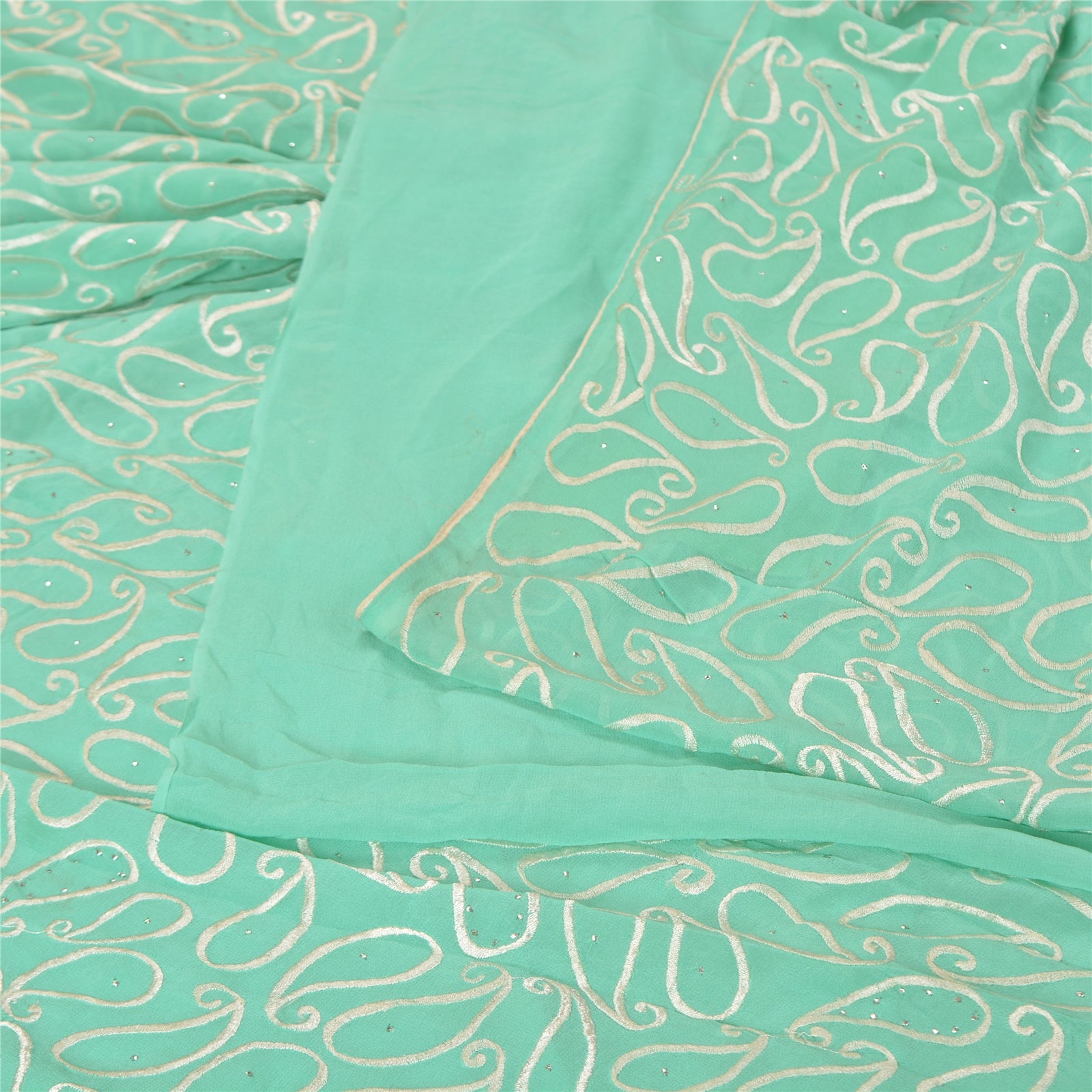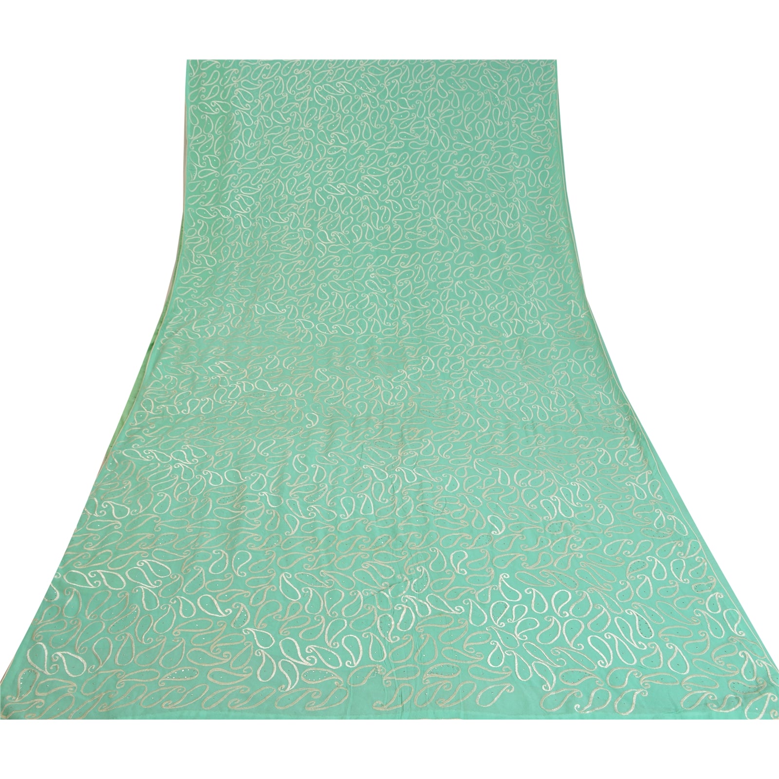 'THE ITEM COLOR OR SHADE MAY BE DARKER OR LIGHTER THAN THE PICTURE.' What a stunning saree highlighting thread work. Base Sustainable Fabric is pure georgette embroidered in sea green color. All over sari has embroidered white thread paisley design with handmade metallic mukeish work makes the saree look fabulous. This unique vintage saree can be used for various crafting ideas even if you don't want to use it as a sari. Design a dress, use it as a throw, as window dressing, upholstery, table linen and much more. Let your creative juices flow and use this decorated Sustainable Fabric in multiple fashion. WOW !! an amazing piece of art. This unique vintage saree can be used for various crafting ideas even if you don't want to use it as a sari. Design a dress, use it as a throw, as window dressing, upholstery, table linen and much more. Let your creative juices flow and use this decorated Sustainable Fabric in multiple fashion. 'International buyers please note: Import duties, taxes, and charges are not included in the item price or postage cost. These charges are the buyer's responsibility. Please check with your country's customs office to determine what these additional costs will be prior to bidding or buying. Buyer will pay custom duty/tax. It is calculated and charged differently by every country. As a seller I do not have any control over it. VAT or sales tax is calculated by the platform at the time of checkout. Customs charge is payable at the time of delivery.