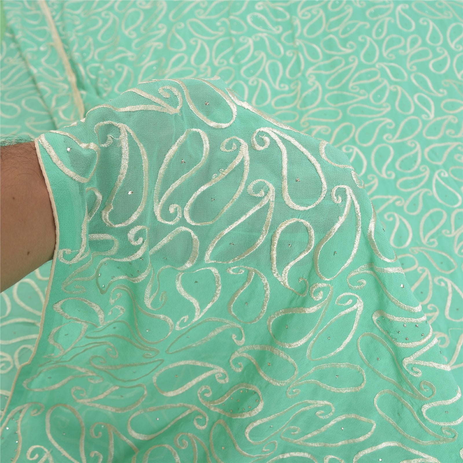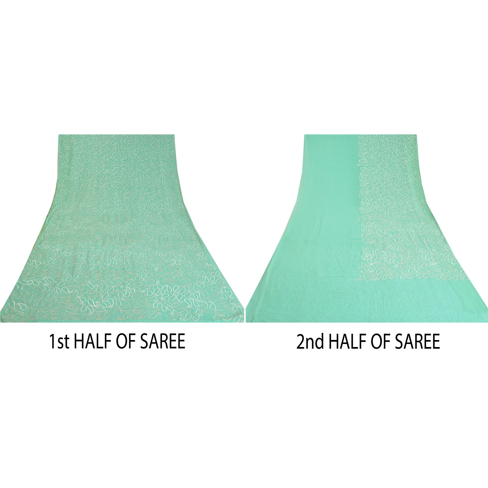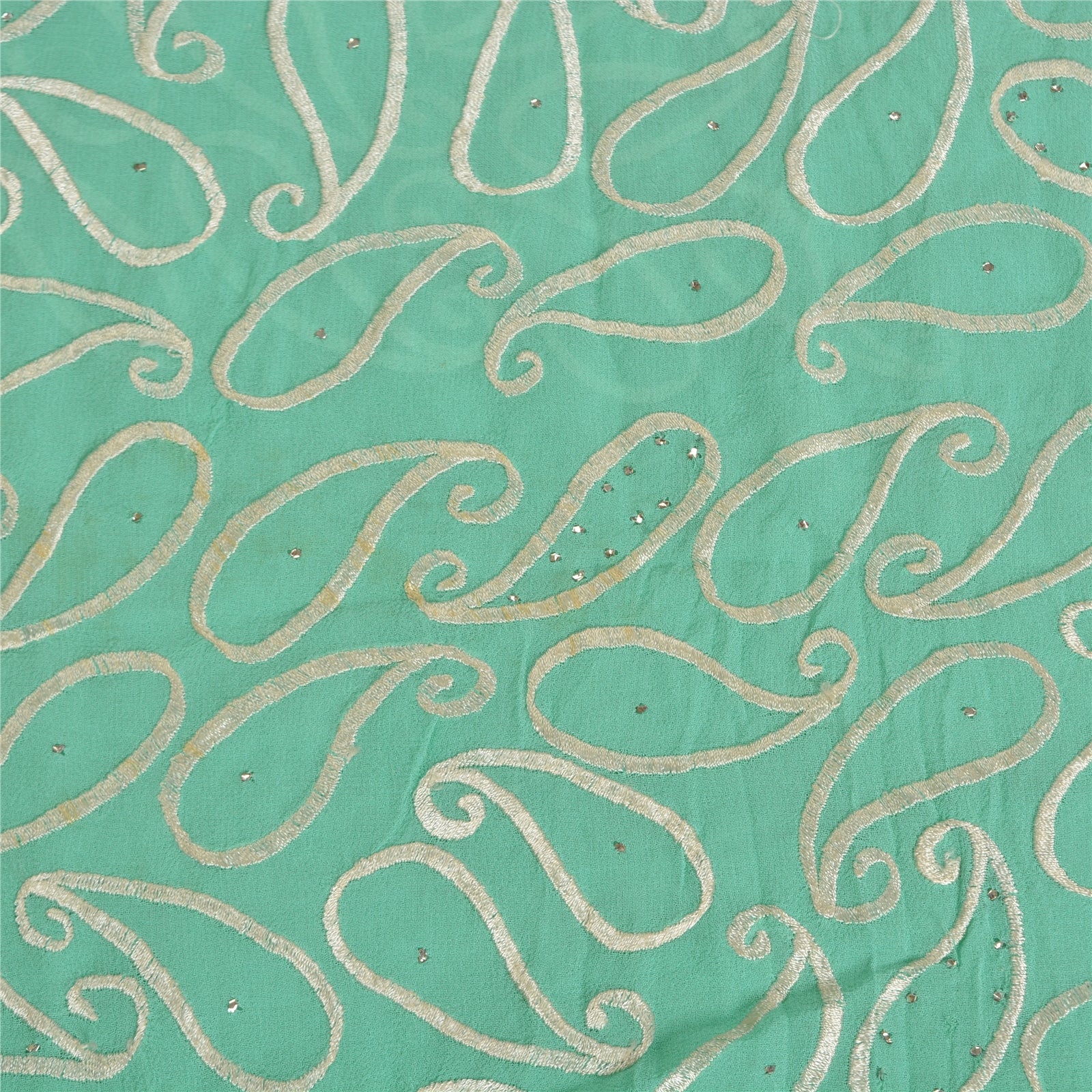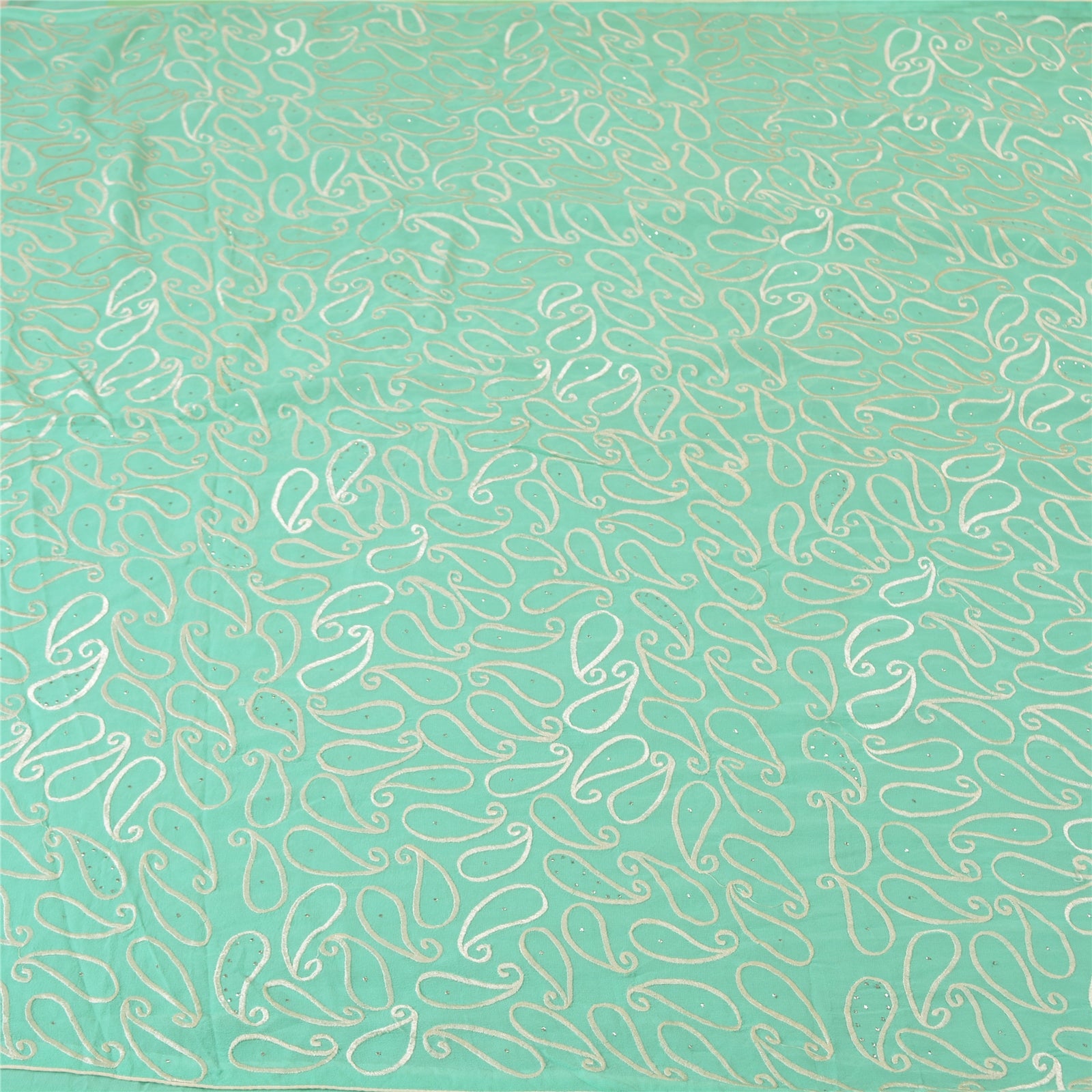 'THE ITEM COLOR OR SHADE MAY BE DARKER OR LIGHTER THAN THE PICTURE.' What a stunning saree highlighting thread work. Base Sustainable Fabric is pure georgette embroidered in sea green color. All over sari has embroidered white thread paisley design with handmade metallic mukeish work makes the saree look fabulous. This unique vintage saree can be used for various crafting ideas even if you don't want to use it as a sari. Design a dress, use it as a throw, as window dressing, upholstery, table linen and much more. Let your creative juices flow and use this decorated Sustainable Fabric in multiple fashion. WOW !! an amazing piece of art. This unique vintage saree can be used for various crafting ideas even if you don't want to use it as a sari. Design a dress, use it as a throw, as window dressing, upholstery, table linen and much more. Let your creative juices flow and use this decorated Sustainable Fabric in multiple fashion. 'International buyers please note: Import duties, taxes, and charges are not included in the item price or postage cost. These charges are the buyer's responsibility. Please check with your country's customs office to determine what these additional costs will be prior to bidding or buying. Buyer will pay custom duty/tax. It is calculated and charged differently by every country. As a seller I do not have any control over it. VAT or sales tax is calculated by the platform at the time of checkout. Customs charge is payable at the time of delivery.