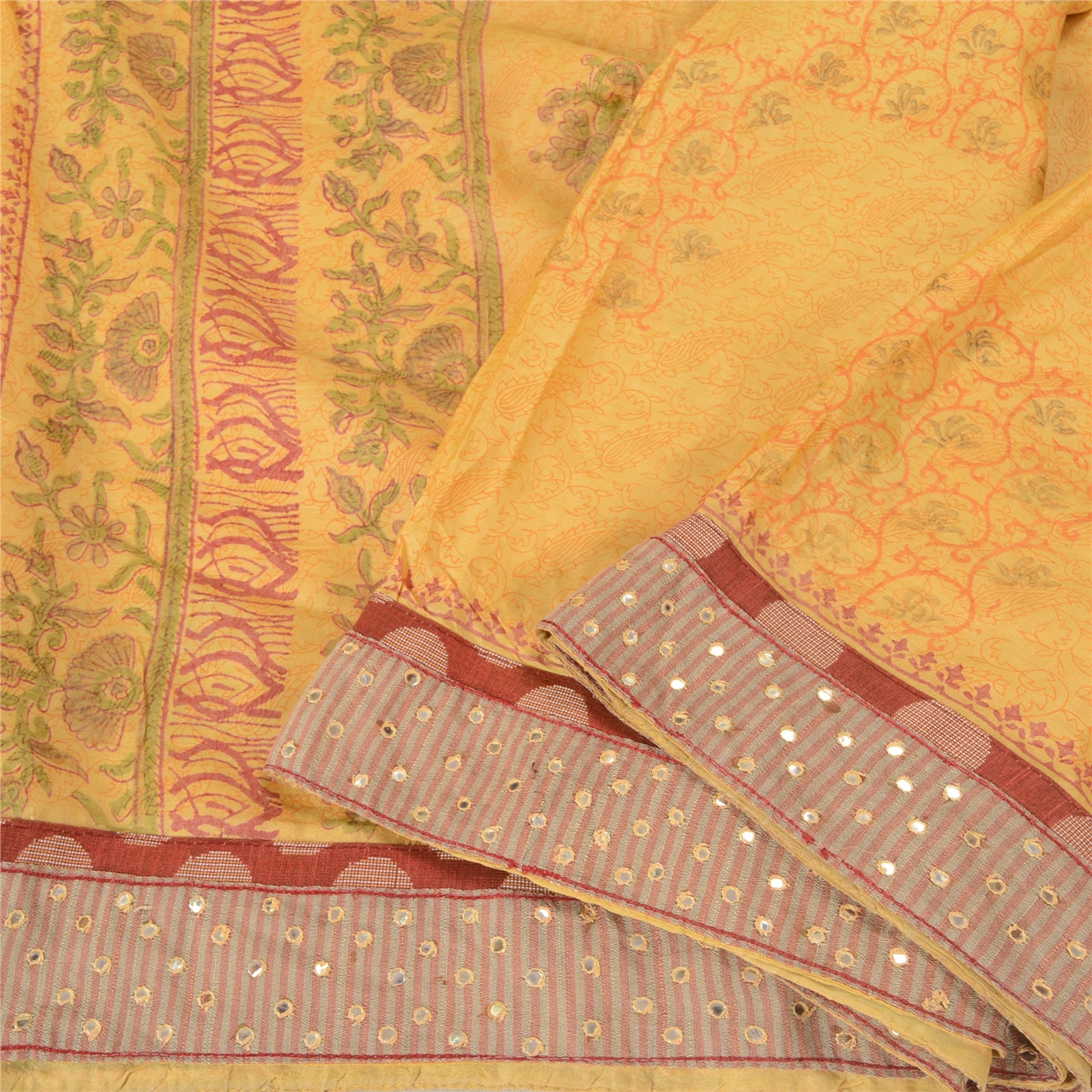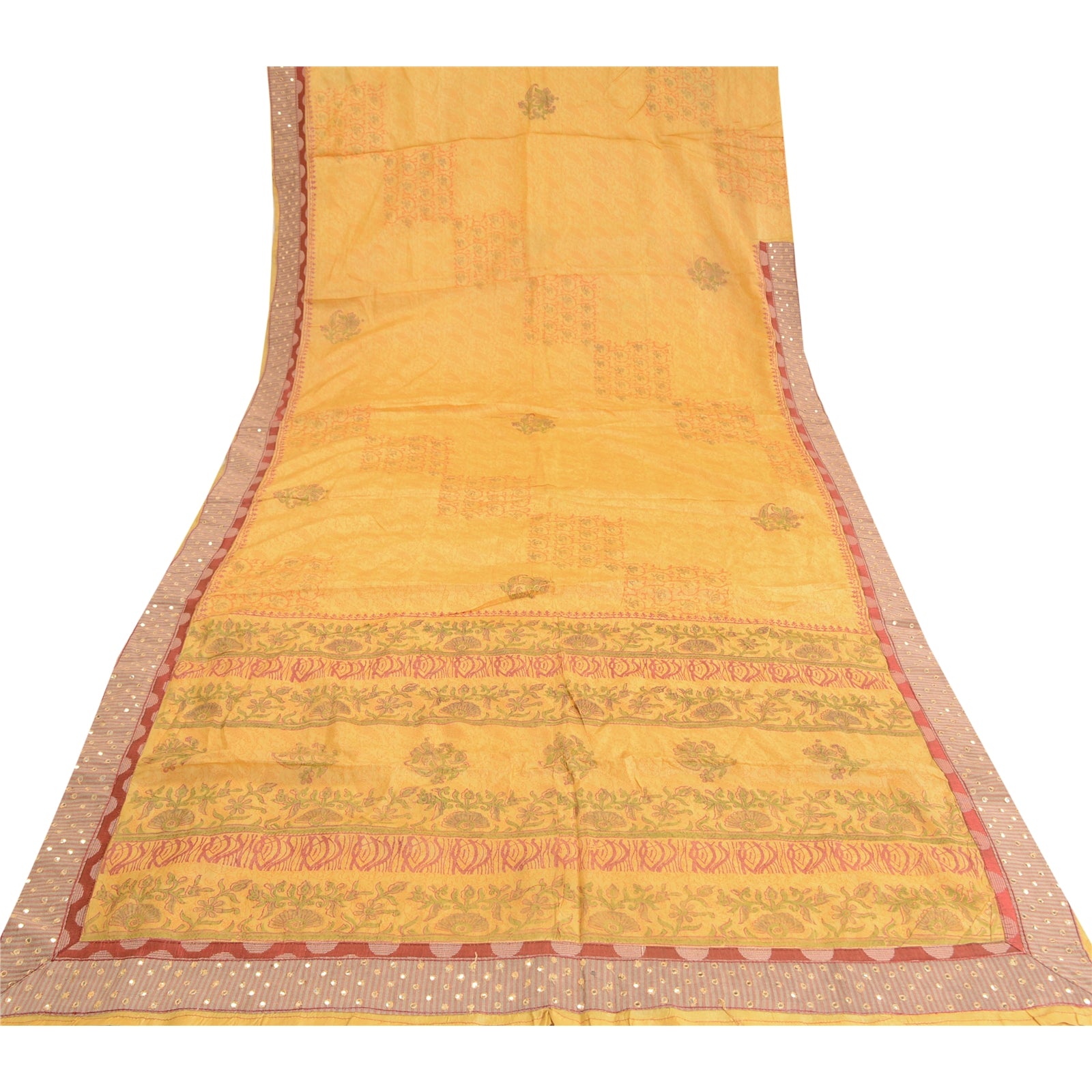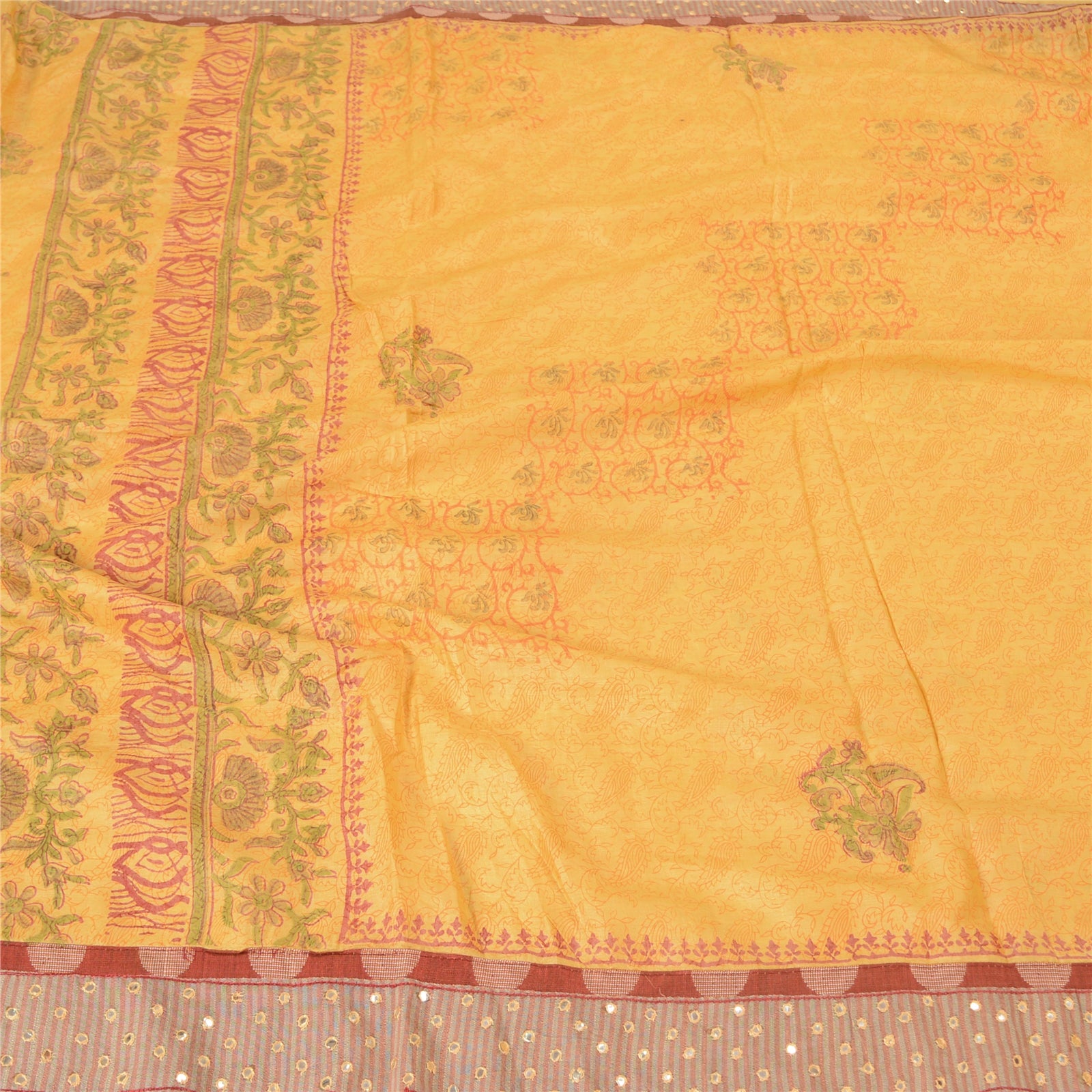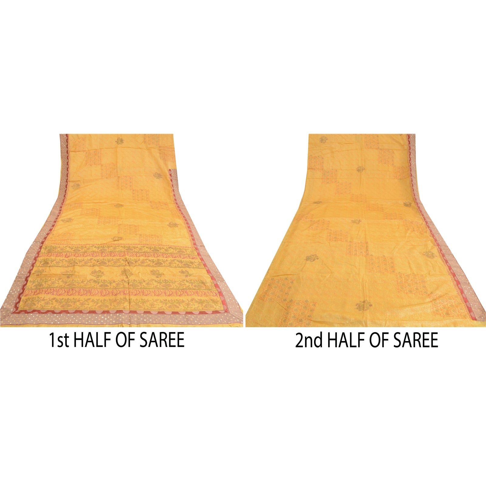 'THE ITEM COLOR OR SHADE MAY BE DARKER OR LIGHTER THAN THE PICTURE.' Beautiful yellow colored pure silk embroidered hand-block printed sari. Pallu & border features hand-block printed floral design. Also you can see embroidered Sustainable Fabric patch work. The center of the saree has hand-block printed floral design. This saree can be used for various crafting ideas too. Use it for dress designing, as a throw, as window dressing, upholstery, table linen and much more. Let your creative juices flow. 'International buyers please note: Import duties, taxes, and charges are not included in the item price or postage cost. These charges are the buyer's responsibility. Please check with your country's customs office to determine what these additional costs will be prior to bidding or buying. Buyer will pay custom duty/tax. It is calculated and charged differently by every country. As a seller I do not have any control over it. VAT or sales tax is calculated by the platform at the time of checkout. Customs charge is payable at the time of delivery.'