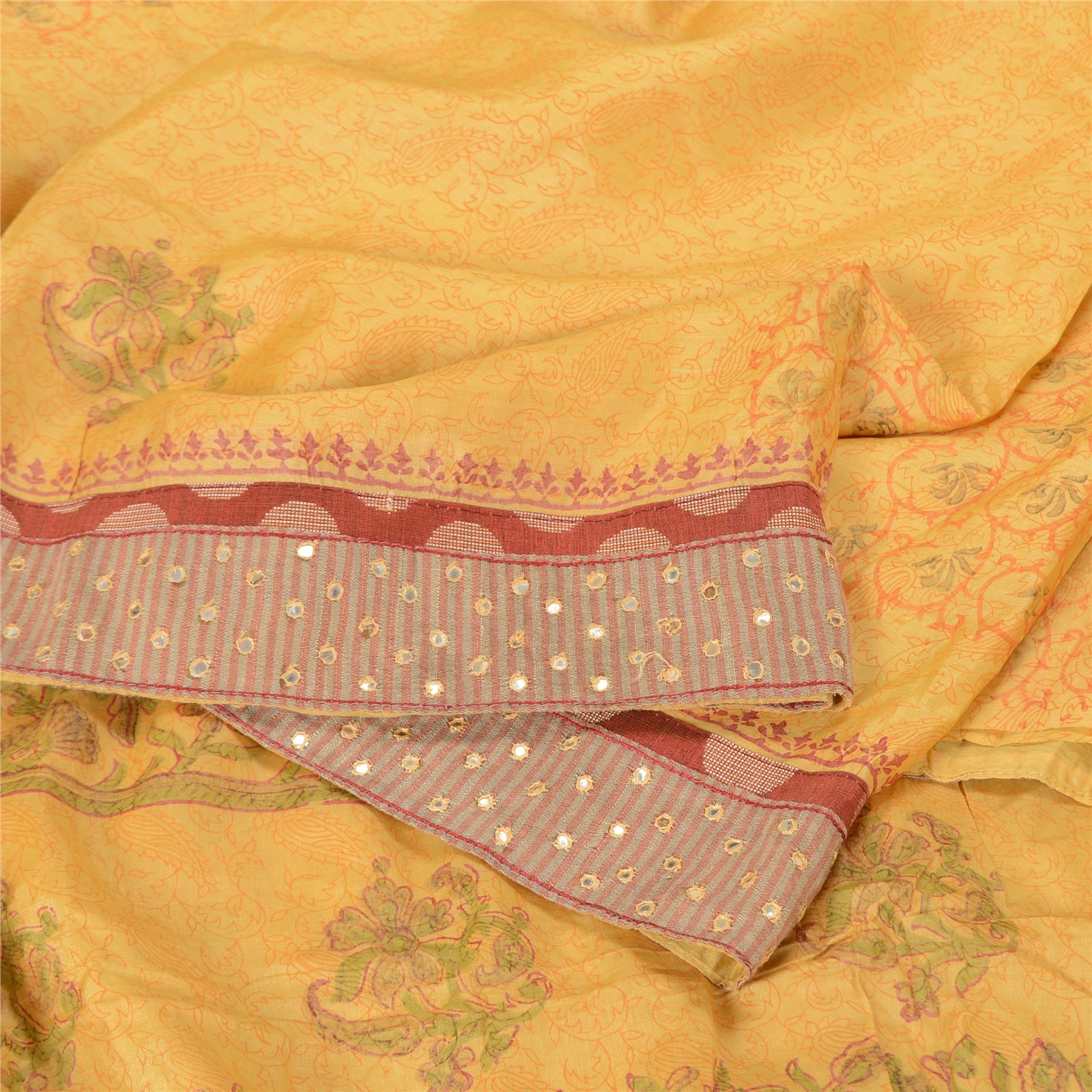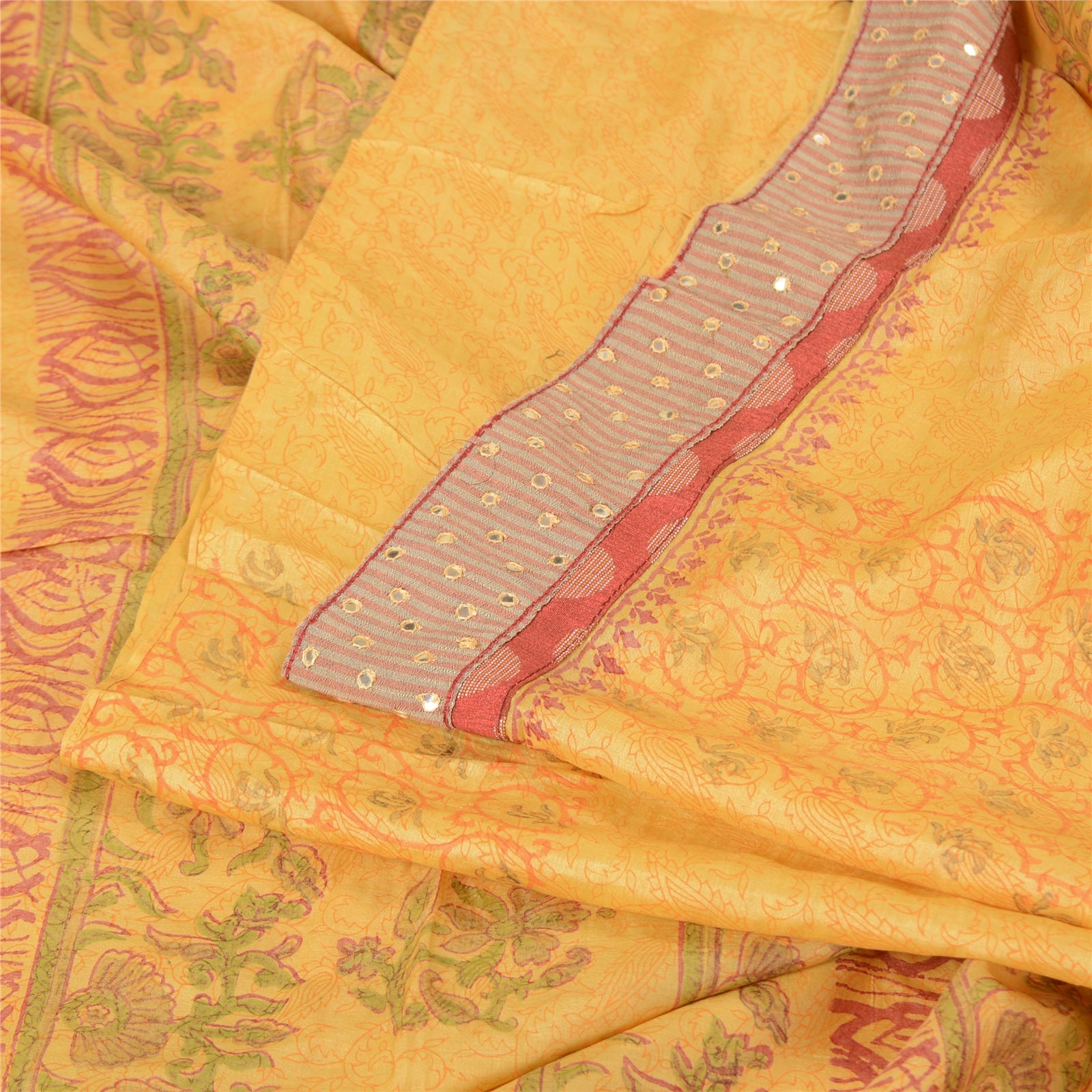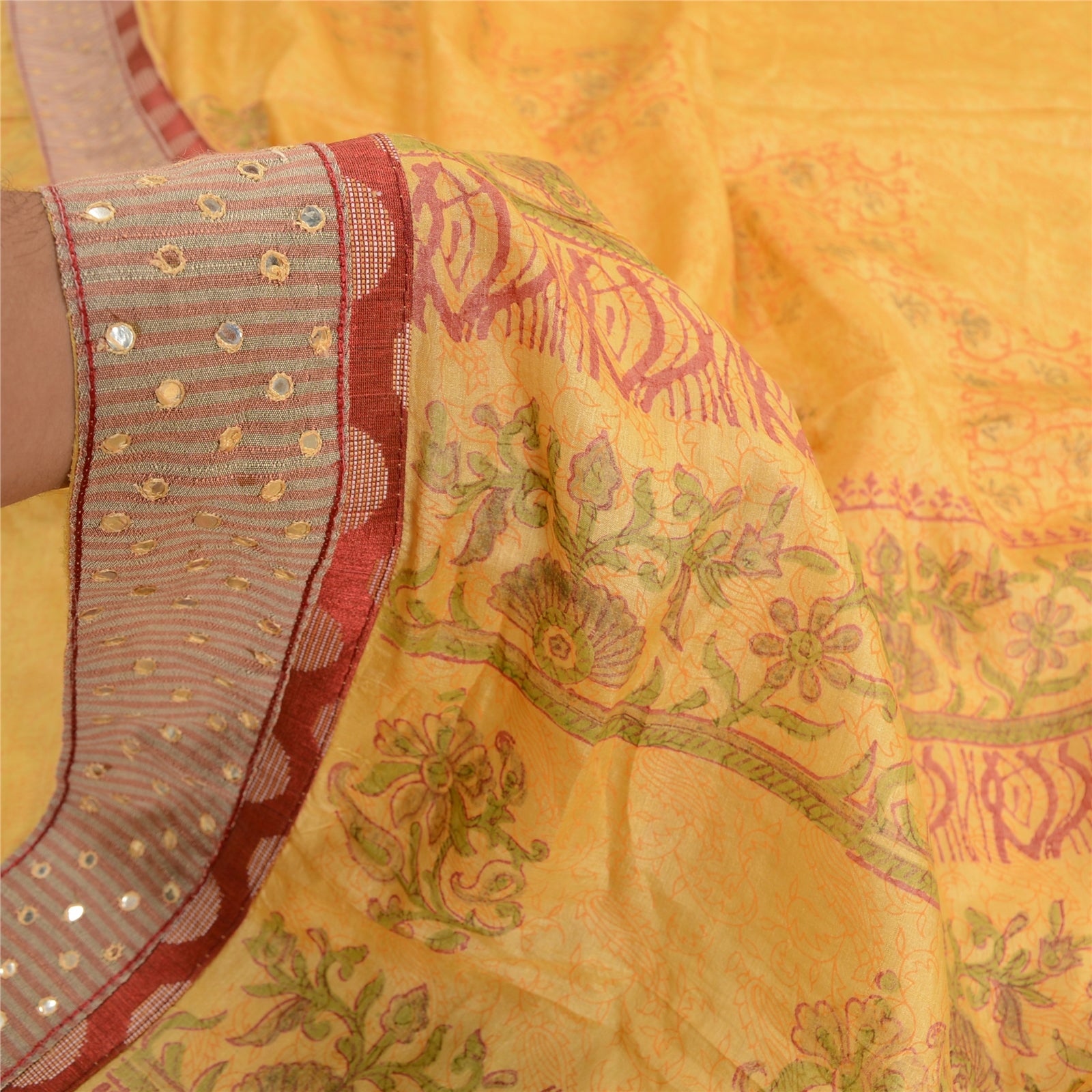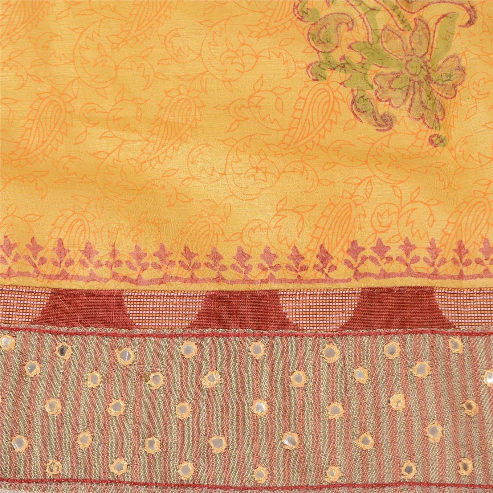 'THE ITEM COLOR OR SHADE MAY BE DARKER OR LIGHTER THAN THE PICTURE.' Beautiful yellow colored pure silk embroidered hand-block printed sari. Pallu & border features hand-block printed floral design. Also you can see embroidered Sustainable Fabric patch work. The center of the saree has hand-block printed floral design. This saree can be used for various crafting ideas too. Use it for dress designing, as a throw, as window dressing, upholstery, table linen and much more. Let your creative juices flow. 'International buyers please note: Import duties, taxes, and charges are not included in the item price or postage cost. These charges are the buyer's responsibility. Please check with your country's customs office to determine what these additional costs will be prior to bidding or buying. Buyer will pay custom duty/tax. It is calculated and charged differently by every country. As a seller I do not have any control over it. VAT or sales tax is calculated by the platform at the time of checkout. Customs charge is payable at the time of delivery.'