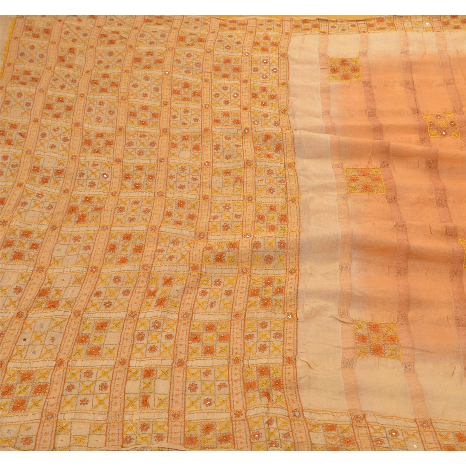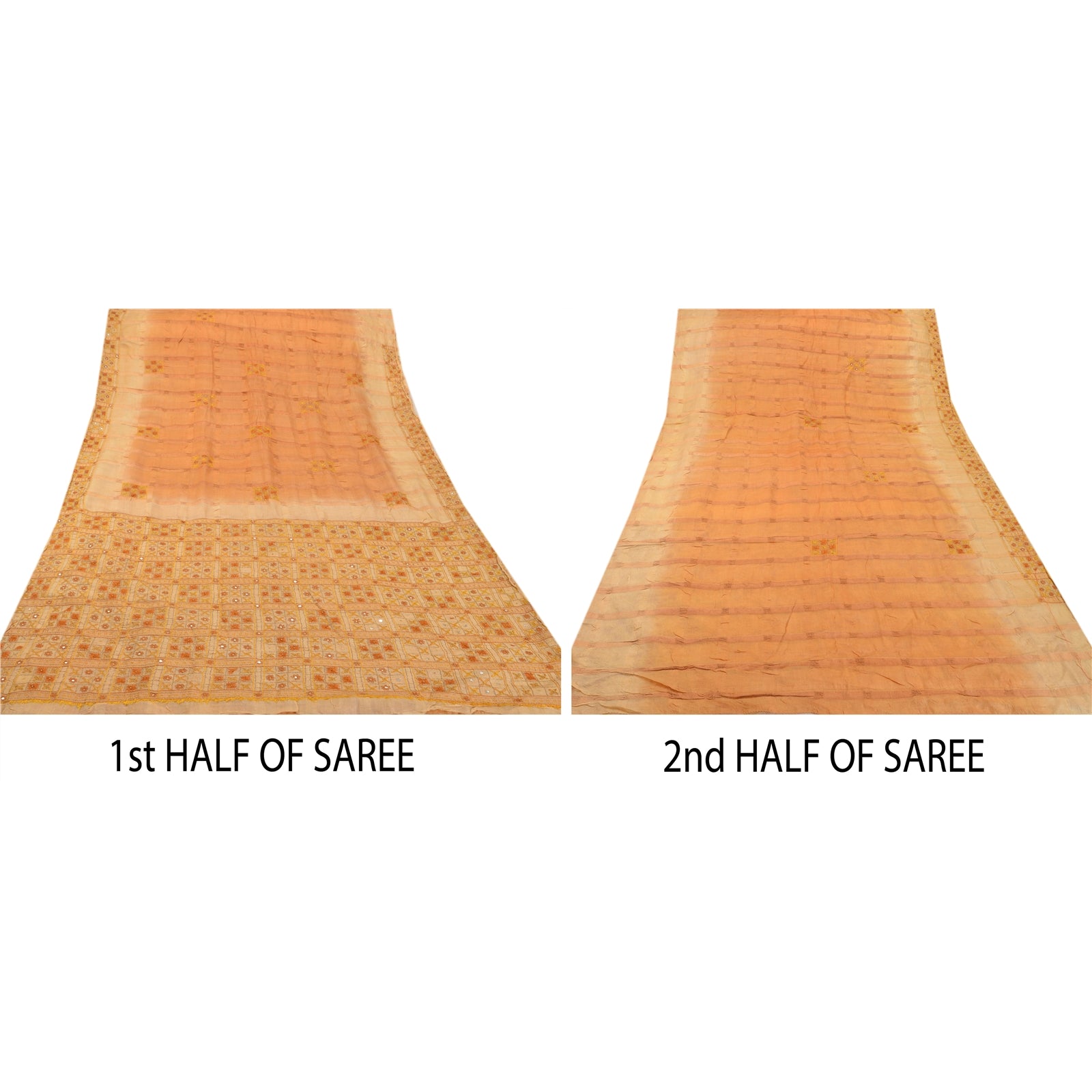 Attractive Orange And Cream colored hand Embroidered 100% pure Silk sari. Pallu & Border features floral design embellished with golden Zari and golden beads work along with multi color thread work and mirror work looks amazing. There are floral motifs with similar work in center part of sari. Silk is a natural protein fiber, some forms of which can be woven into textiles. The shimmering appearance of silk is due to the triangular prism-like structure of the silk fiber, which allows silk cloth to refract incoming light at different angles, thus producing different colors Sparkling mirror work with floral design on Orange and cream color base Sustainable Fabric is really enhancing the beauty of the saree.