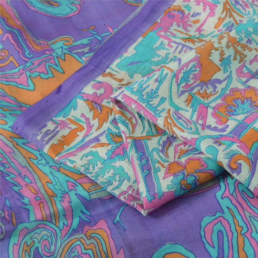 Sanskriti Vintage Sarees Purple Pure Crepe Silk Printed Sari 5+yd Craft Fabric