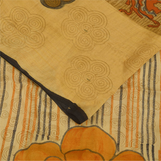 Sanskriti Vintage Sarees Yellow Pure Crepe Silk Printed Sari 5+yd Craft Fabric