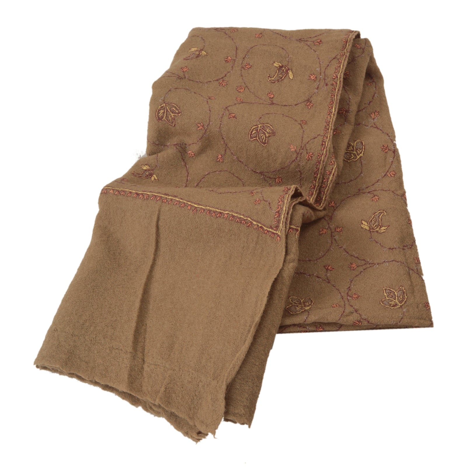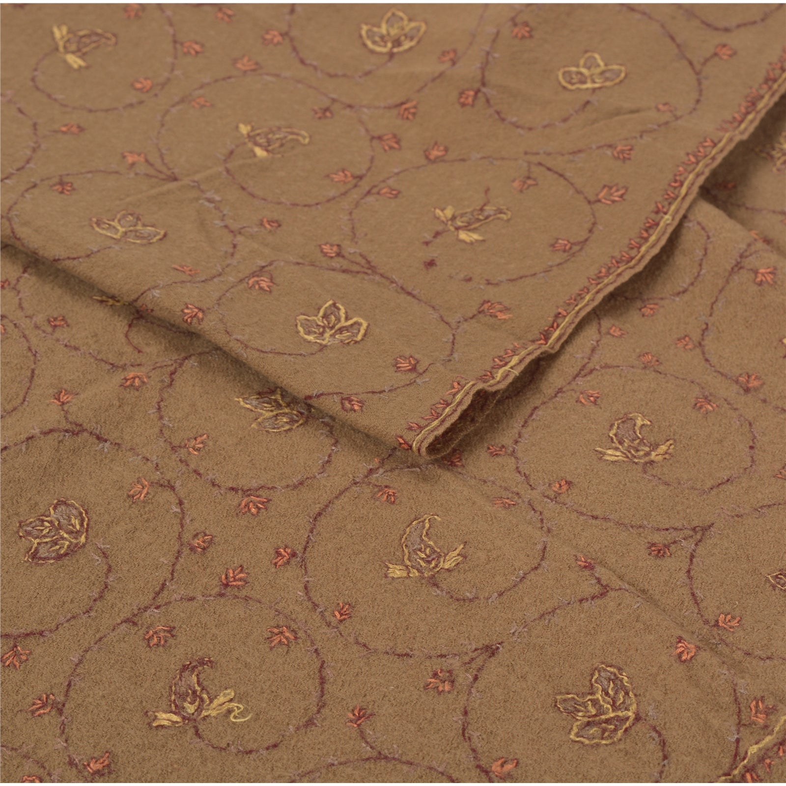 We are offering you a vintage brown woolen stole which adorns hand embroidered Suzani work. The shawl or stole features floral & paisley design which is embellished with multicolor woven & pink/peach threads work. It's has cram fringes. This cozy, warm and fuzzy stole is soft against skin due to the mellow woolen Sustainable Fabric. A truly gorgeous piece which will also make an admirable gift. Suzani is a type of embroidered and decorative tribal textile made in Tajikistan, Uzbekistan, Kazakhstan and other Central Asian countries. Suzani is from the Persian word 'Suzan' which means needle. The art of making such textiles in Iran is called Suzandozi (needlework).