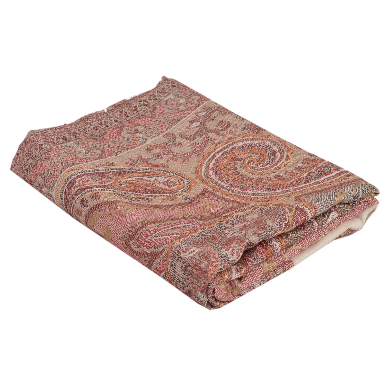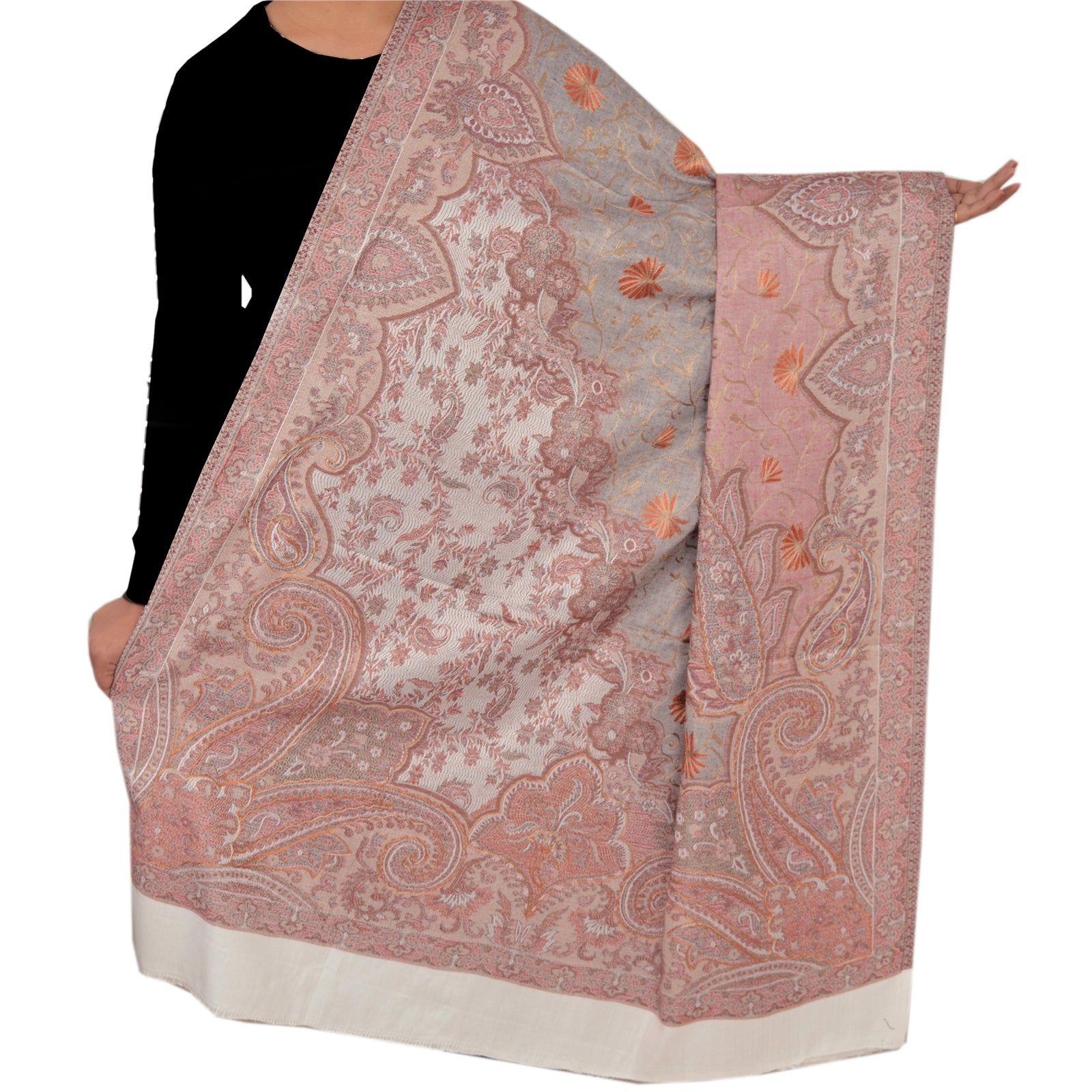 We are offering a white coloured poly wool shawl with woven work and aari work. Woven Sustainable Fabric is any textile formed by weaving. A woven Sustainable Fabric is any Sustainable Fabric made by interlacing two or more threads at right angles to one another. Aari work involves a hook, plied from the top but fed by silk thread from below with the material spread out on a frame. This movement creates loops, and repeats of these lead to a line of chain stitches. This shawl has a white color base which is fully woven in multi colored threads like blue, orange, Red , black and white in floral designs all over along with orange and cream color aari work. Border has Paisley designs all over. Cozy and comfortable, you can wear this versatile piece as a scarf, stole or wrap on any dress. It is good for cold weather since it is warm.
