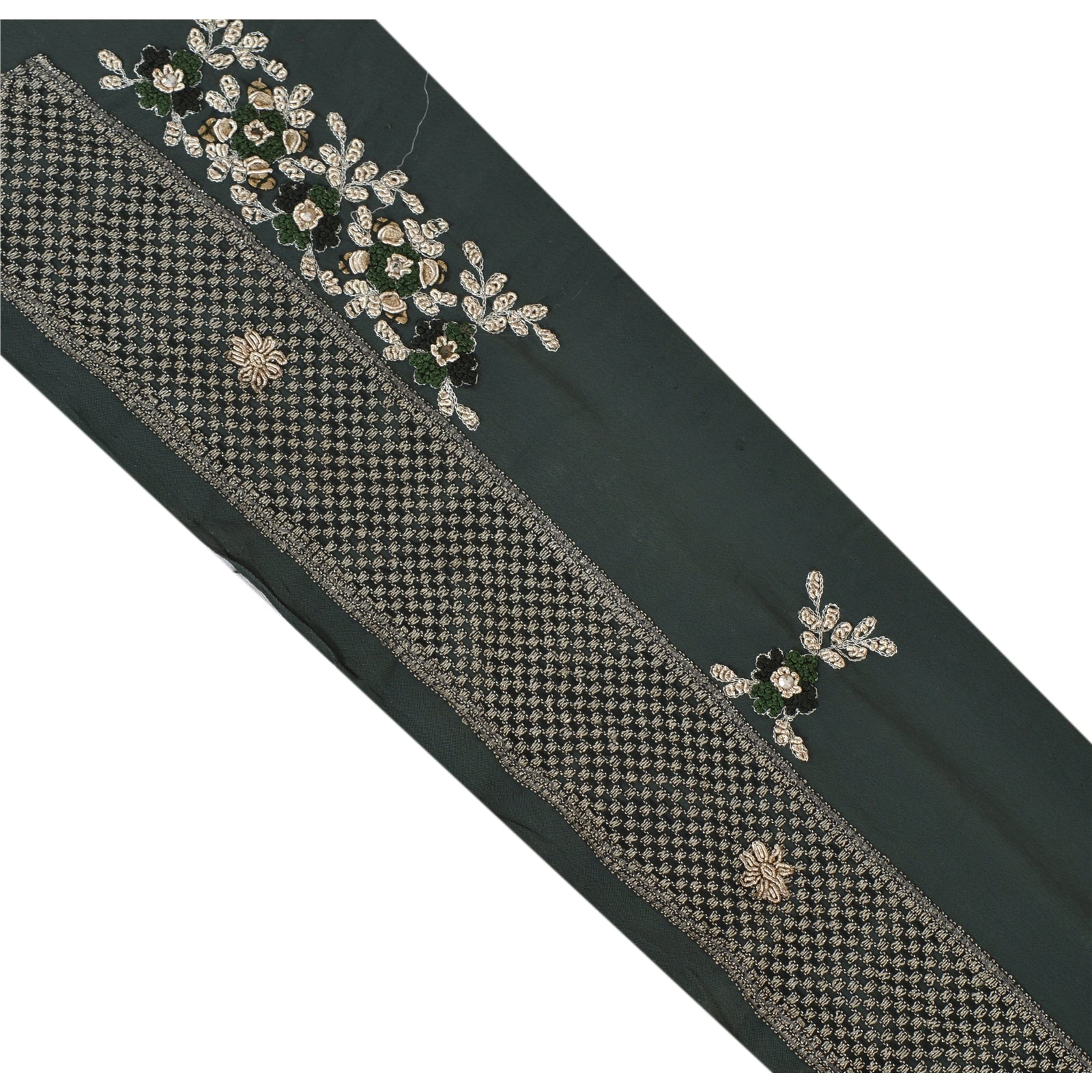 Excellent crepe silk hand beaded sari border in green color highlighting zardozi work. Border has beautiful floral patterns painstakingly hand beaded with silver zari/zardozi work, green thread work . Further you can see fine detailing with white white rhinestone, silver lace work. WOW!! an awesome one of a kind versatile border. 1 Quantity = 5 Yard