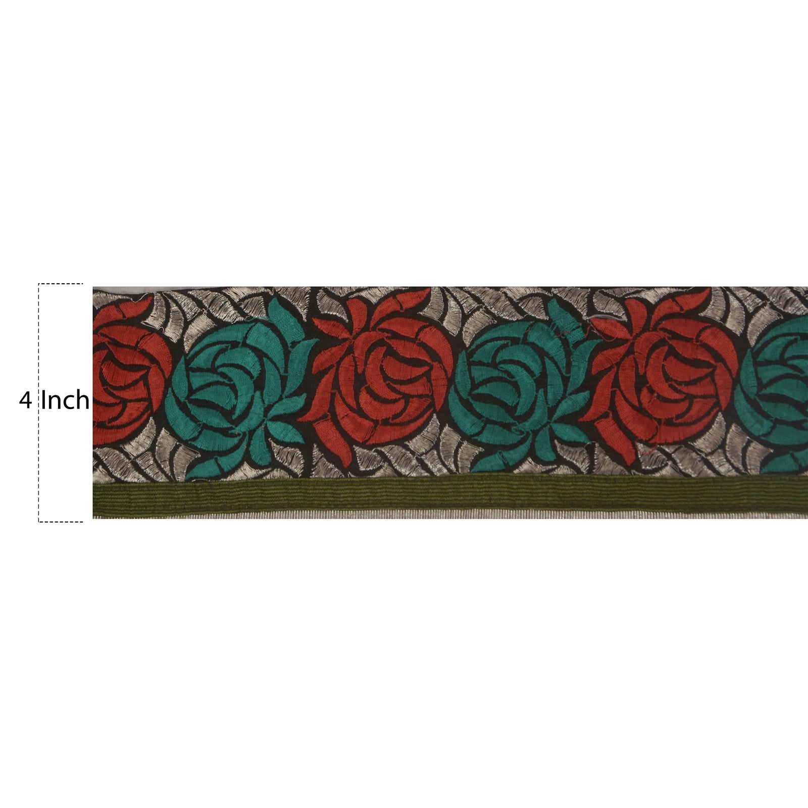 Fabulous cotton embroidered sari border in black color highlighting thread work. Border has beautiful floral patterns painstakingly embroidered with multi color thread work . Further you can see fine detailing with green Sustainable Fabric patch, silver lace work . WOW!! an awesome one of a kind versatile border. 1 Quantity = 6 Yard