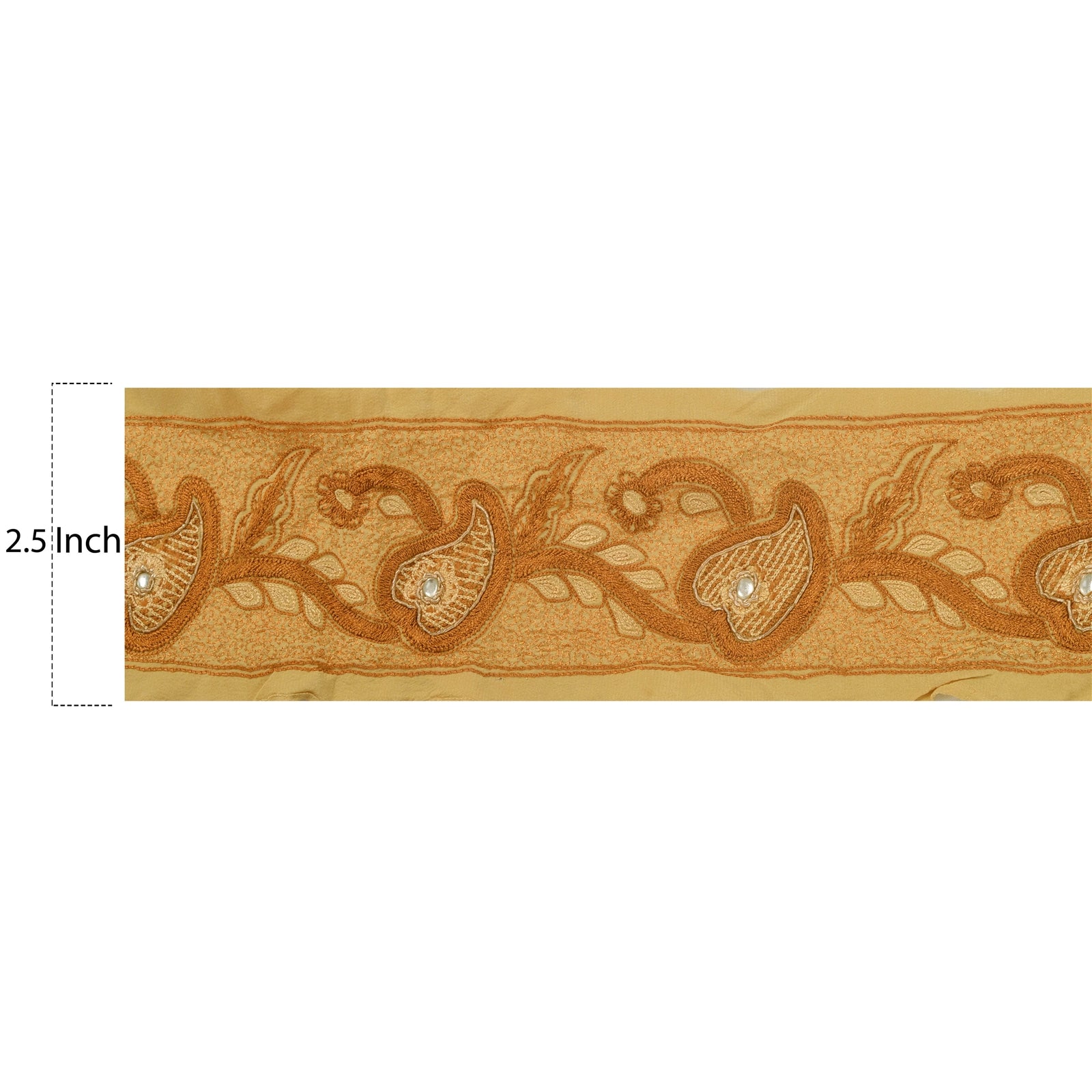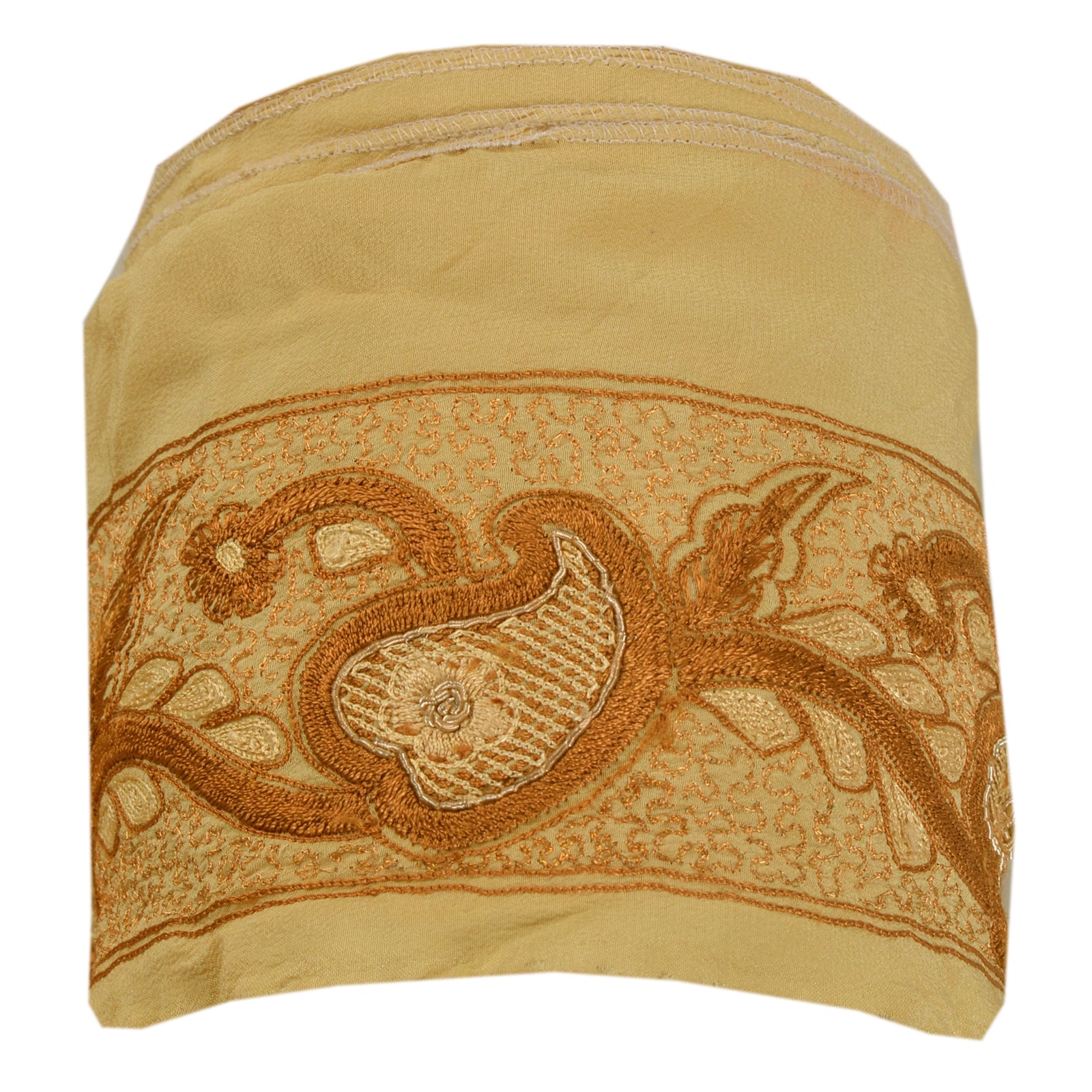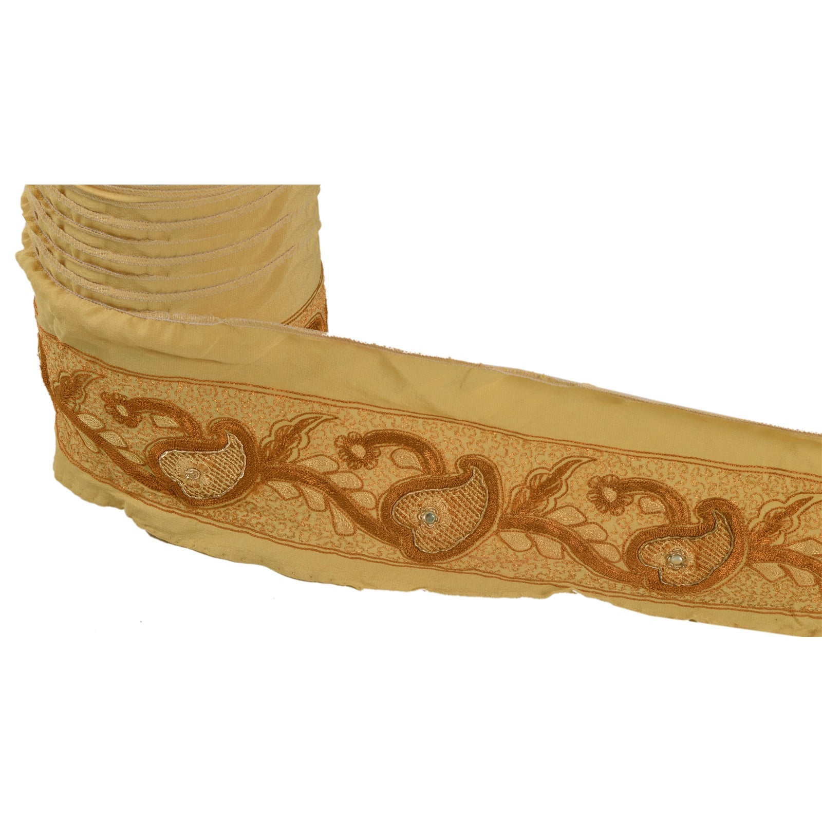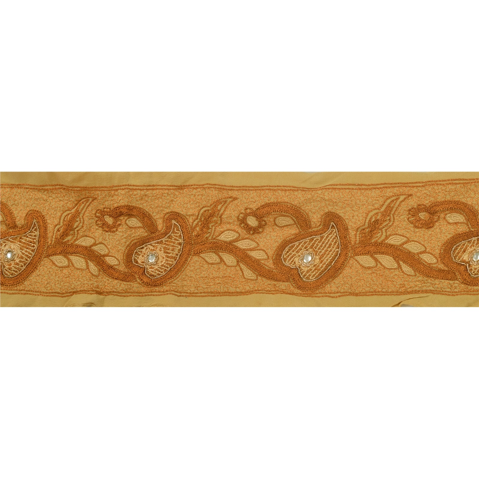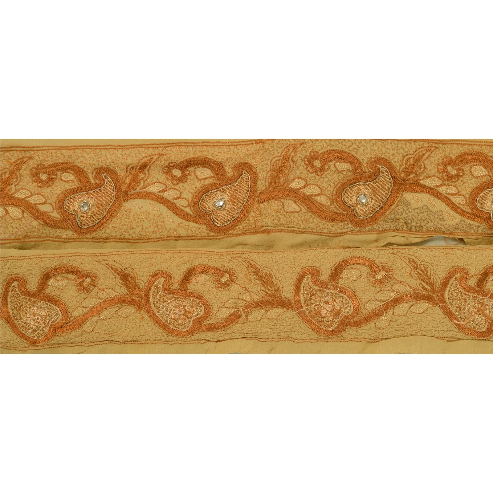 Fabulous crepe silk hand beaded sari border in cream color highlighting kundan stone work. Border has beautiful floral & paisley patterns painstakingly hand beaded with brown thread work, white kundan stone work. Further you can see fine detailing with golden zari/zardozi work. WOW!! an awesome one of a kind versatile border. 1 Quantity = 1 Yard