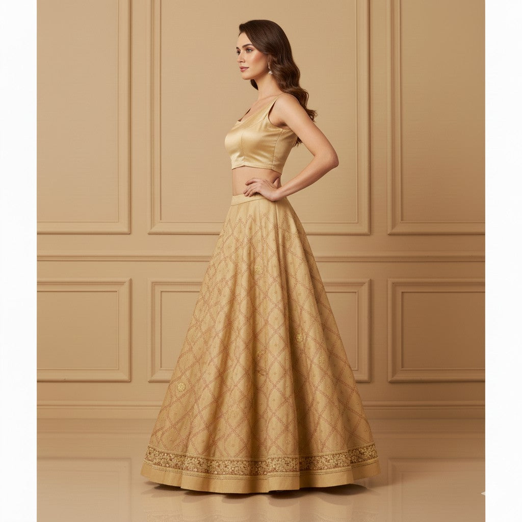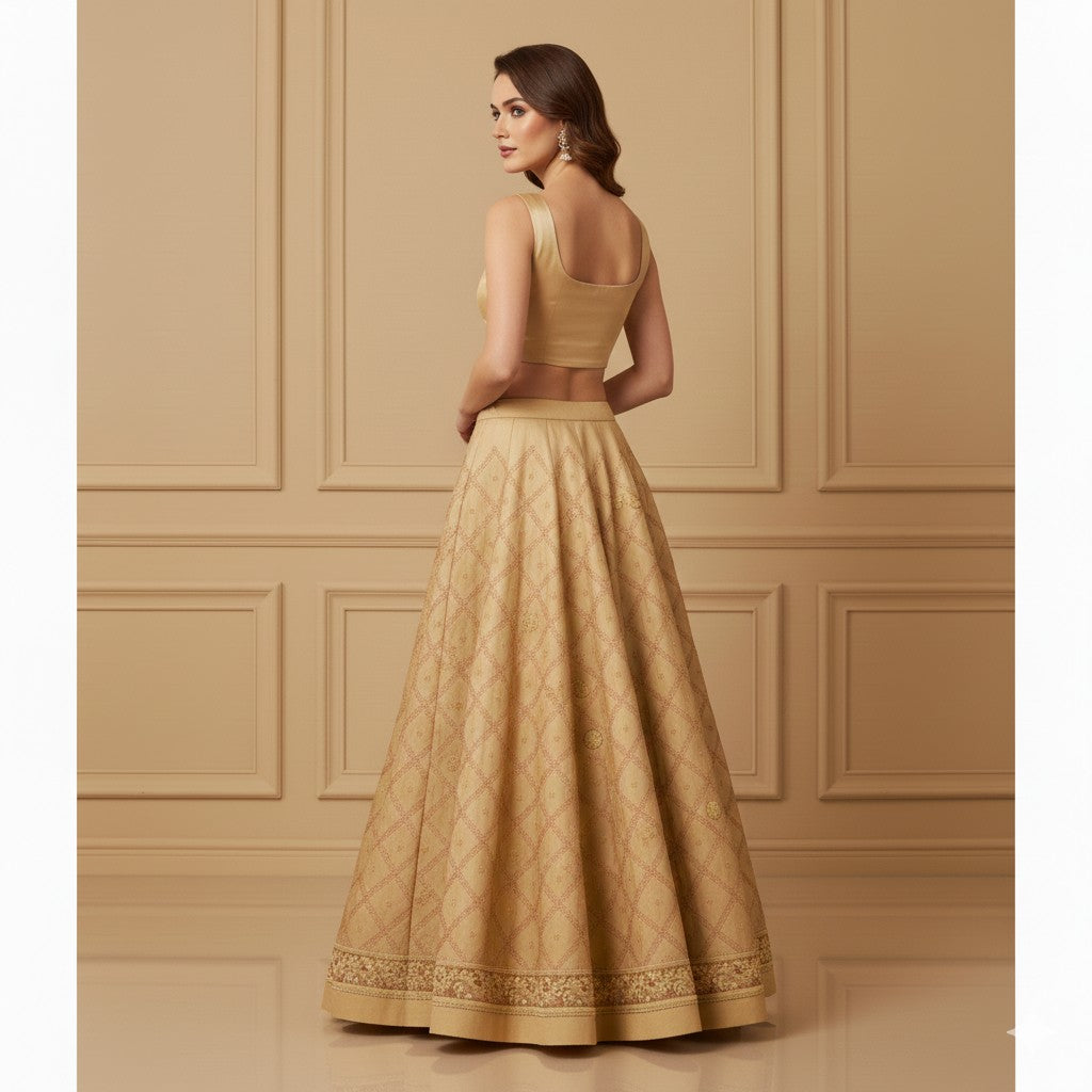 Sanskriti Vintage Beige Long Unstitch Lehenga Pure Satin Hand Embroidery Zardozi