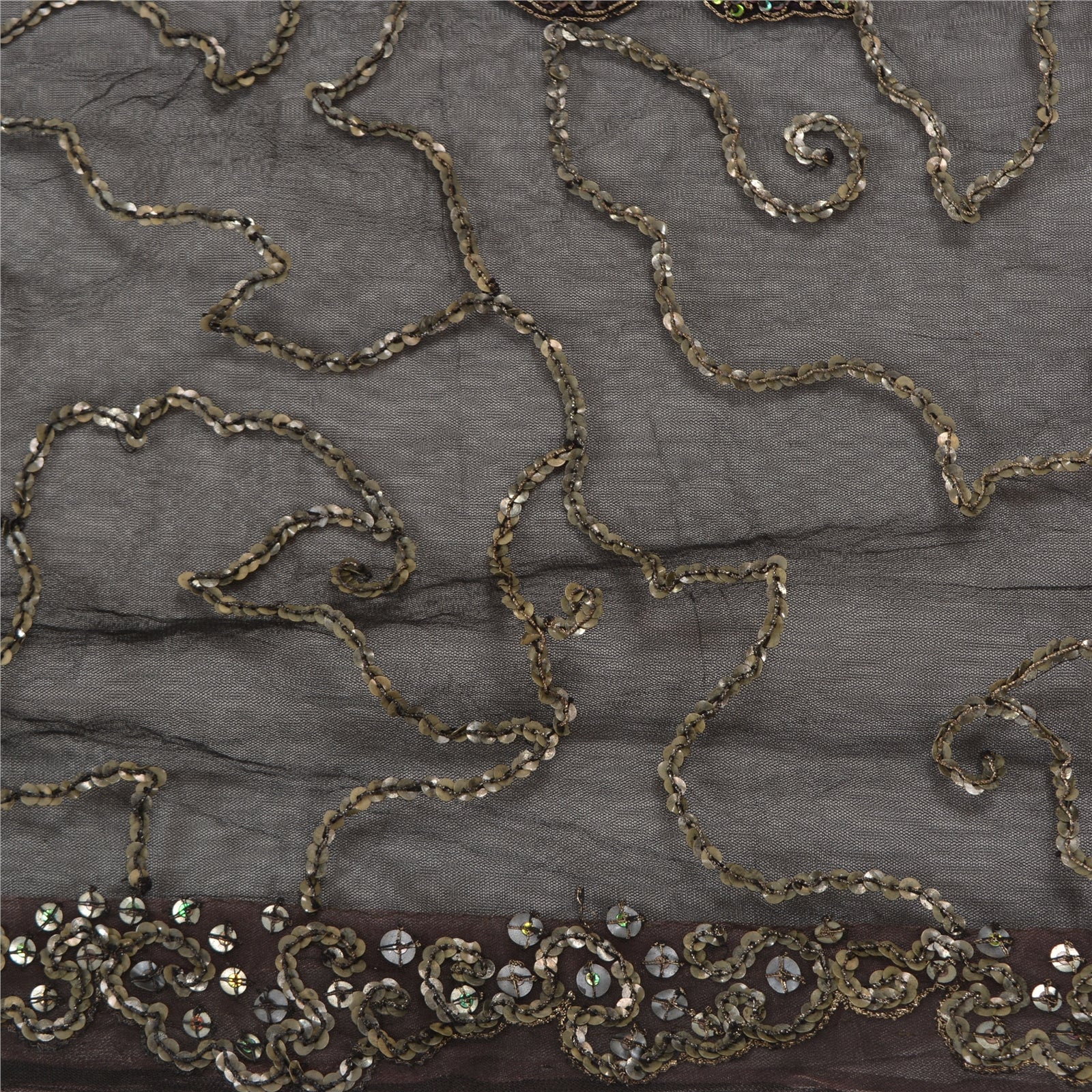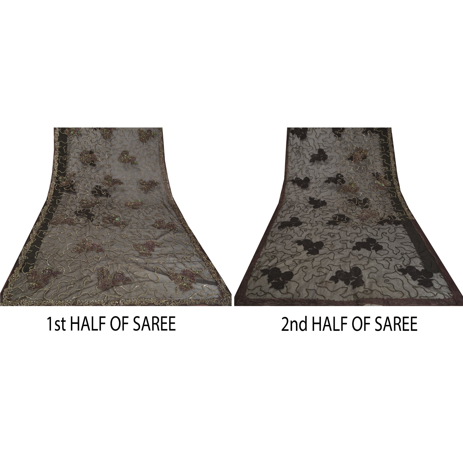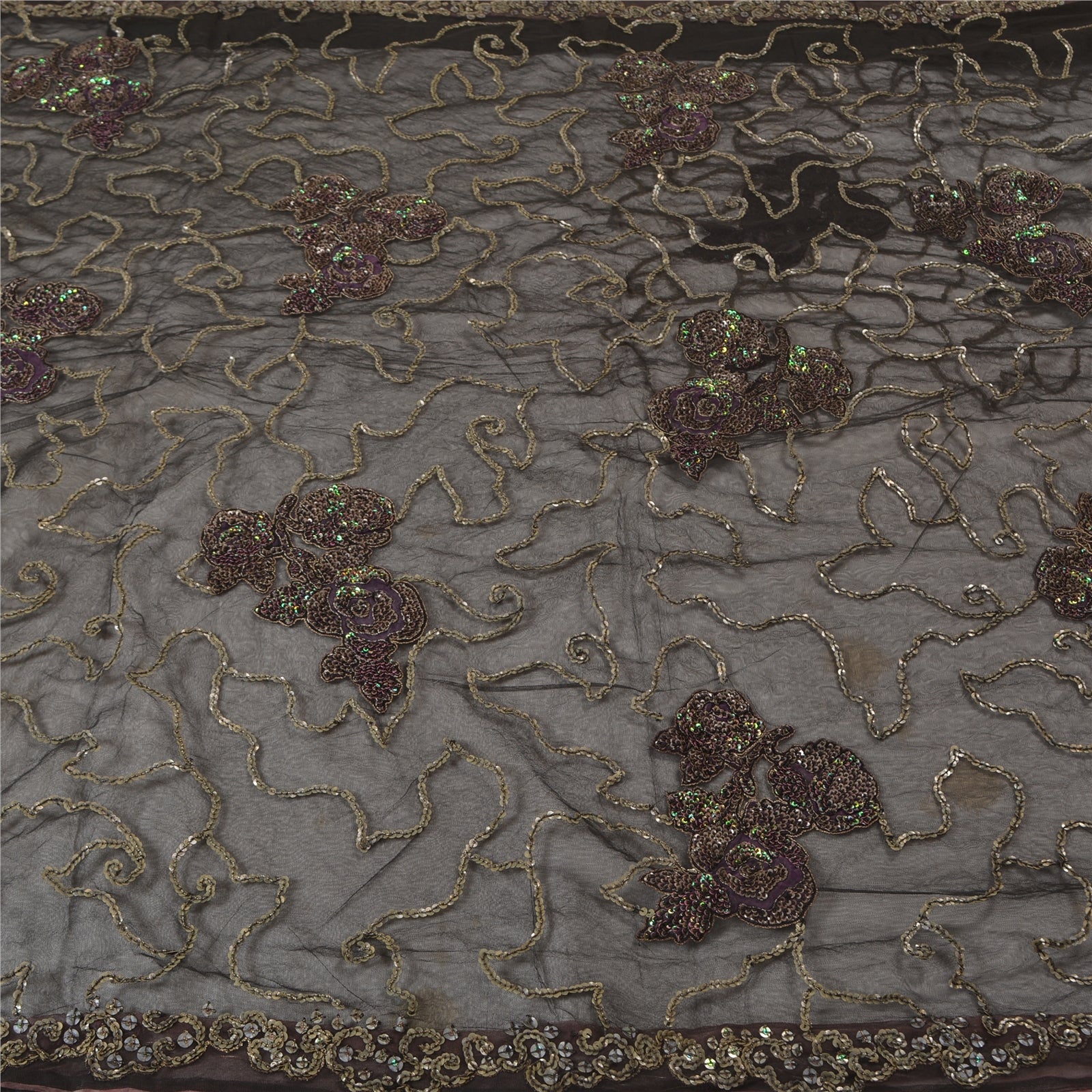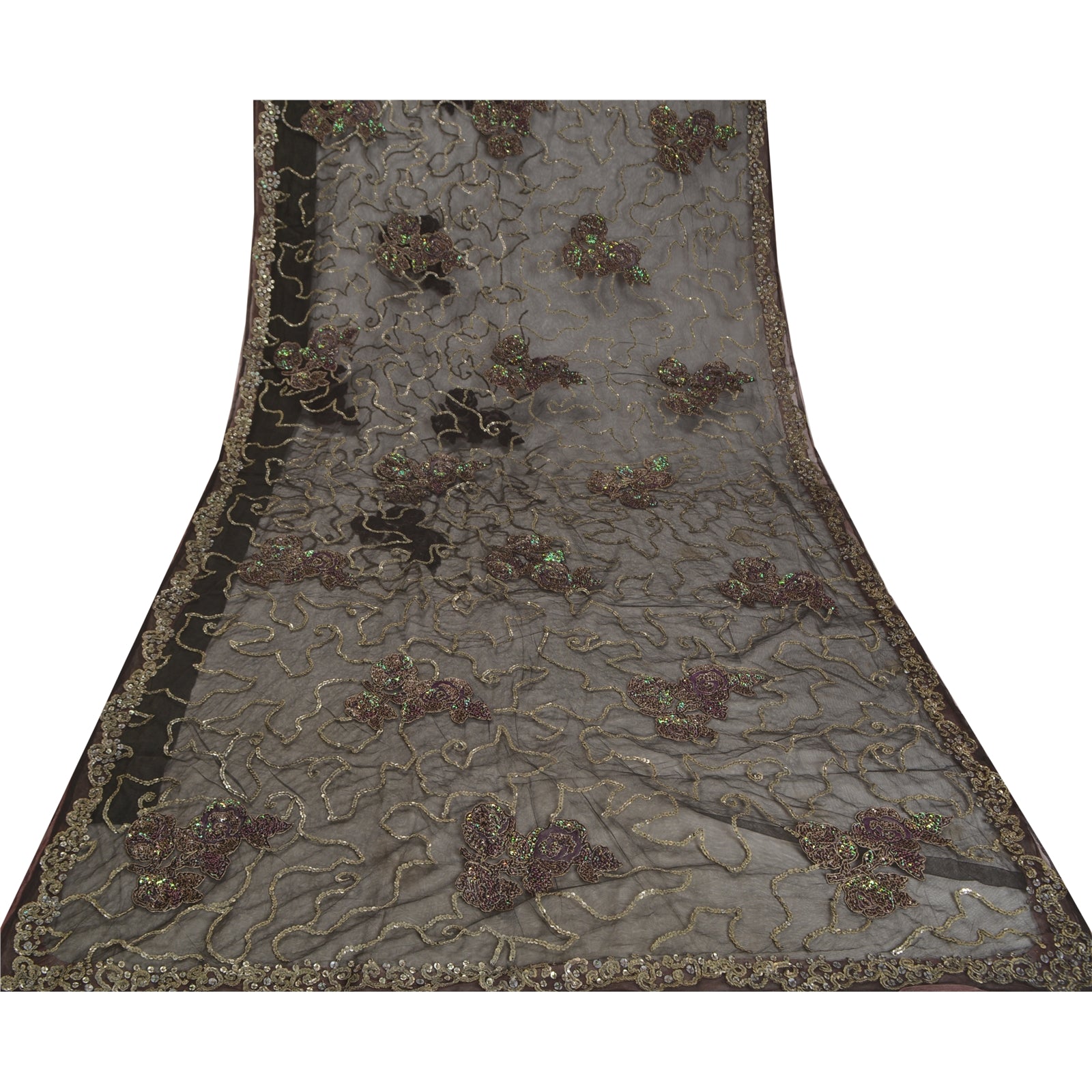 Sanskriti Vintage Black Sarees Net Mesh Hand Beaded Ethnic Sari Craft Sustainable Fabric