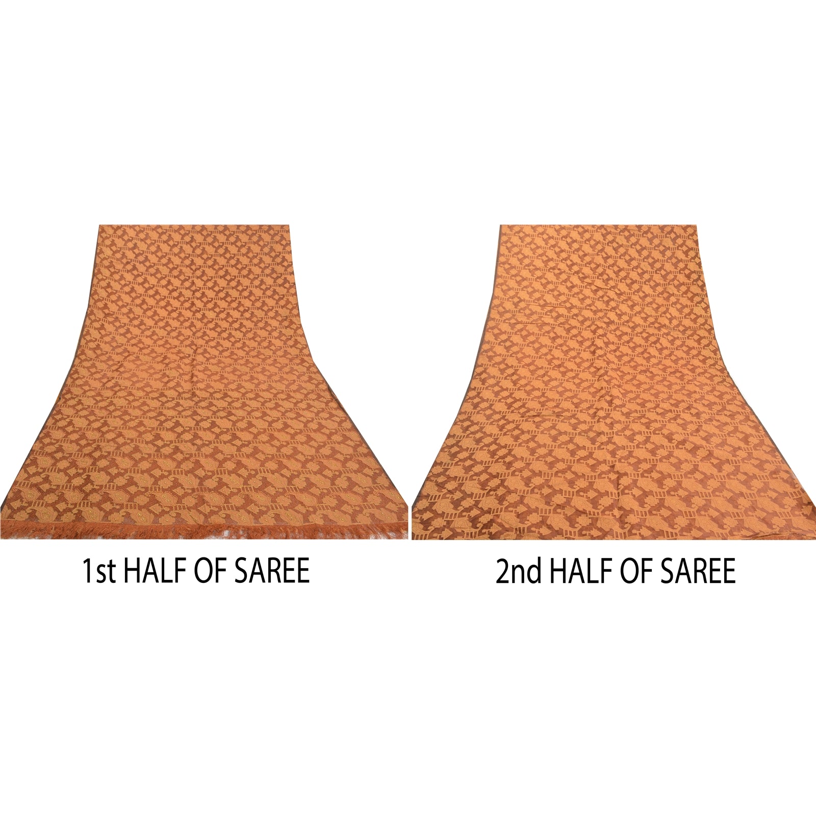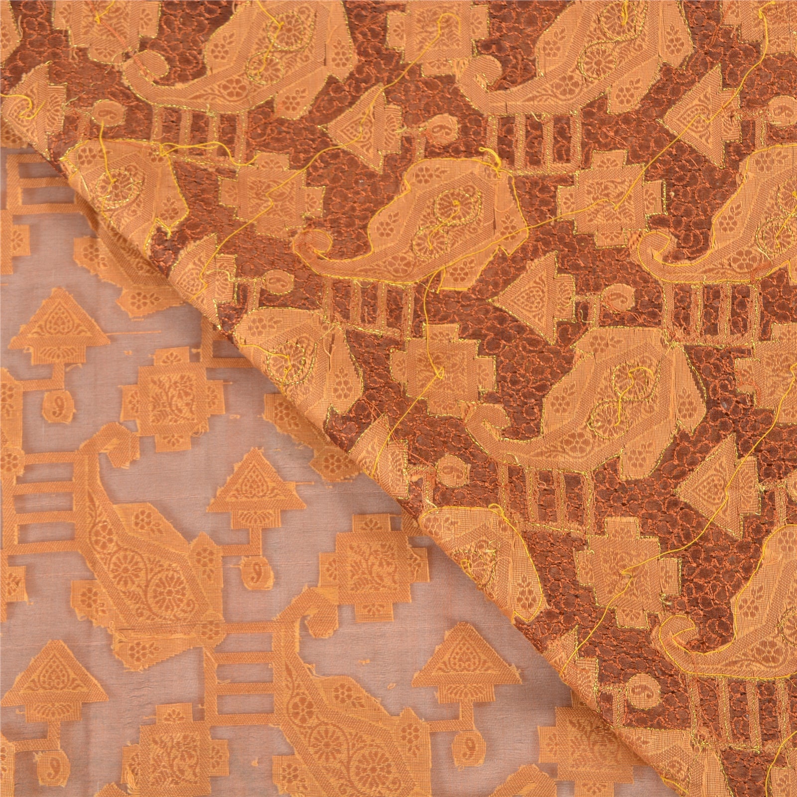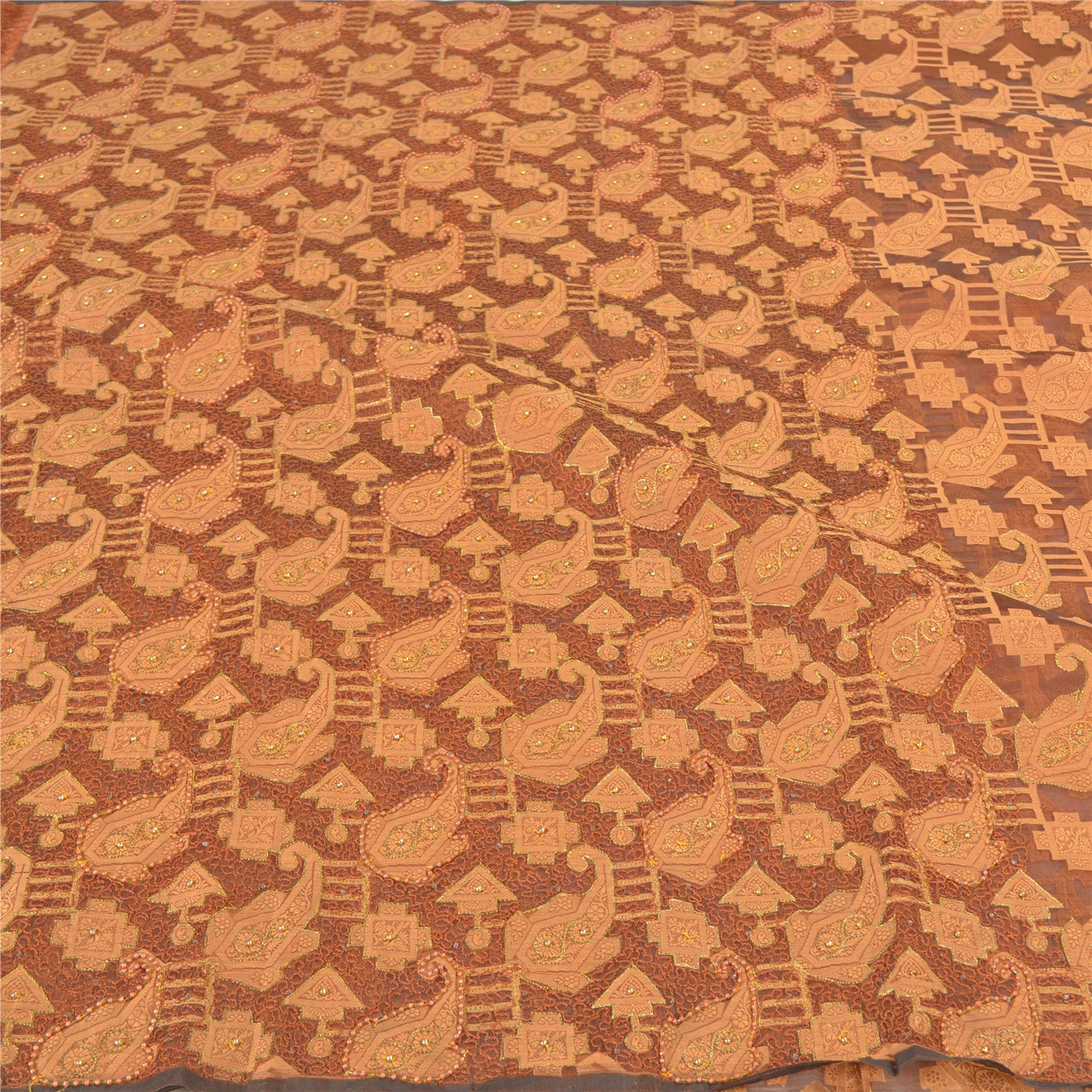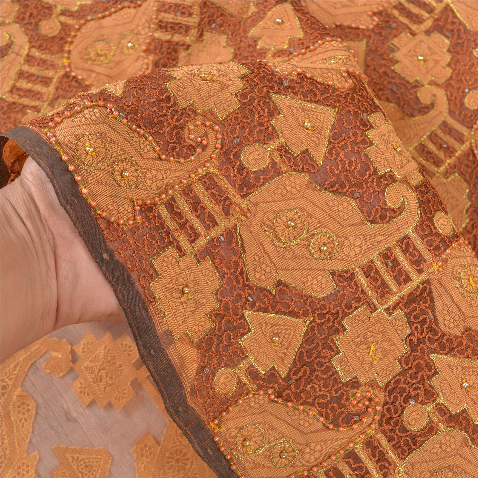 Beautiful Brown Colored 100% Pure Orange Silk Hand Embroidered & Woven Sari. Pallu & Border features is beige woven floral & paisley design embellished with golden zari work, peach pearl like beads, golden beads, brown thread work. Center part of the sari has similar woven work with floral pattern. This saree can be used for various crafting ideas too. Use it for dress designing, as a throw, as window dressing, upholstery, table linen and much more. Let your creative juices flow. For USA buyers - Single item ships via registered air mail, buy 1 more to get FedEx.