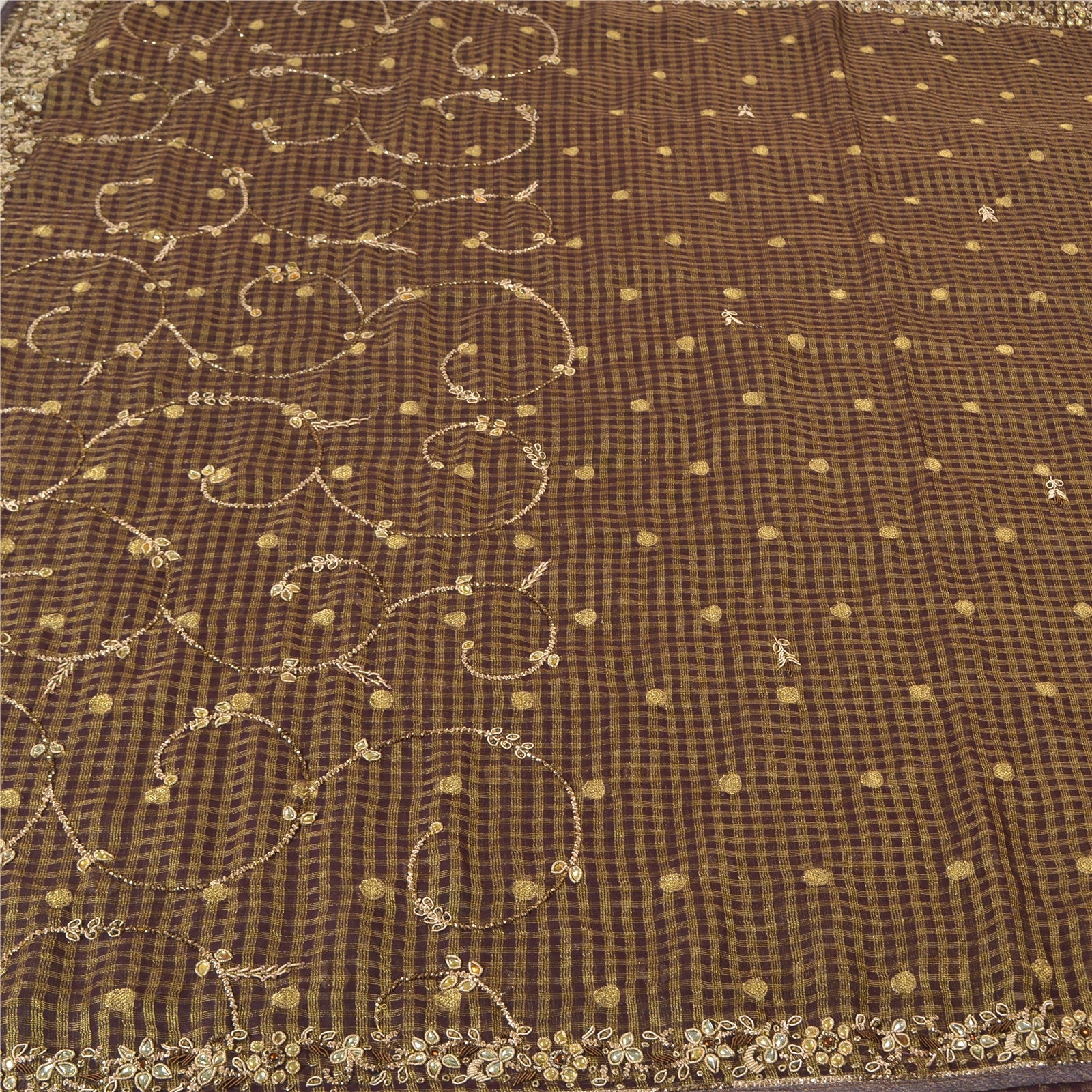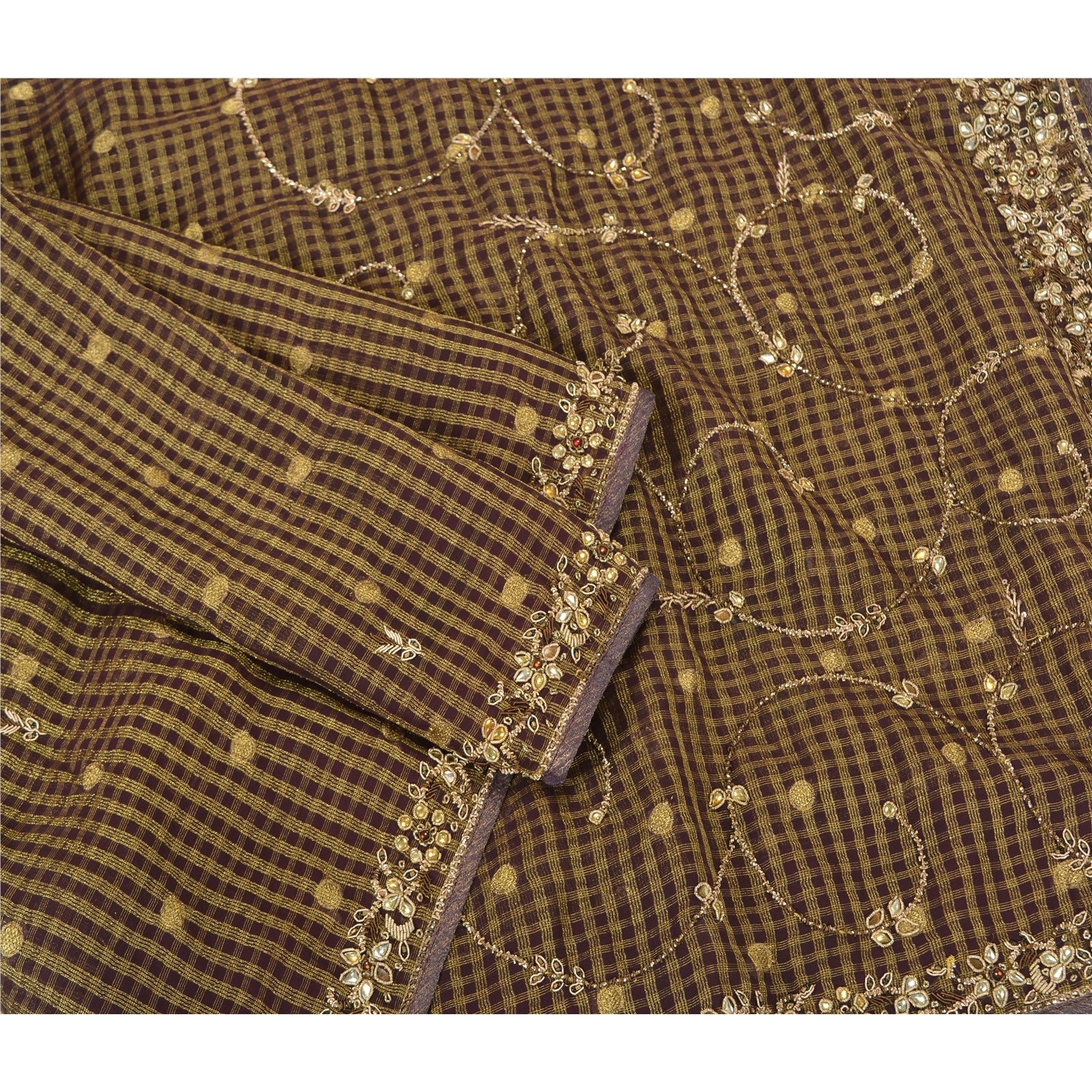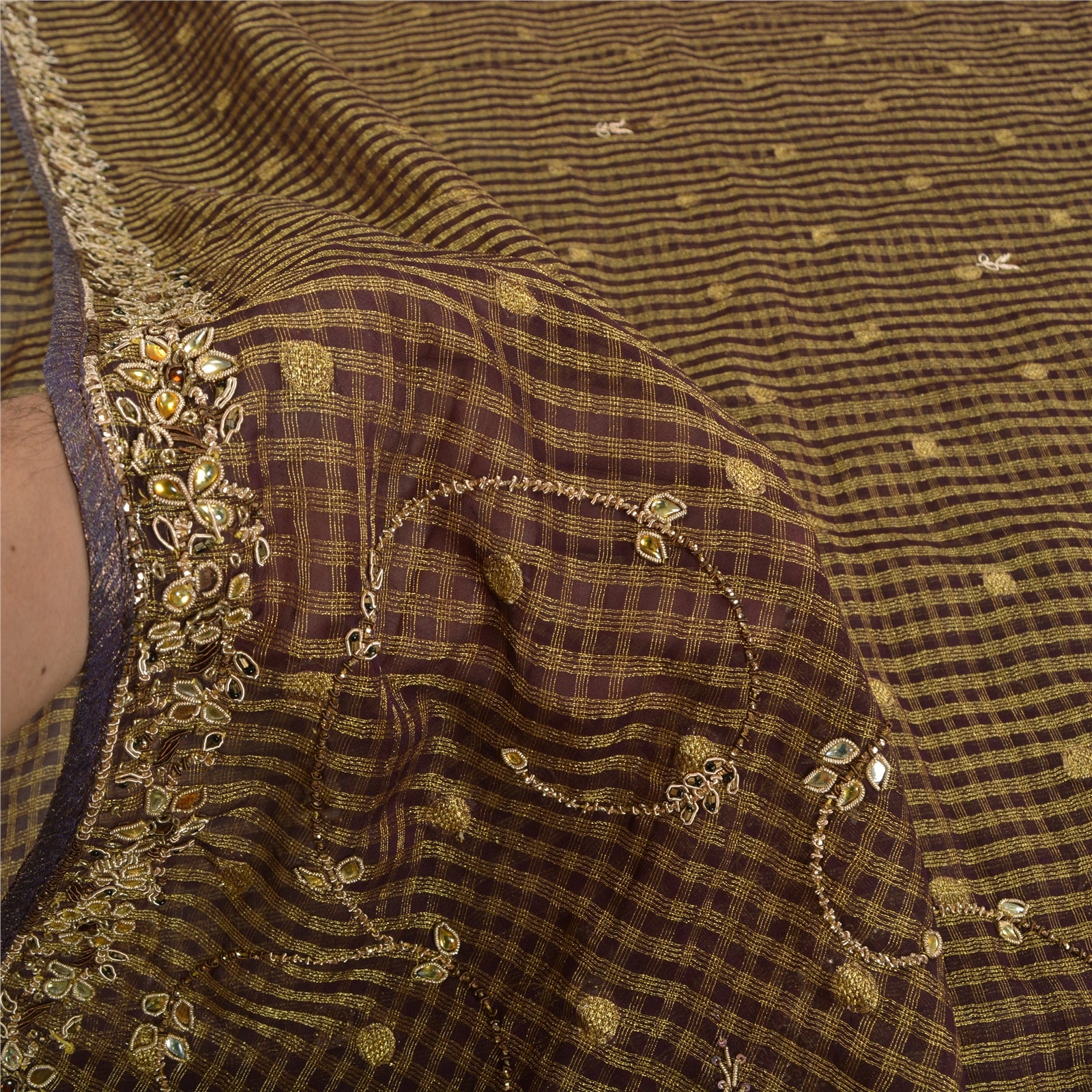 'THE ITEM COLOR OR SHADE MAY BE DARKER OR LIGHTER THAN THE PICTURE.' Beautiful brown colored pure silk hand embroidered woven sari. Pallu & Border has floral design embellished with metallic golden zardozi/dabka work, cream/brown kundan stones work. The center of the saree has similar zardozi/dabka work & kundan stones work. All over sari has golden woven grid pattern. This saree can be used for various crafting ideas too. Use it for dress designing, as a throw, as window dressing, upholstery, table linen and much more. Let your creative juices flow. 'International buyers please note: Import duties, taxes, and charges are not included in the item price or postage cost. These charges are the buyer's responsibility. Please check with your country's customs office to determine what these additional costs will be prior to bidding or buying. Buyer will pay custom duty/tax. It is calculated and charged differently by every country. As a seller I do not have any control over it. VAT or sales tax is calculated by the platform at the time of checkout. Customs charge is payable at the time of delivery.'