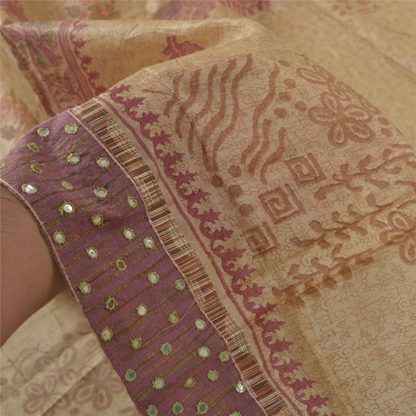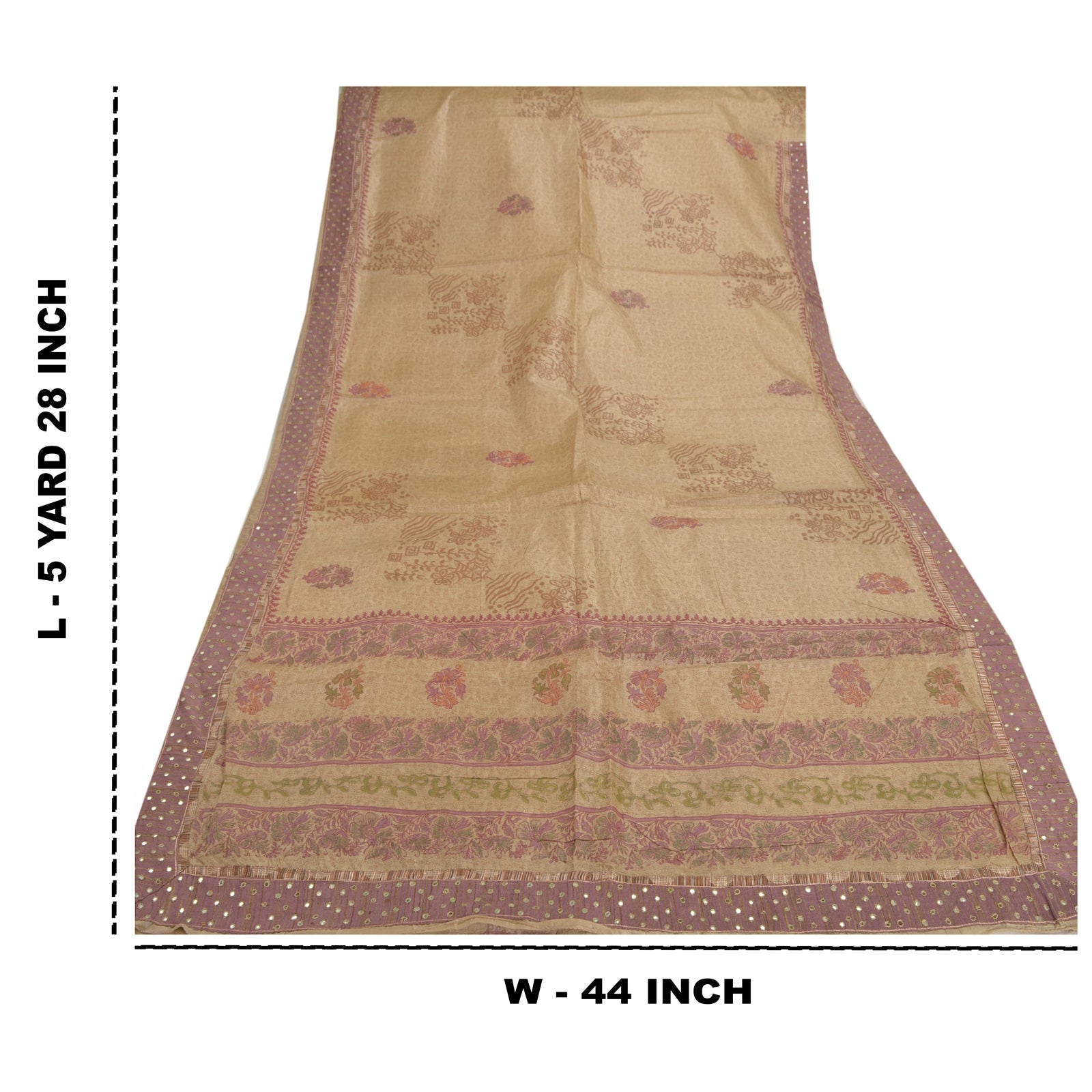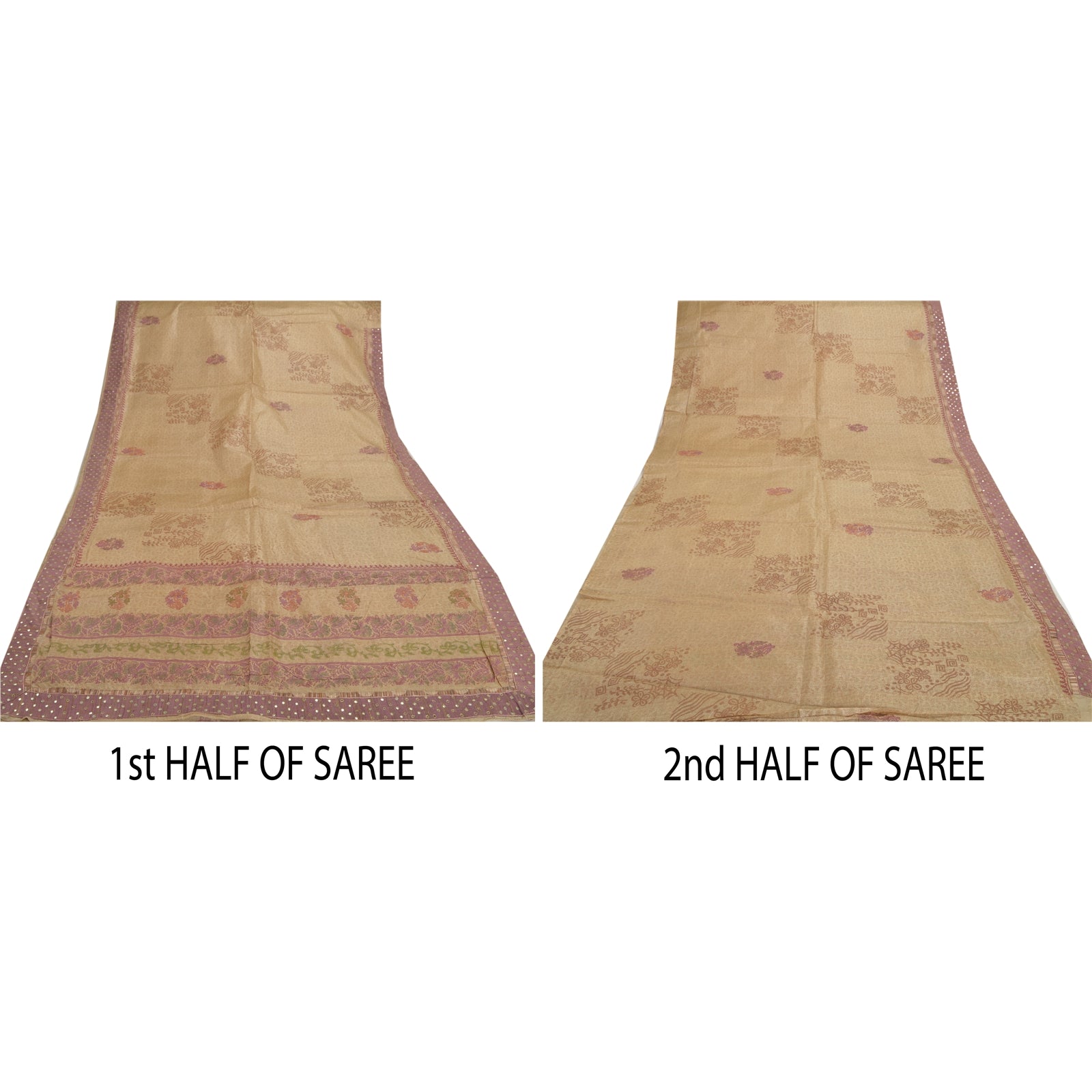 Beautiful heavy Sari In 100% Pure Tussar Silk Cream Colored Hand Embroidered Printed Sustainable Fabric. Pallu & Border Features Multi Color Printed Floral Design With Purple Hand Embroidered Sustainable Fabric Patch Work Embellished With Mirror Work. Similar Printed Work With Floral Motifs In Center Part Of Saree. This heavy saree can be used for various crafting ideas too. Use it for dress designing, as a throw, as window dressing, upholstery, table linen and much more. Let your creative juices flow. A One Of A Kind Unique Saree Must In Your Collection. Tussar Silk , also often referred to as 'Wild Silk, Tussar Silk, or Tussar Silk is an exquisite thread obtained from a wide winged moth that is yellowish-brown in colour. The scientific name of these moths is Antheraea Paphia and they are a part of the group known as Emperor Moths or Saturnids.