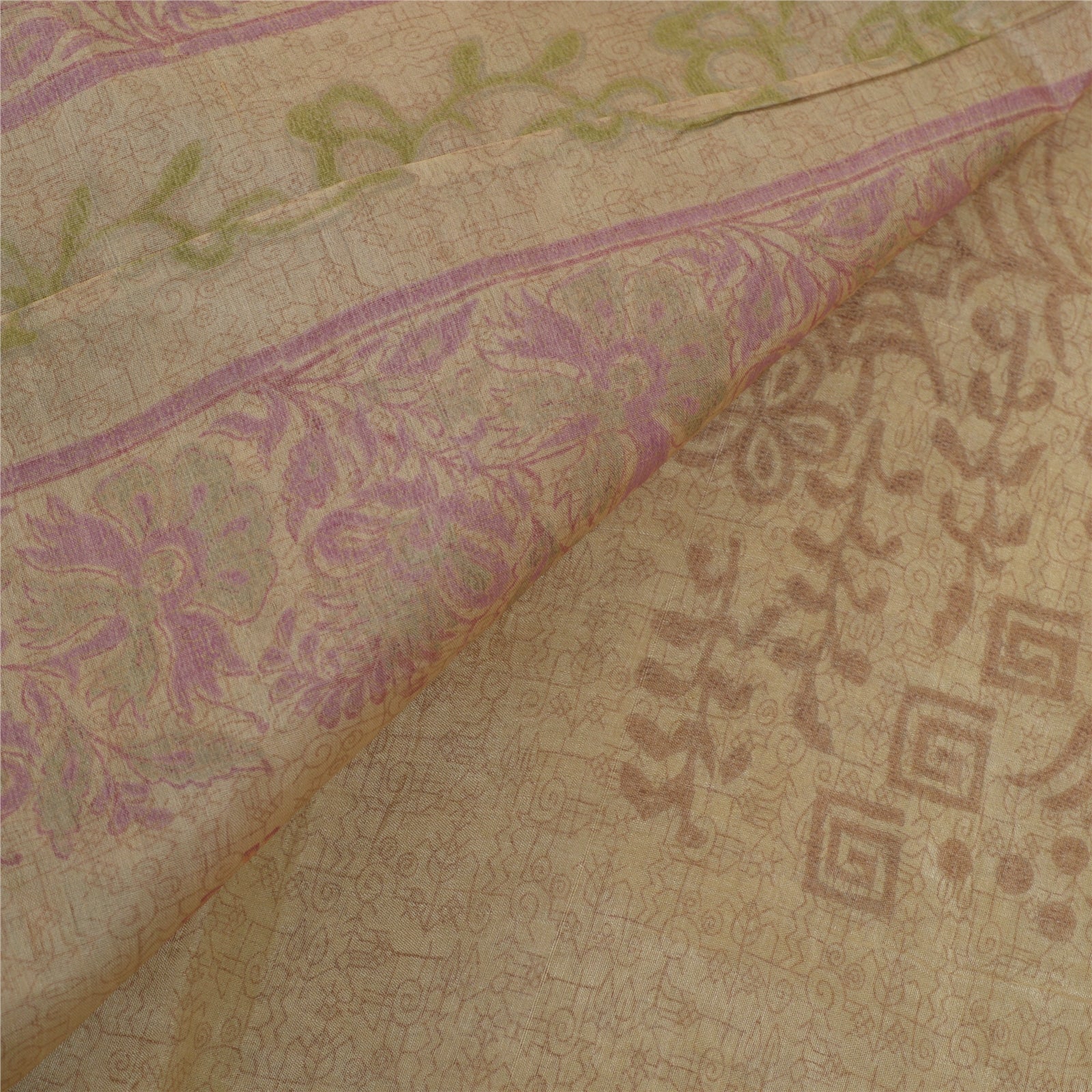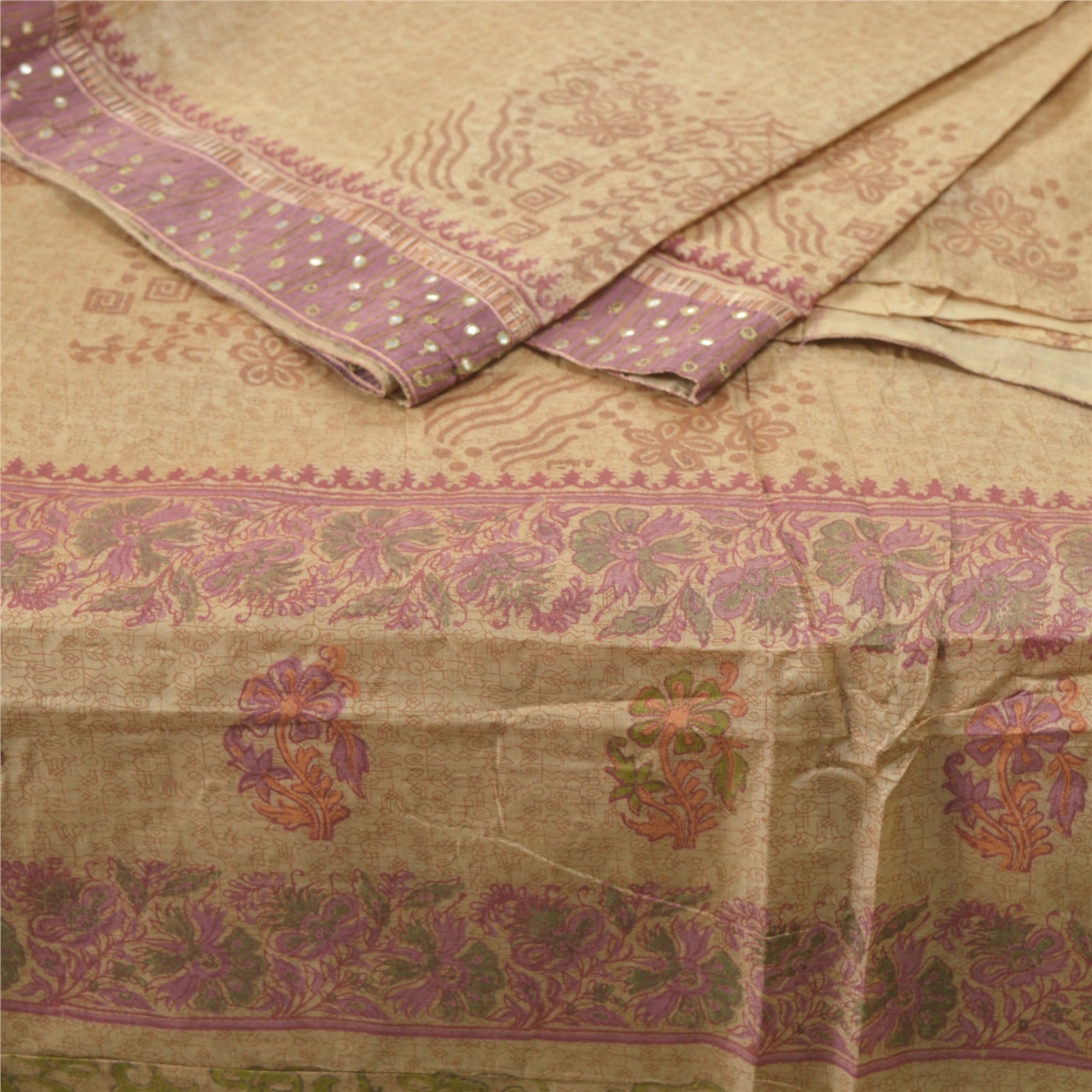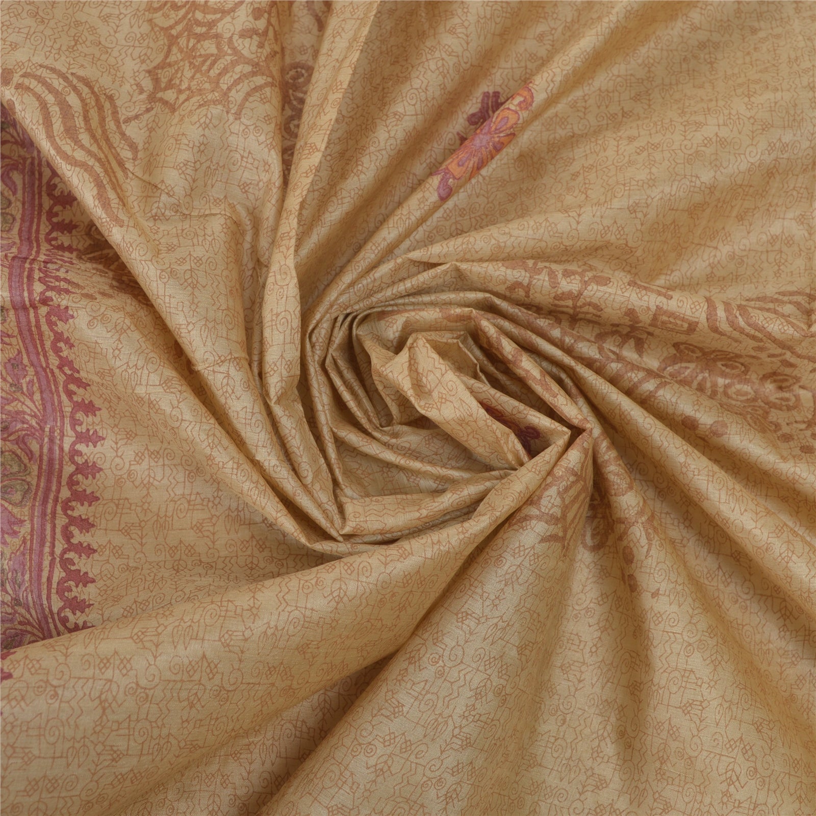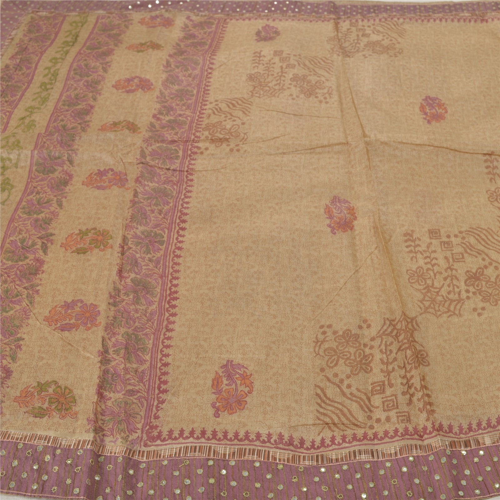 Beautiful heavy Sari In 100% Pure Tussar Silk Cream Colored Hand Embroidered Printed Sustainable Fabric. Pallu & Border Features Multi Color Printed Floral Design With Purple Hand Embroidered Sustainable Fabric Patch Work Embellished With Mirror Work. Similar Printed Work With Floral Motifs In Center Part Of Saree. This heavy saree can be used for various crafting ideas too. Use it for dress designing, as a throw, as window dressing, upholstery, table linen and much more. Let your creative juices flow. A One Of A Kind Unique Saree Must In Your Collection. Tussar Silk , also often referred to as 'Wild Silk, Tussar Silk, or Tussar Silk is an exquisite thread obtained from a wide winged moth that is yellowish-brown in colour. The scientific name of these moths is Antheraea Paphia and they are a part of the group known as Emperor Moths or Saturnids.