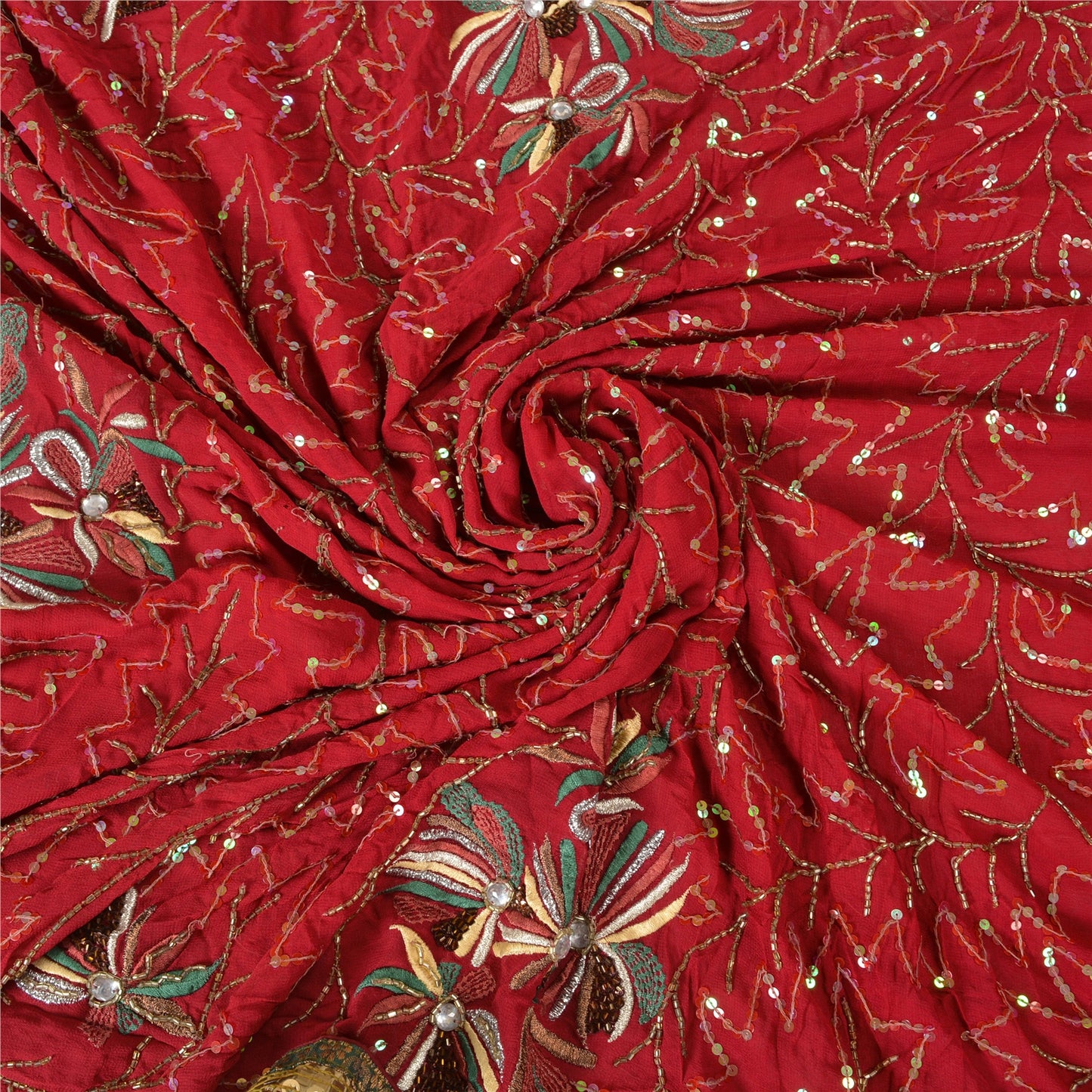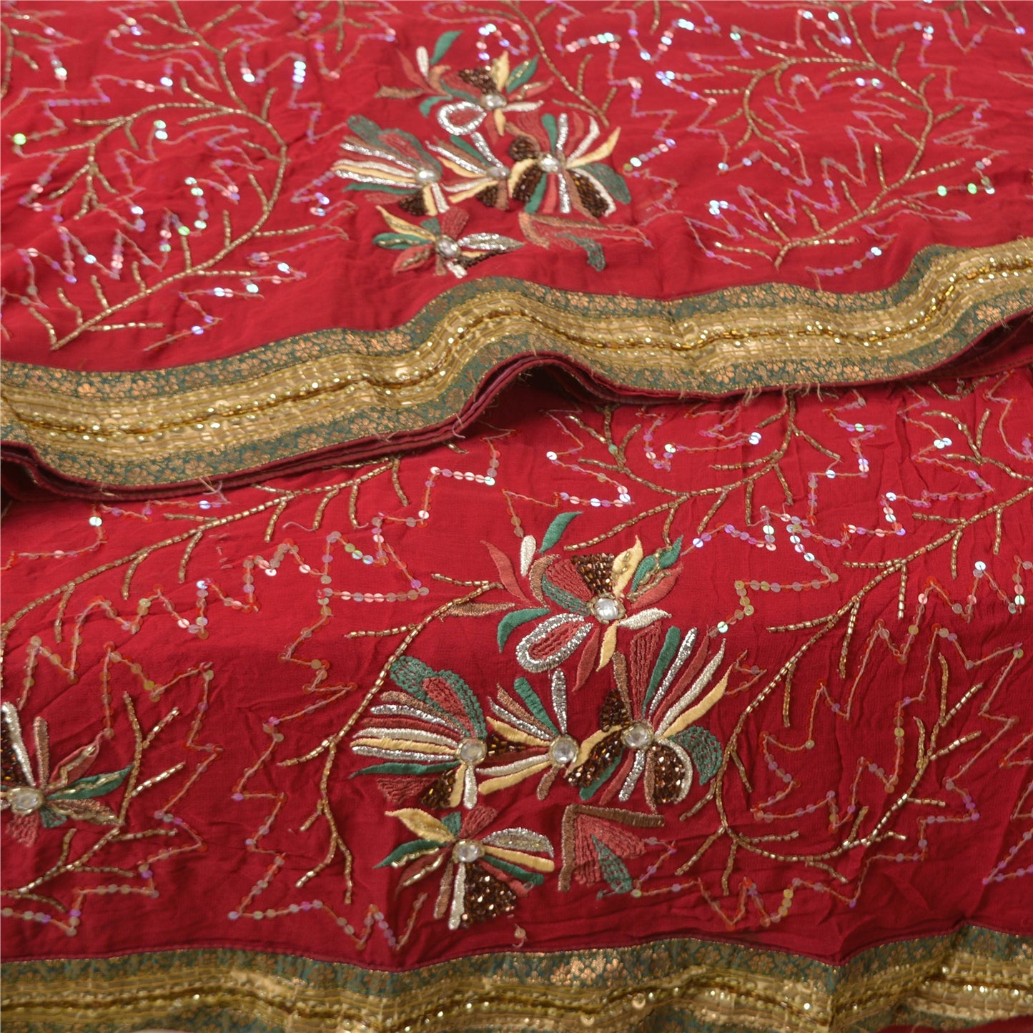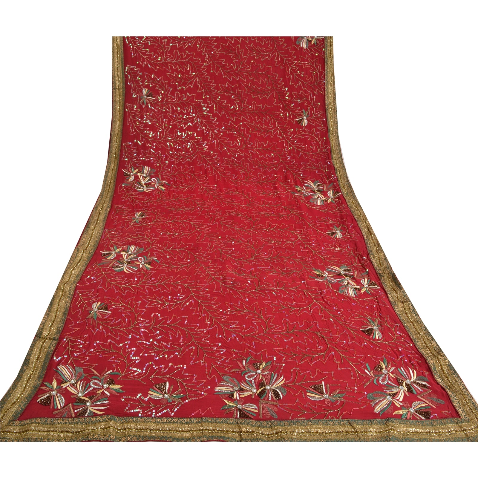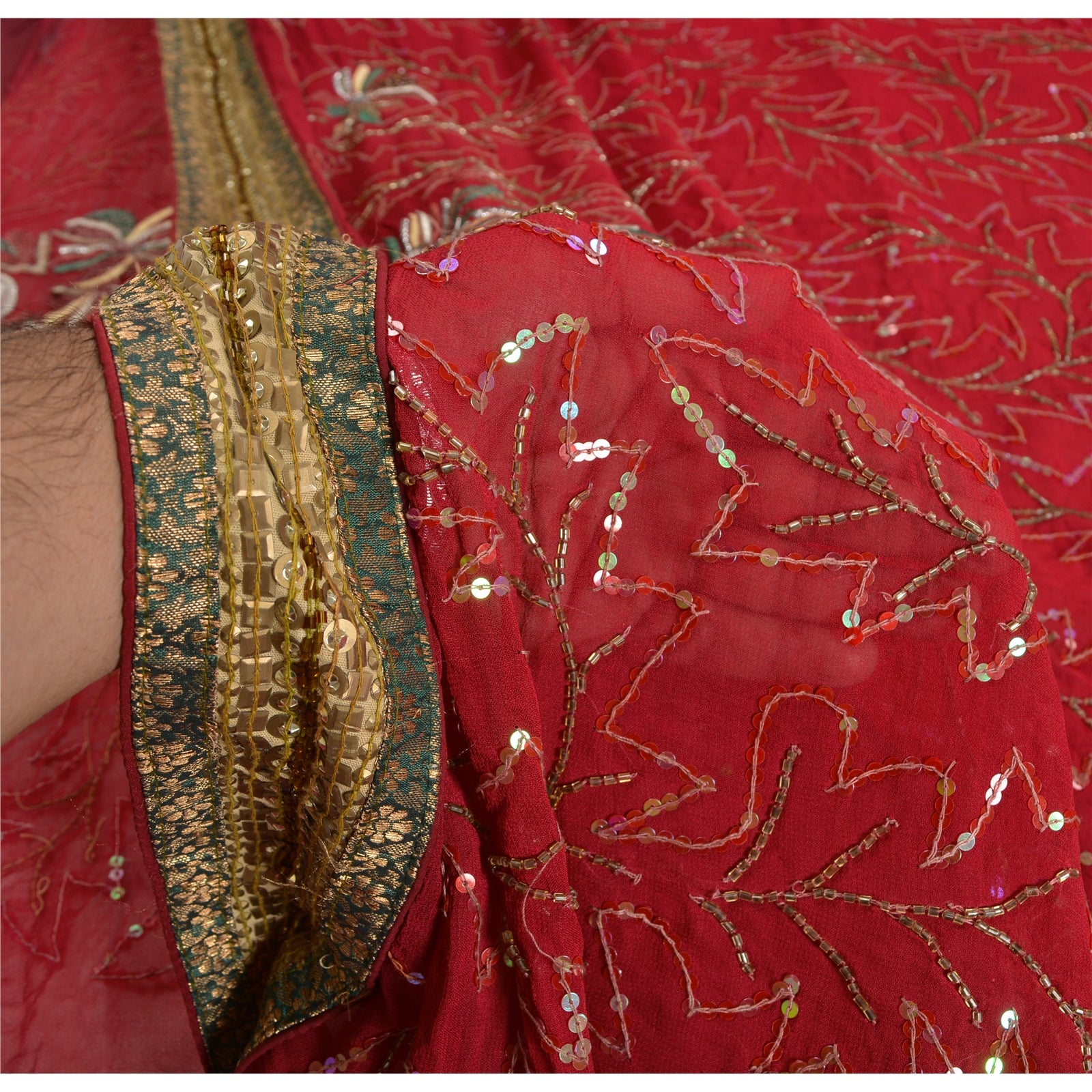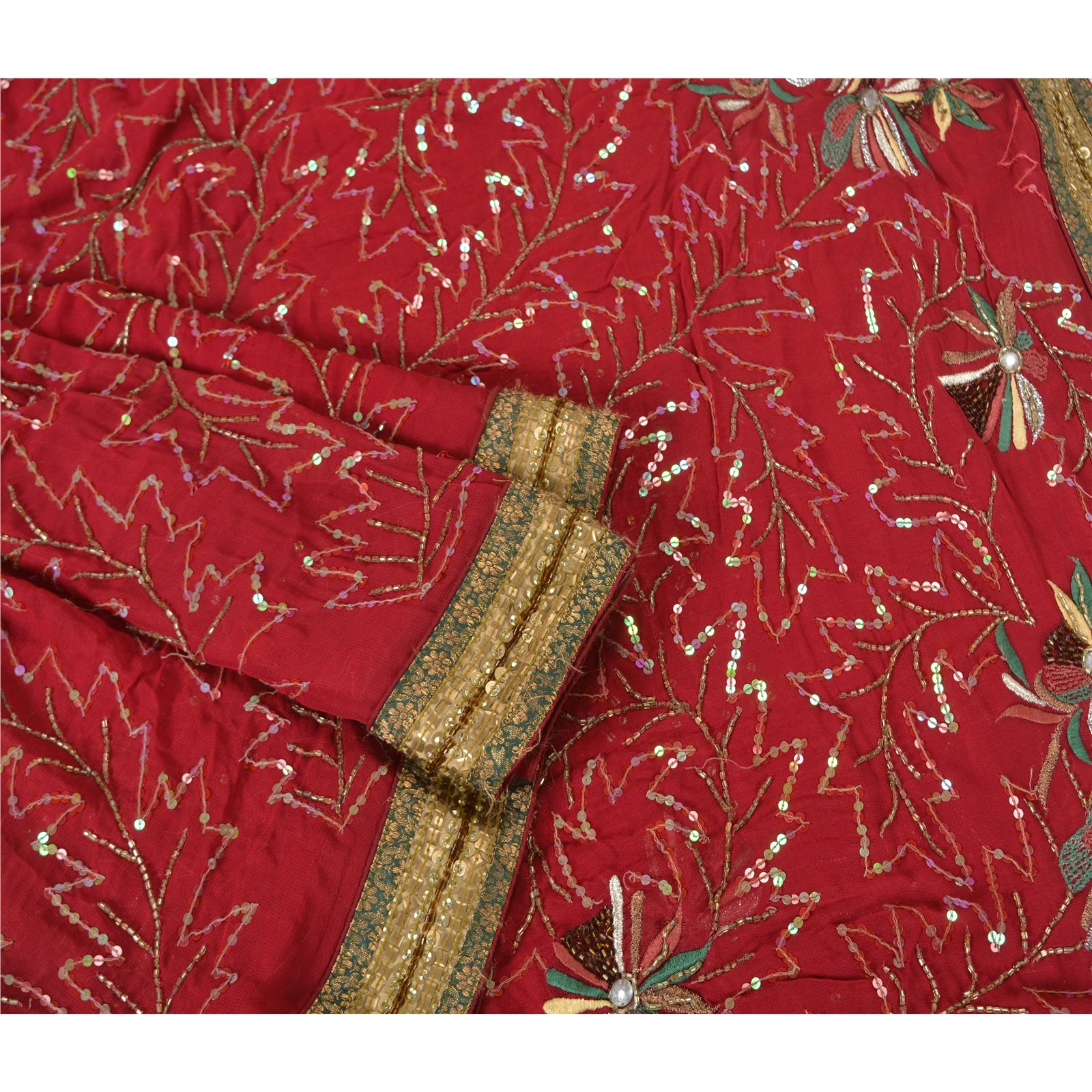'THE ITEM COLOR OR SHADE MAY BE DARKER OR LIGHTER THAN THE PICTURE.' Just see the intricacy of the work. Beautiful hand beaded saree with eye-catching sequins work on borders. Base Sustainable Fabric is blend georgette in dark red color with sparkling multi reflecting sequins and golden glass beads work. You can see floral design crafted with silver, green, yellow & pink thread embroidery. A shinning white rhinestone in center and copper sequins and glass beads work is looking wonderful. You can see green woven Sustainable Fabric patchwork on borders along with golden designer sequins which is further enhancing the beauty of the saree. 'International buyers please note: Import duties, taxes, and charges are not included in the item price or postage cost. These charges are the buyer's responsibility. Please check with your country's customs office to determine what these additional costs will be prior to bidding or buying. Buyer will pay custom duty/tax. It is calculated and charged differently by every country. As a seller I do not have any control over it. VAT or sales tax is calculated by the platform at the time of checkout. Customs charge is payable at the time of delivery.