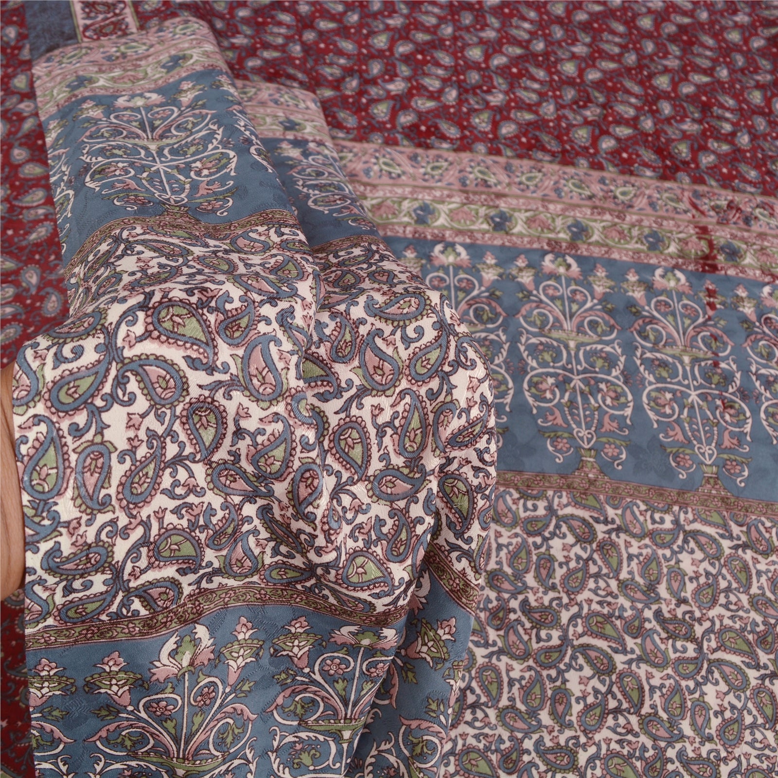Beautiful dark red and grey colored printed moss crepe saree. Pallu & Border has printed floral and paisley design. Paisley and floral design in center part of sari. What is special about this saree? Nice printed design with extremely smooth moss crepe base Sustainable Fabric is really enhancing the beauty of the saree. This unique vintage saree can be used for various crafting ideas even if you don't want to use it as a sari. Design a dress, use it as a throw, as window dressing, upholstery, sarongs, table linen and much more. Let your creative juices flow and use this decorated Sustainable Fabric in multiple fashion. Please note - Buyers from Australia are required to pay postage. Registered air mail to Australia is temporarily suspended due to the pandemic. Once it goes back to normal we'll revert to free shipping. For now, we are using Aramex and DHL to ship orders. These services are expensive but faster compared to regular mail. Thank you for your support. If you are buying in bulk we will refund whatever excess is left. Contact us after that purchase. For USA buyers - Single item ships via registered air mail, buy 1 more to get FedEx.