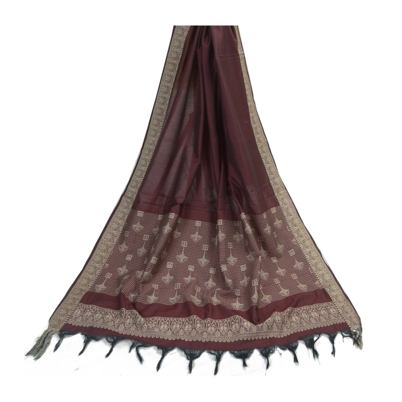 Awesome dark red colored art (artificial) silk woven long scarf/dupatta. The center portion has solid plain fabric. Border of the dupatta has floral design with cream woven work. There are cream/black fringes on borders. This unique vintage saree can be used for various crafting ideas for example design a dress, use it as a throw, as window dressing, upholstery, table linen and much more. Let your creative juices flow and use this decorated fabric in multiple fashion. International buyers please note: Import duties, taxes, and charges are not included in the item price or postage cost. These charges are the buyer's responsibility. Please check with your country's customs office to determine what these additional costs will be prior to bidding or buying. Buyer will pay custom duty/tax. It is calculated and charged differently by every country. As a seller I do not have any control over it. VAT or sales tax is calculated by the platform at the time of checkout. Customs charge is payable at the time of delivery.