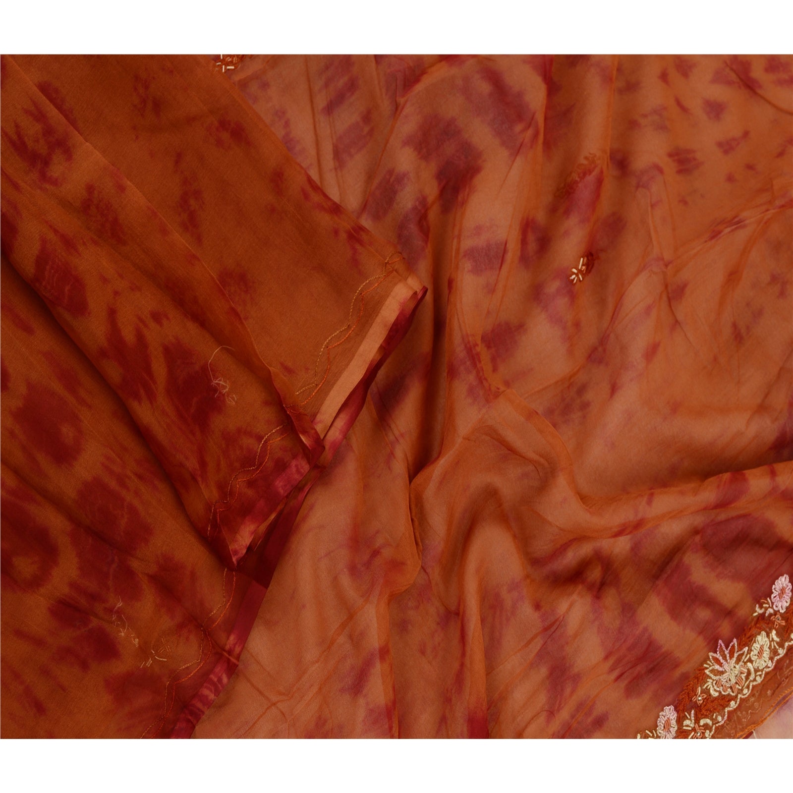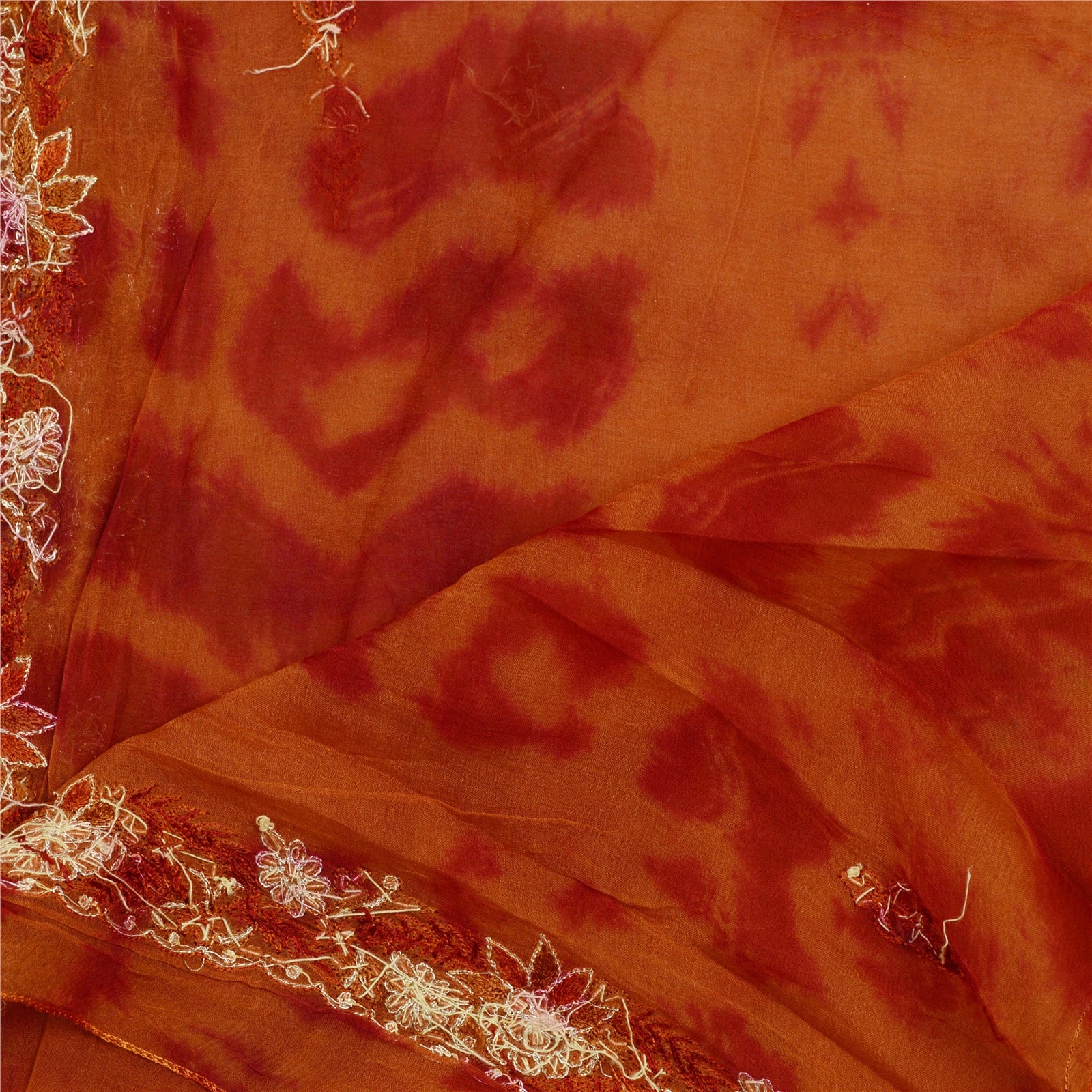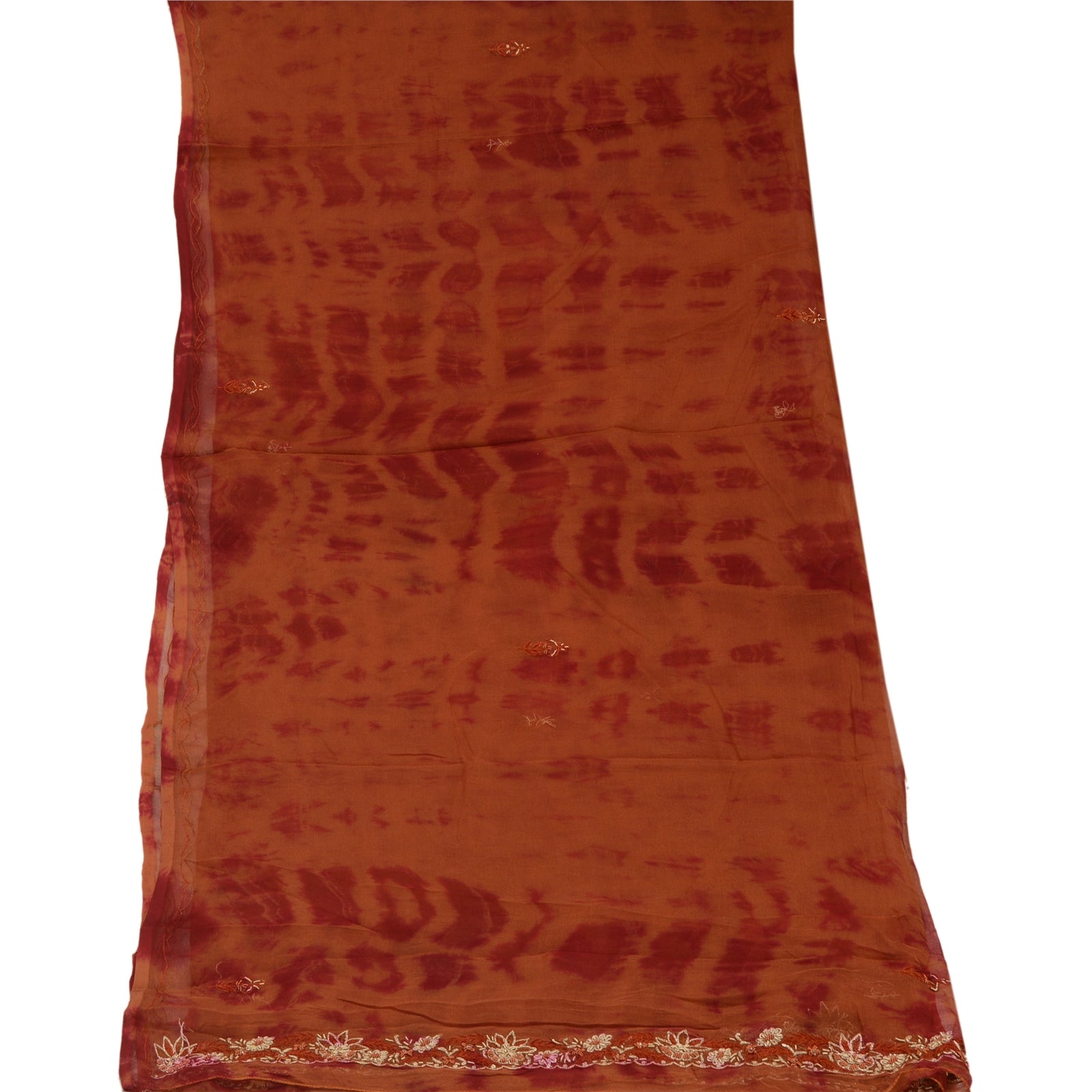 Beautiful rusty orange & dark red colored 100% pure chiffon silk hand embroidered tie-dye dupatta/stole. Center portion of the dupatta floral design with tie & dye work. Border has floral design embroidered red thread work embellished with golden zari/zardozi work, white glass beads, maroon/orange thread work is really enhancing beauty of the dupatta/stole. This dupatta/stole can be used for various crafting ideas too. Use it for dress designing, as a throw, as window dressing, upholstery, table linen and much more. Let your creative juices flow.