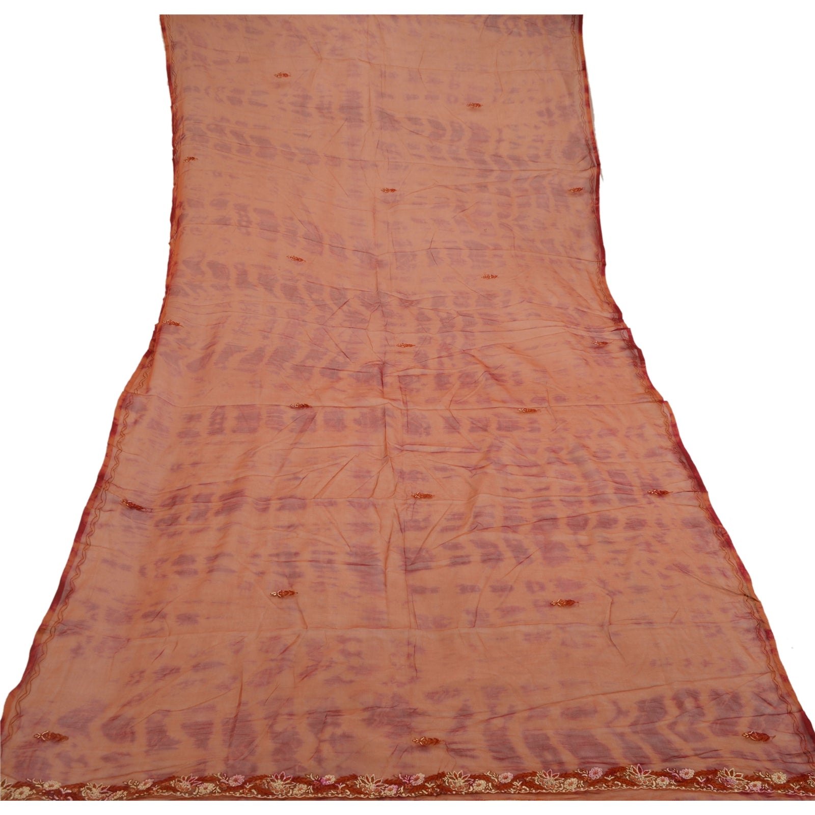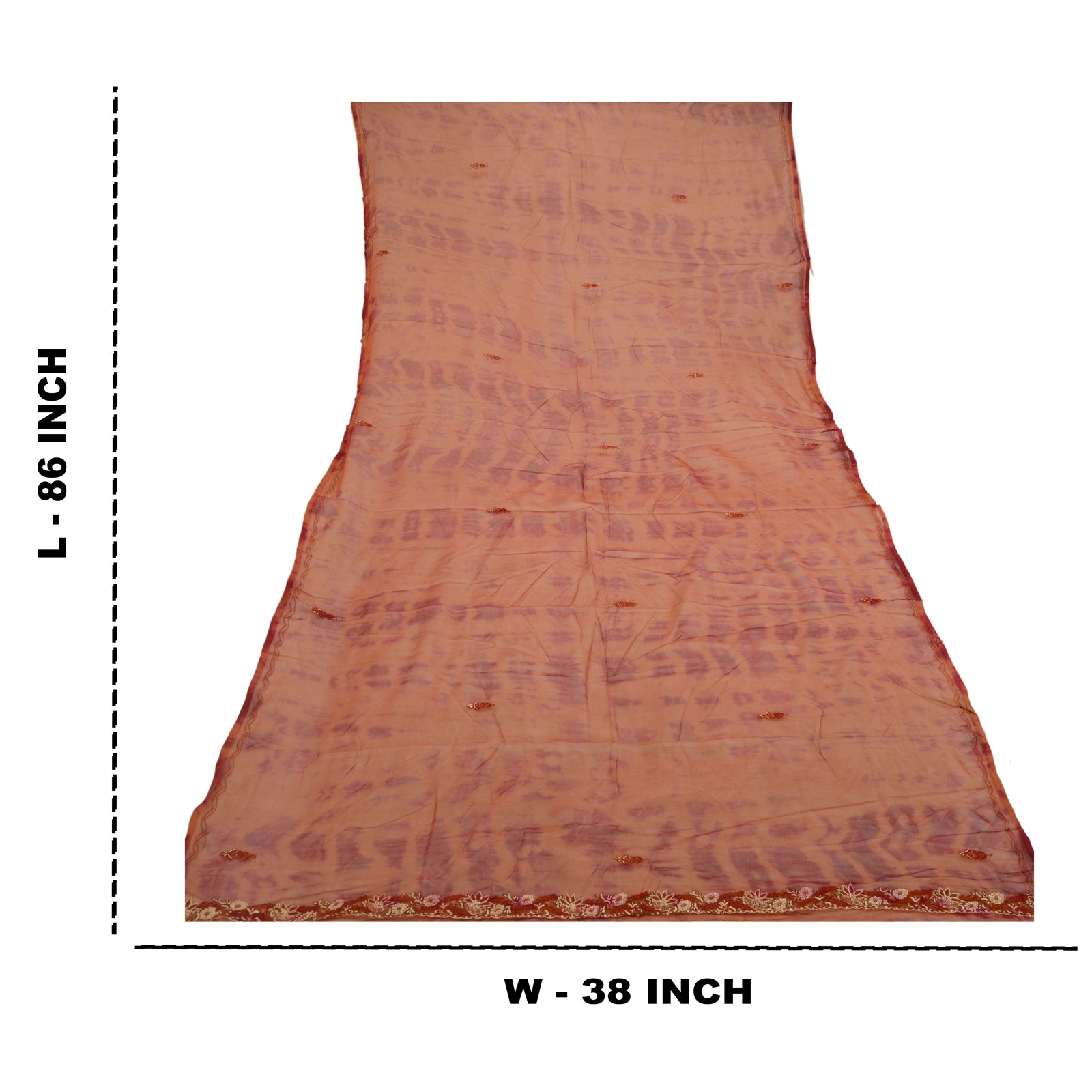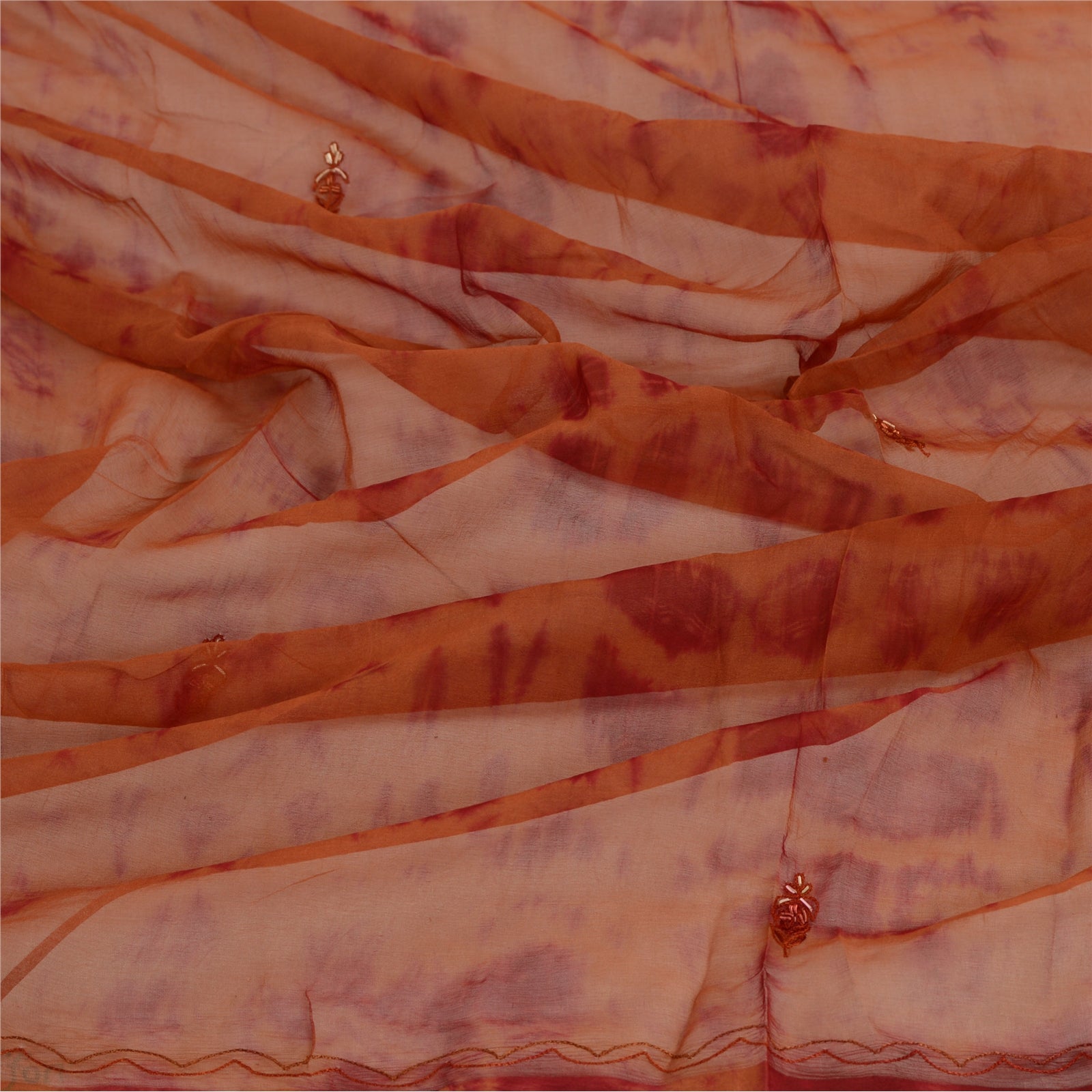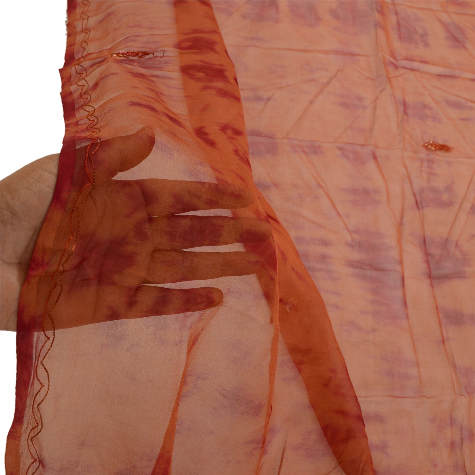 Beautiful rusty orange & dark red colored 100% pure chiffon silk hand embroidered tie-dye dupatta/stole. Center portion of the dupatta floral design with tie & dye work. Border has floral design embroidered red thread work embellished with golden zari/zardozi work, white glass beads, maroon/orange thread work is really enhancing beauty of the dupatta/stole. This dupatta/stole can be used for various crafting ideas too. Use it for dress designing, as a throw, as window dressing, upholstery, table linen and much more. Let your creative juices flow.