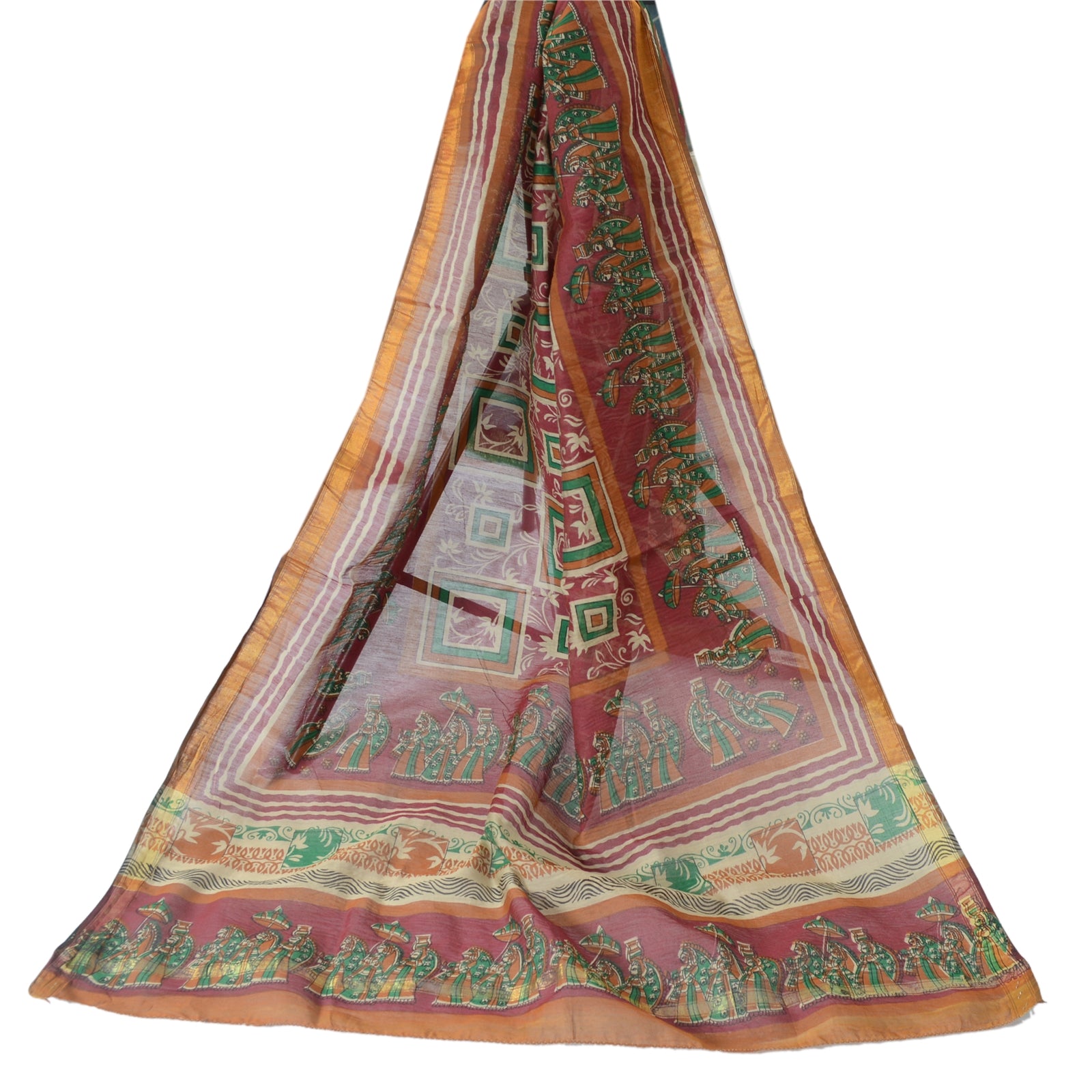 Attractive dark red & cream colored pure cotton printed long scarf/dupatta. The center portion has floral & geometric design with multi color printed work . Border of the dupatta has floral, human, pot & umbrella design with similar work . This item's Beauty Factor Awesome pattern with colorful printed work on blend cotton base fabric is really enhancing the beauty of the dupatta.