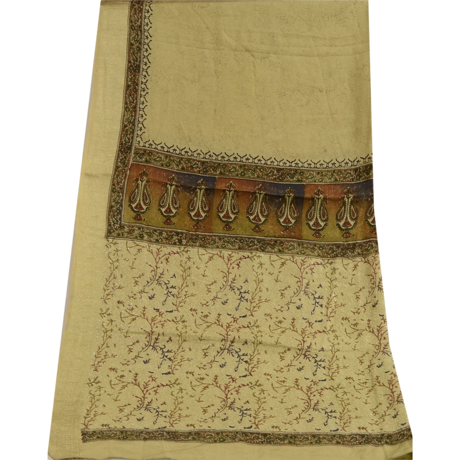 Beautiful shade of olive green colored 100% pure silk woven & printed long scarf/dupatta. Center portion of the dupatta printed abstract pattern. Border has printed floral design with woven thread work is really enhancing beauty of the dupatta/stole. This dupatta/stole can be used for various crafting ideas too. Use it for dress designing, as a throw, as window dressing, upholstery, table linen and much more. Let your creative juices flow.