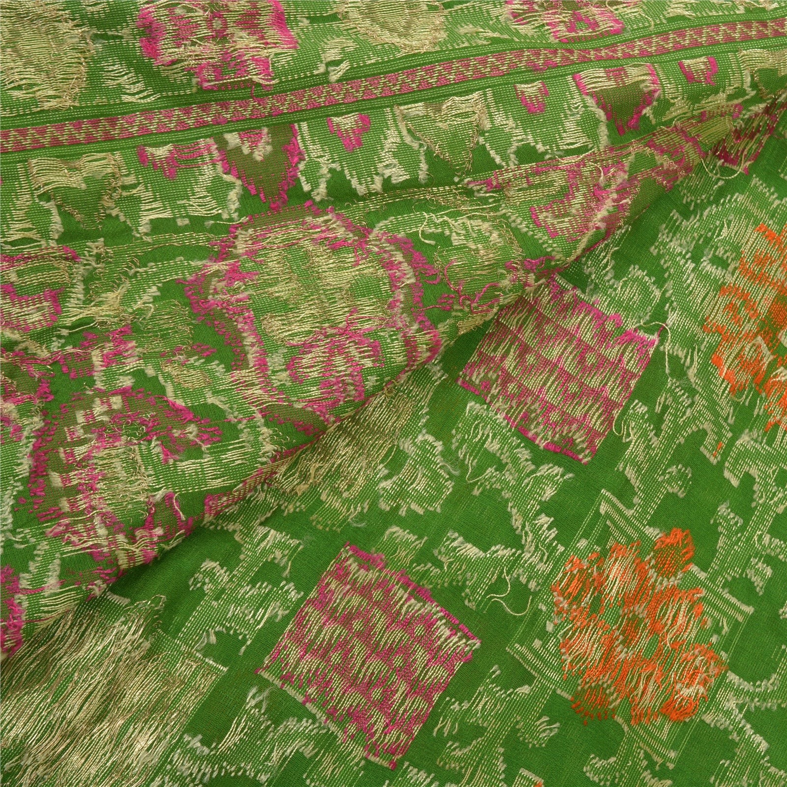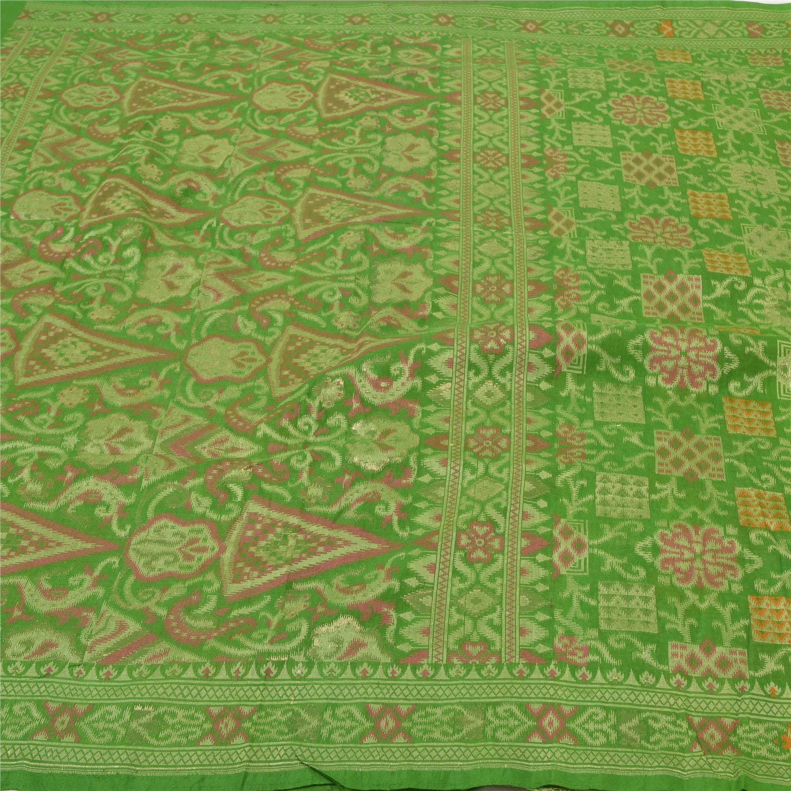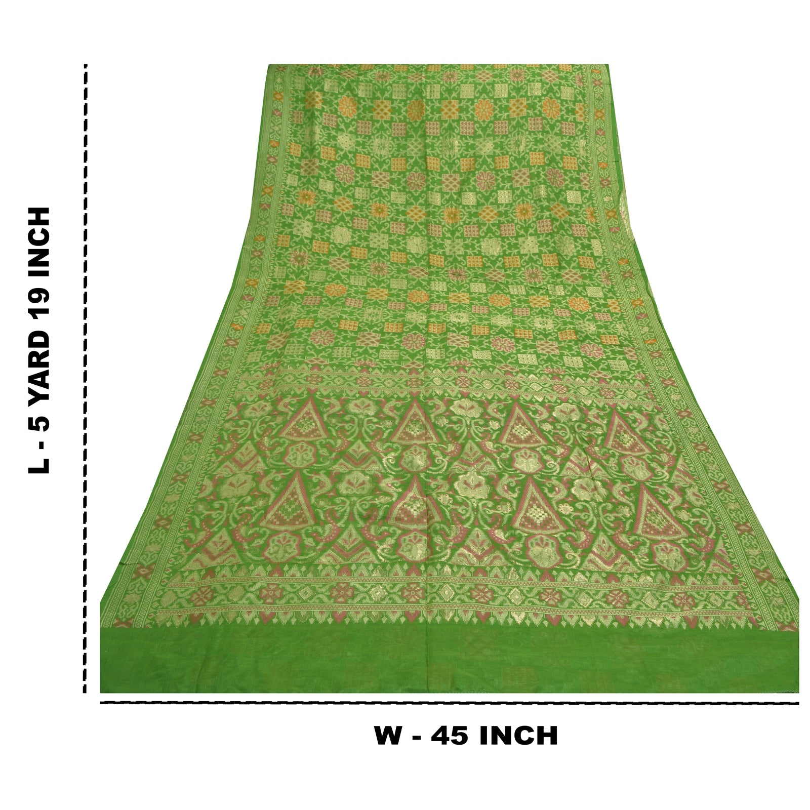 Perfect definition of Elegance!! Sanskriti Offers This Vintage Green Color Woven Tanchoi (Jamawar) Heavy Saree Which is Crafted With 100% Pure Silk Base Sustainable Fabric. The pallu & border sari features floral design embellished with multi color woven work. The center part of sari boasts floral motifs. Tanchoi is one of the weaving techniques involving a single or double warp and two to five colors on the weft which are often of the same shade on Silk Sustainable Fabric. Another stand alone feature of the Tanchoi sarees is that the Sustainable Fabric texture background has a Satin finish. Some zari work is also done to make it more beautifular. This heavy saree can be used as it is or can be used for various crafting ideas like to design a dress, as a throw, as window dressing, upholstery, table linen and much more. Let your creative juices flow! As the item is vintage, some mild stains/damages are expected.