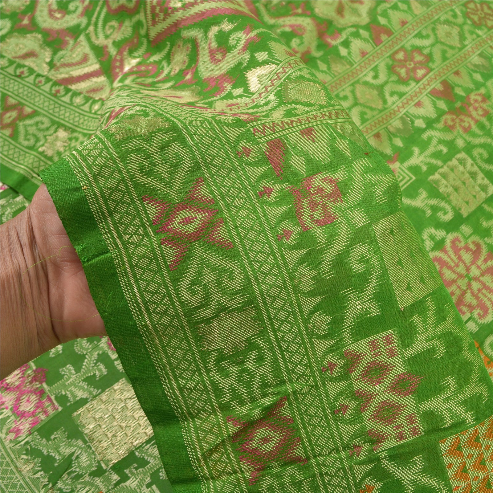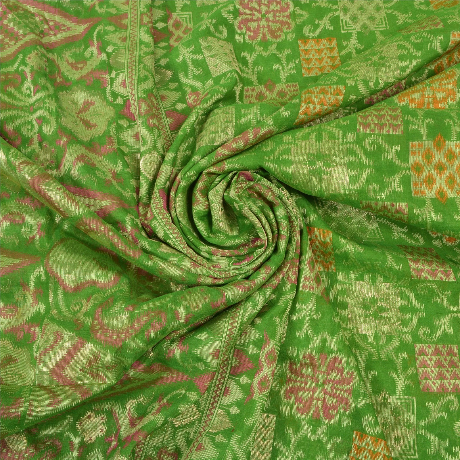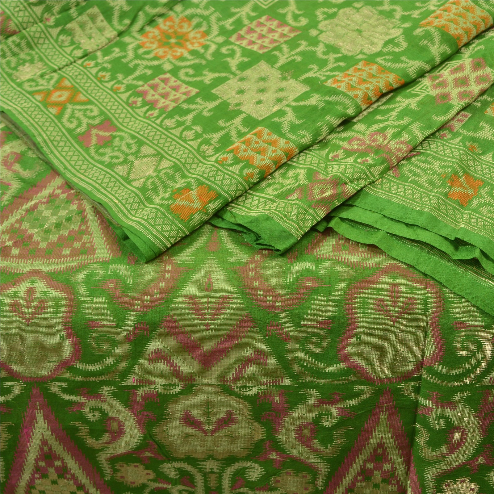Perfect definition of Elegance!! Sanskriti Offers This Vintage Green Color Woven Tanchoi (Jamawar) Heavy Saree Which is Crafted With 100% Pure Silk Base Sustainable Fabric. The pallu & border sari features floral design embellished with multi color woven work. The center part of sari boasts floral motifs. Tanchoi is one of the weaving techniques involving a single or double warp and two to five colors on the weft which are often of the same shade on Silk Sustainable Fabric. Another stand alone feature of the Tanchoi sarees is that the Sustainable Fabric texture background has a Satin finish. Some zari work is also done to make it more beautifular. This heavy saree can be used as it is or can be used for various crafting ideas like to design a dress, as a throw, as window dressing, upholstery, table linen and much more. Let your creative juices flow! As the item is vintage, some mild stains/damages are expected.