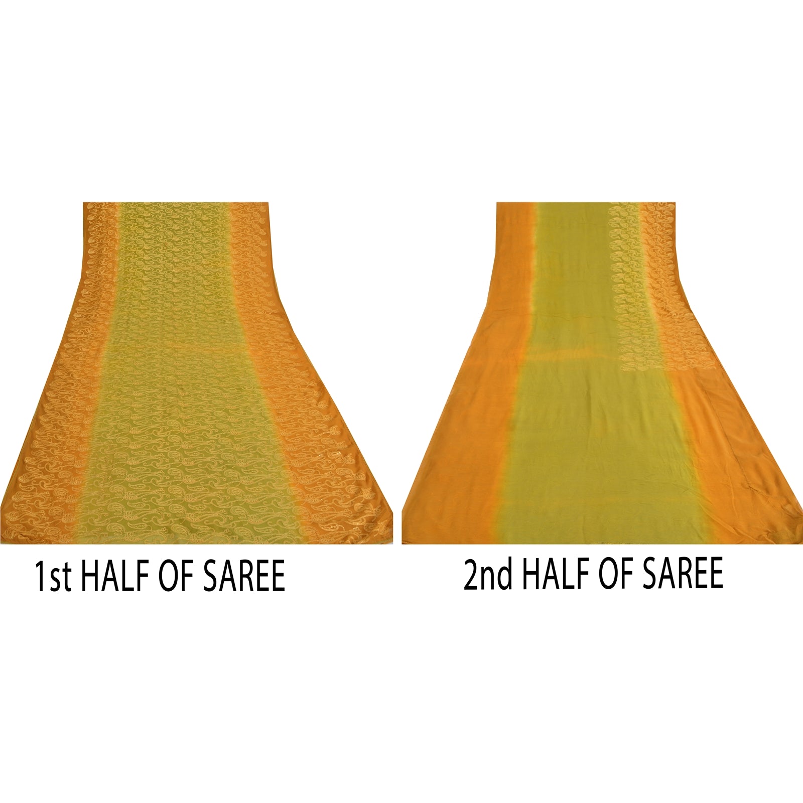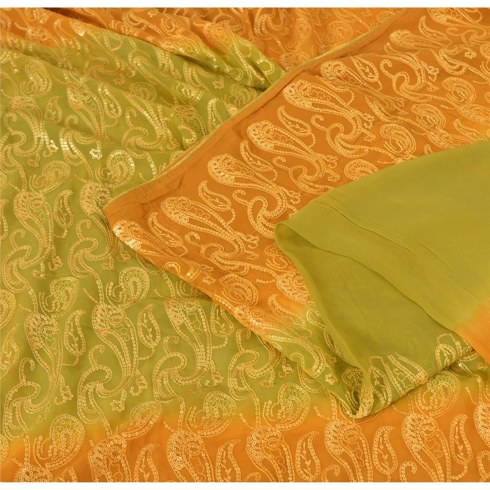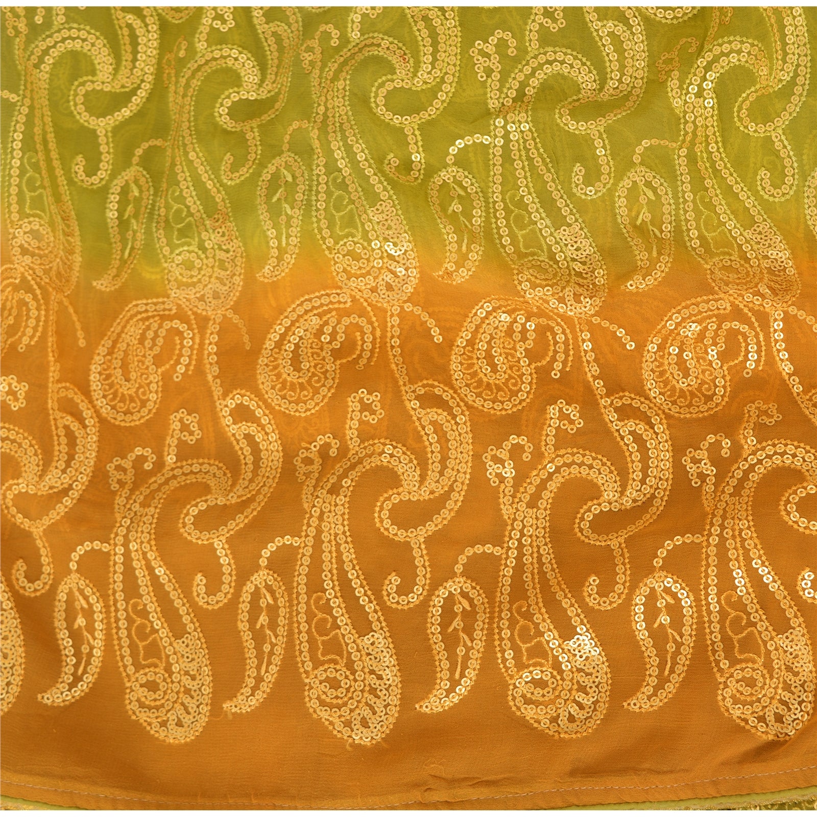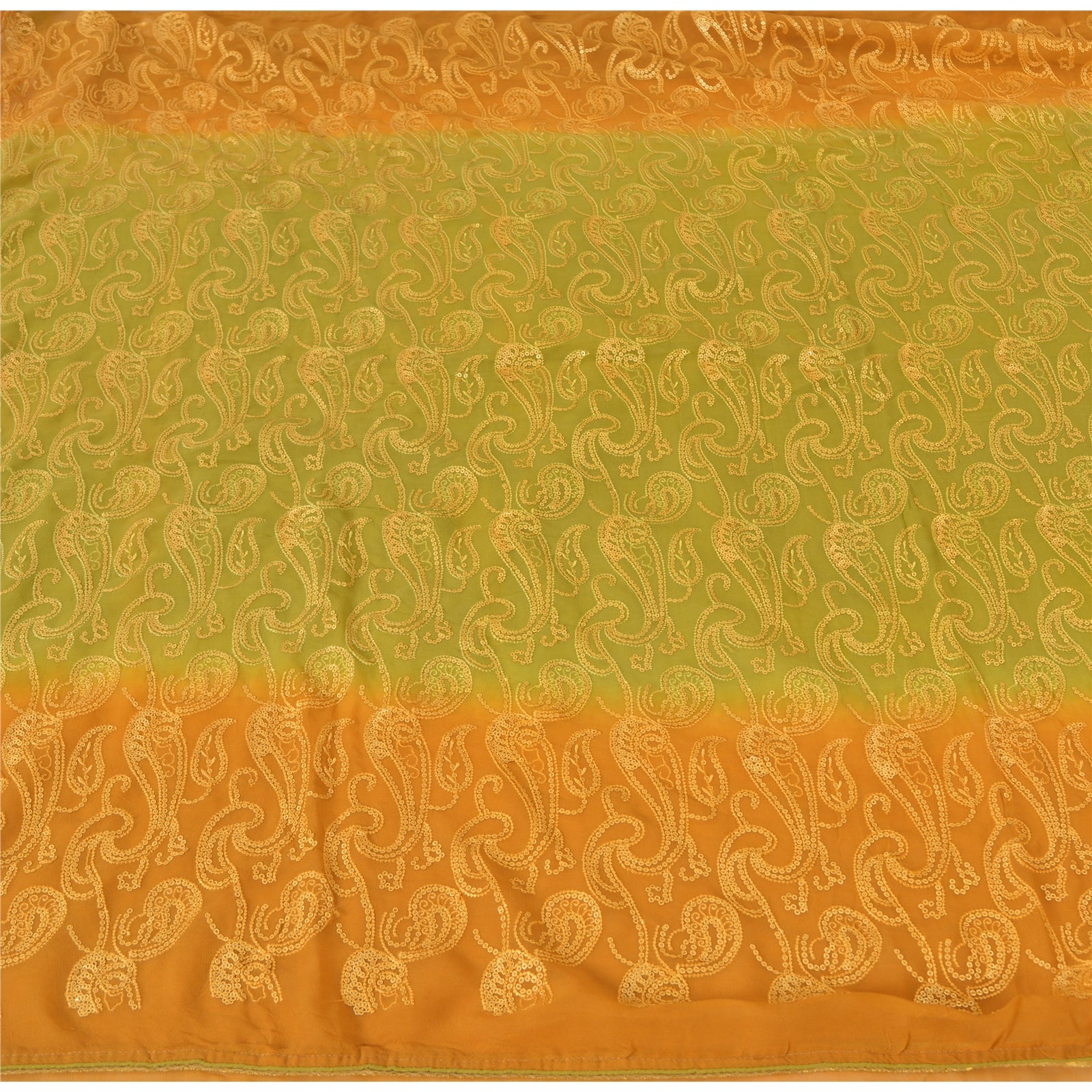 THE ITEM COLOR OR SHADE MAY BE DARKER OR LIGHTER THAN THE PICTURE.' An Awesome Sari In 100% Pure Georgette Silk Green & Mustard Colored Hand Embroidered Sari/Sustainable Fabric. Pallu & Border Features paisley design embellished with golden sequin work, golden zari work You Can See Center Portion Of Sari similar sequins work and hand embroidery With paisley Design. Saree has mild stain on it. This unique vintage saree can be used for various crafting ideas for example design a dress, use it as a throw, as window dressing, upholstery, table linen and much more. Let your creative juices flow and use this decorated Sustainable Fabric in multiple fashion. Shopping note: International buyers please note: Import duties, taxes, and charges are not included in the item price or postage cost. These charges are the buyer's responsibility. Please check with your country's customs office to determine what these additional costs will be prior to bidding or buying. Buyer will pay custom duty/tax. It is calculated and charged differently by every country. As a seller I do not have any control over it. VAT or sales tax is calculated by the platform at the time of checkout. Customs charge is payable at the time of delivery.