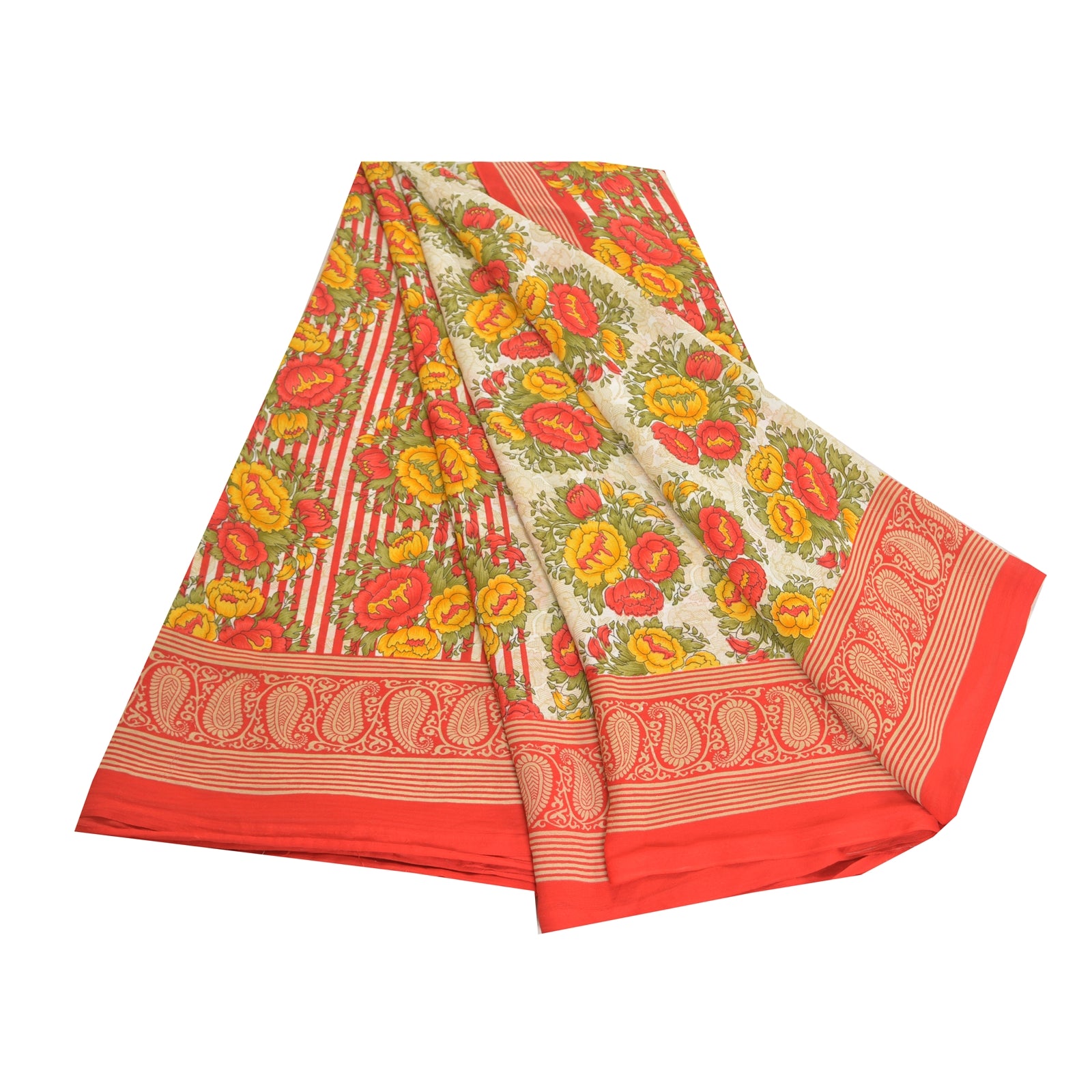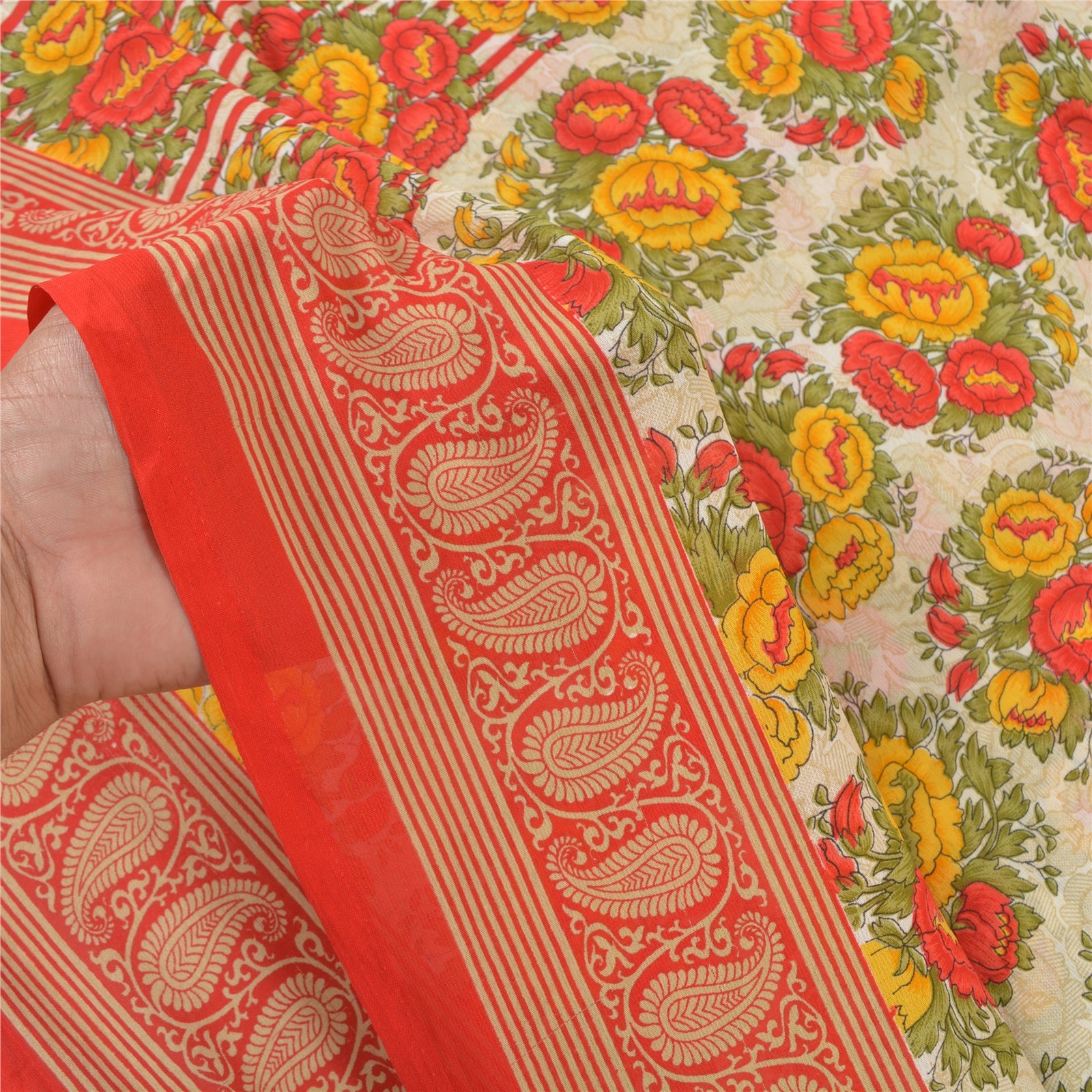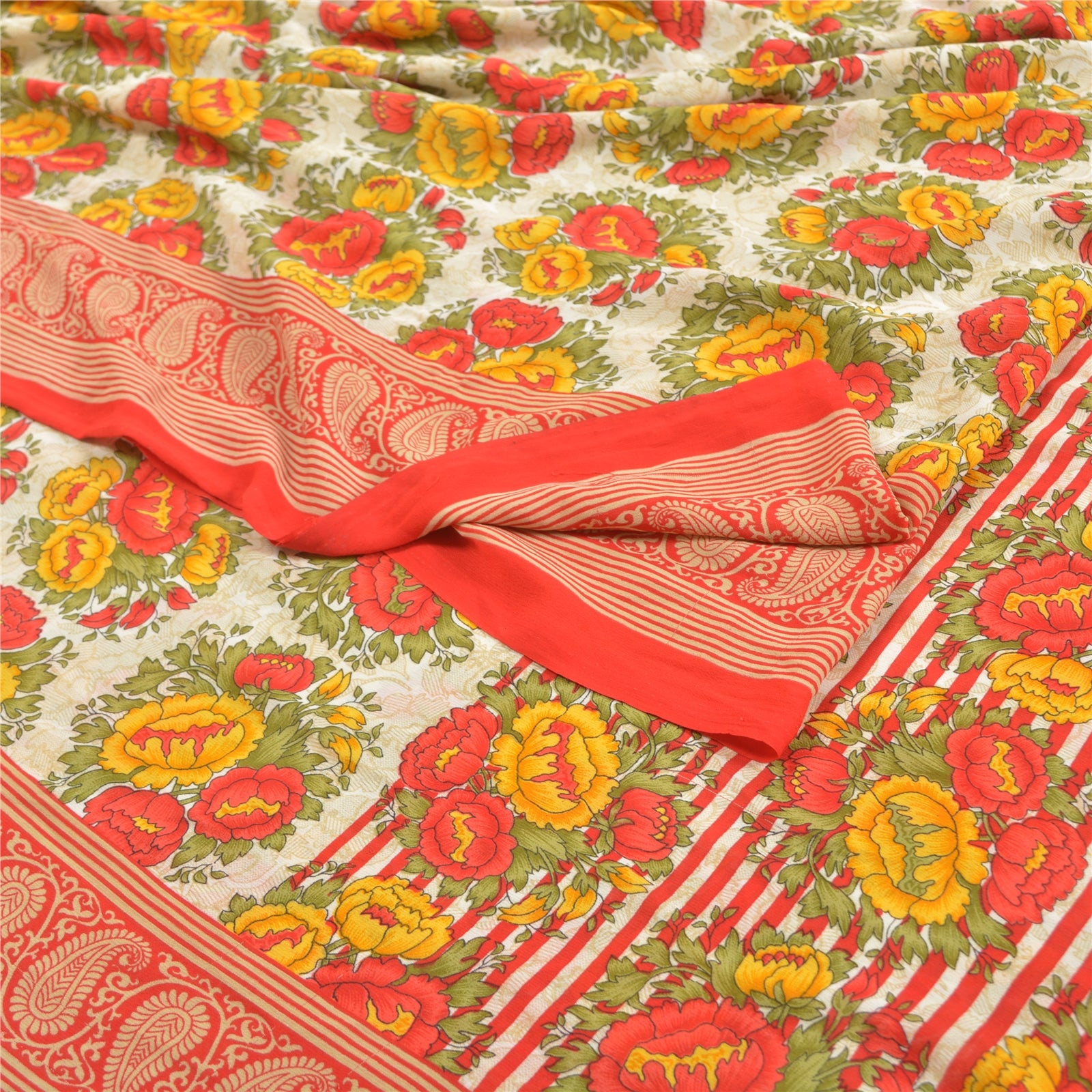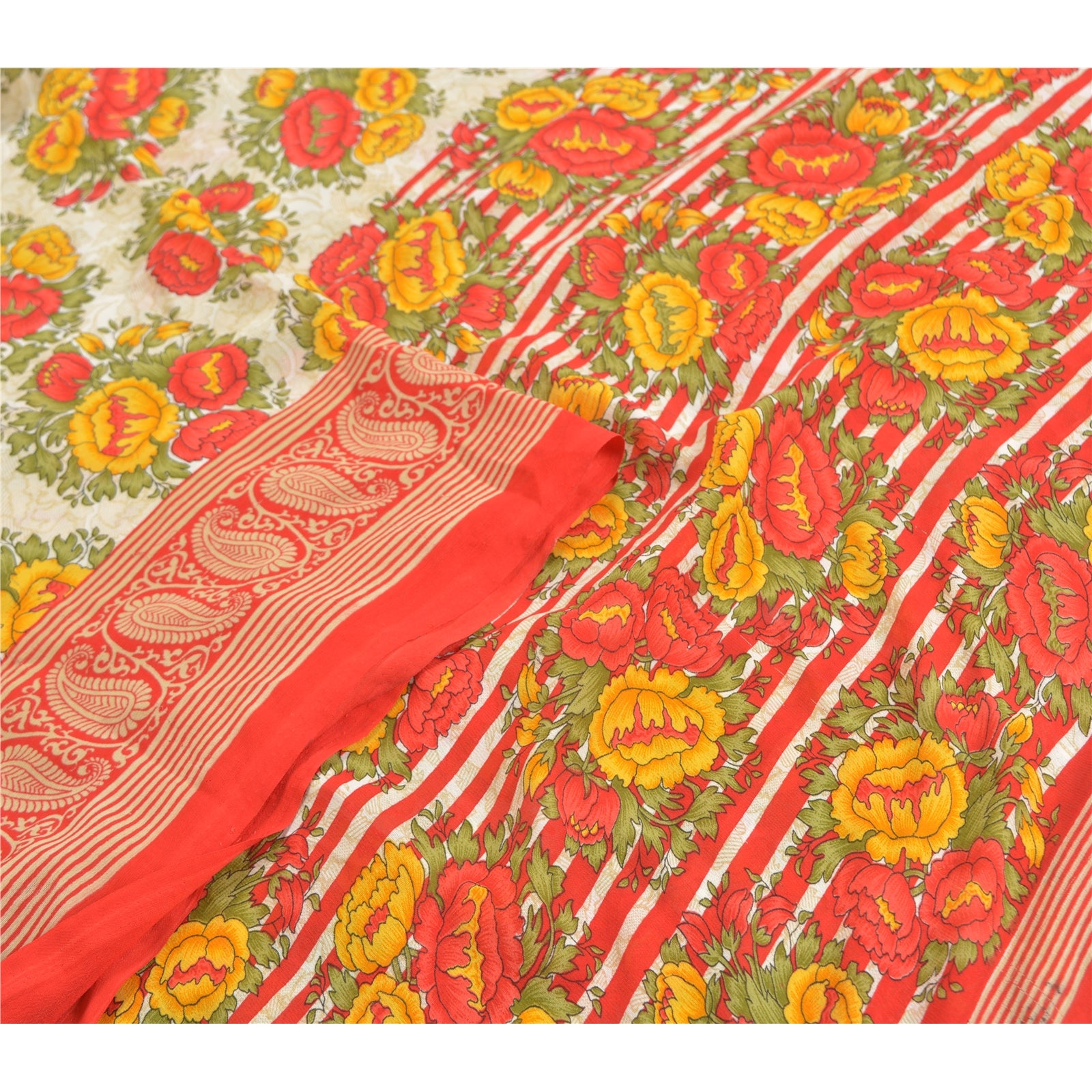 Beautiful ivory & red colored printed moss crepe saree. Pallu & Border has printed floral design. Floral design in center part of sari. What is special about this saree? Nice floral design with extremely smooth moss crepe base Sustainable Fabric is really enhancing the beauty of the saree. This unique vintage saree can be used for various crafting ideas even if you don't want to use it as a sari. Design a dress, use it as a throw, as window dressing, upholstery, sarongs, table linen and much more. Let your creative juices flow and use this decorated Sustainable Fabric in multiple fashion. Please note - Buyers from Australia are required to pay postage. Registered air mail to Australia is temporarily suspended due to the pandemic. Once it goes back to normal we'll revert to free shipping. For now, we are using Aramex and DHL to ship orders. These services are expensive but faster compared to regular mail. Thank you for your support. If you are buying in bulk we will refund whatever excess is left. Contact us after that purchase. For USA buyers - Single item ships via registered air mail, buy 1 more to get FedEx.