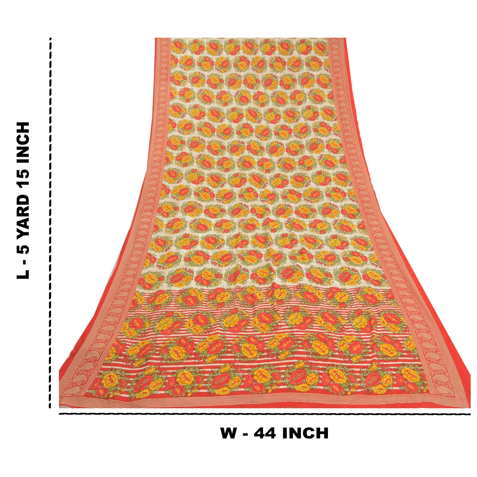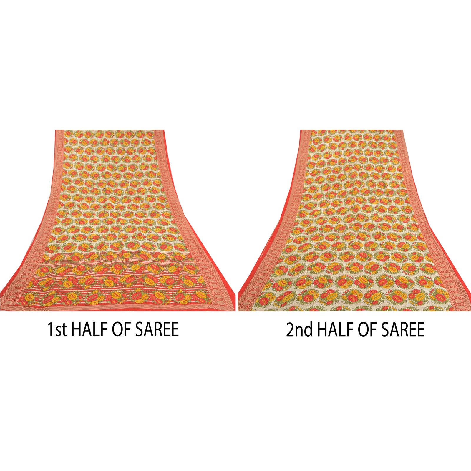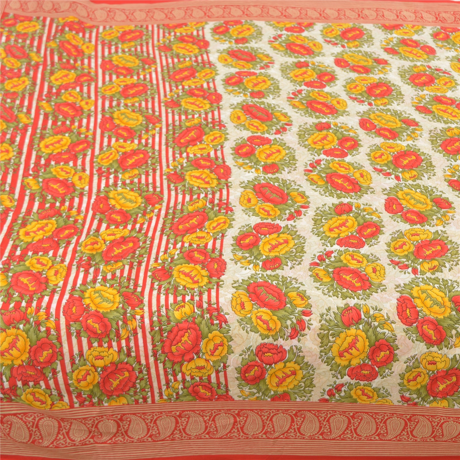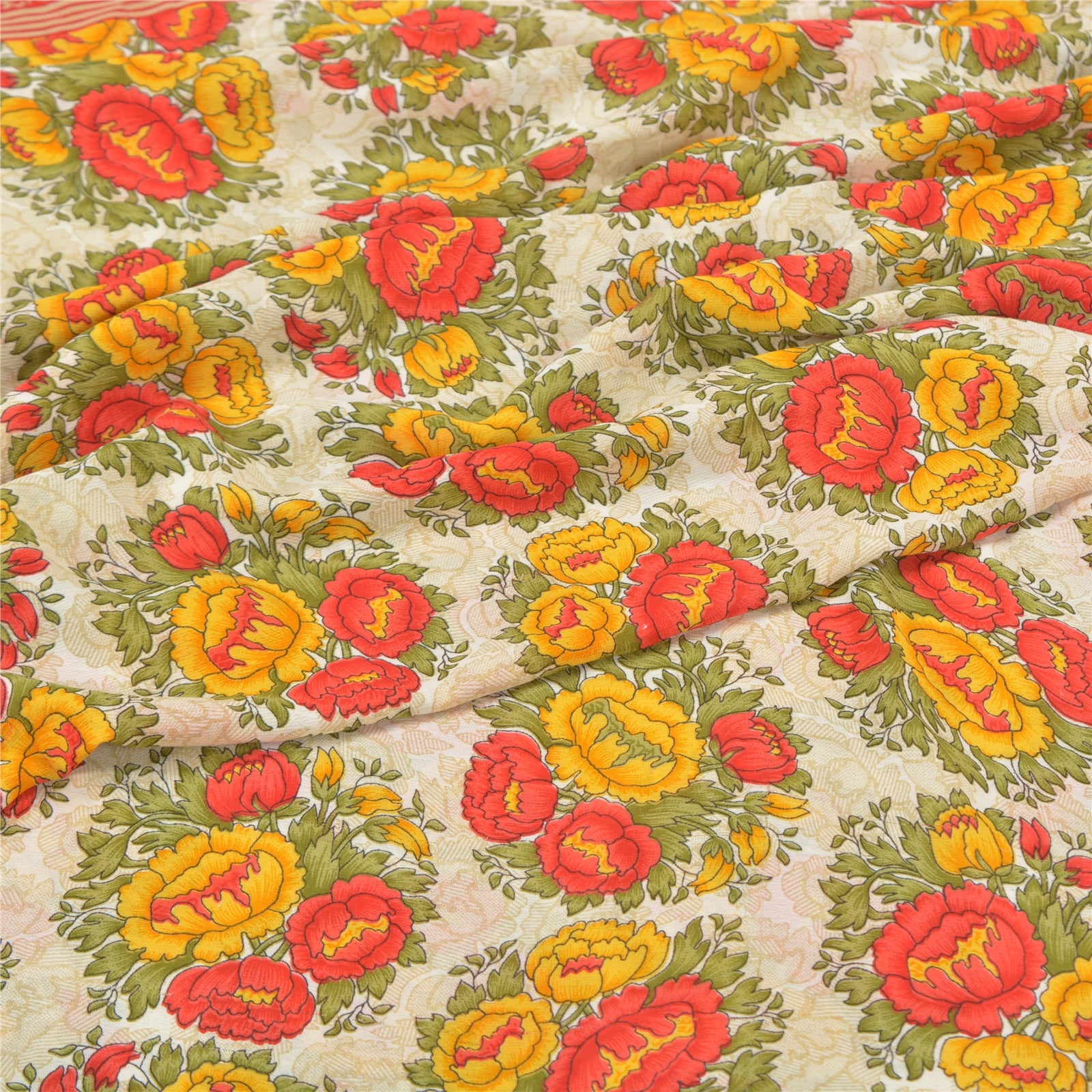 Beautiful ivory & red colored printed moss crepe saree. Pallu & Border has printed floral design. Floral design in center part of sari. What is special about this saree? Nice floral design with extremely smooth moss crepe base Sustainable Fabric is really enhancing the beauty of the saree. This unique vintage saree can be used for various crafting ideas even if you don't want to use it as a sari. Design a dress, use it as a throw, as window dressing, upholstery, sarongs, table linen and much more. Let your creative juices flow and use this decorated Sustainable Fabric in multiple fashion. Please note - Buyers from Australia are required to pay postage. Registered air mail to Australia is temporarily suspended due to the pandemic. Once it goes back to normal we'll revert to free shipping. For now, we are using Aramex and DHL to ship orders. These services are expensive but faster compared to regular mail. Thank you for your support. If you are buying in bulk we will refund whatever excess is left. Contact us after that purchase. For USA buyers - Single item ships via registered air mail, buy 1 more to get FedEx.